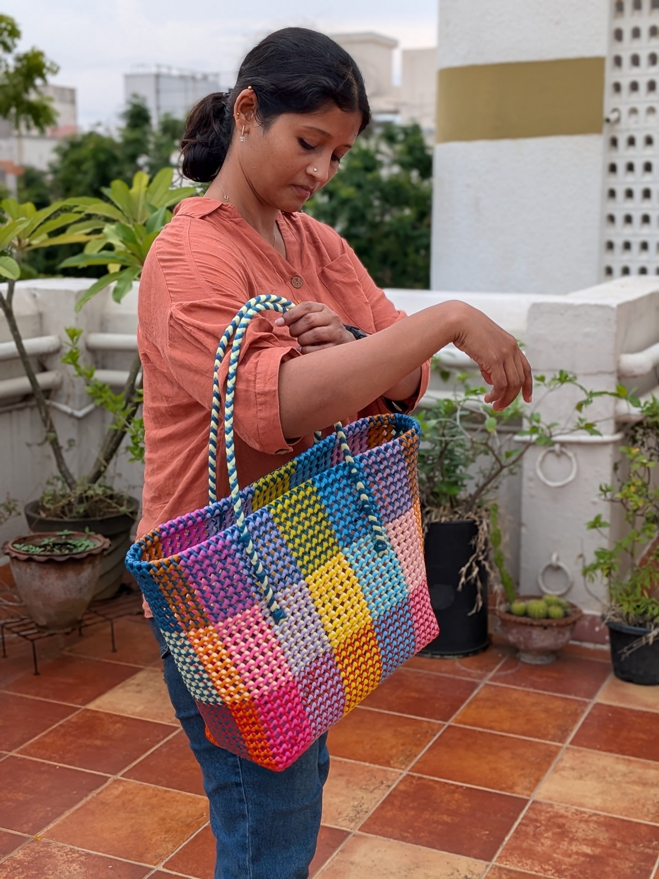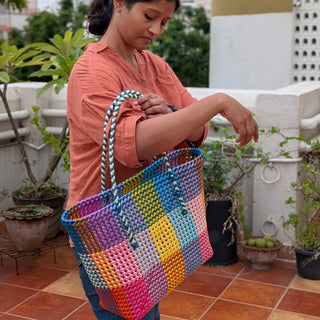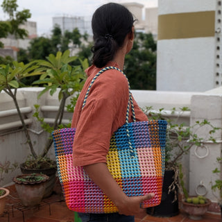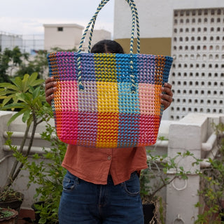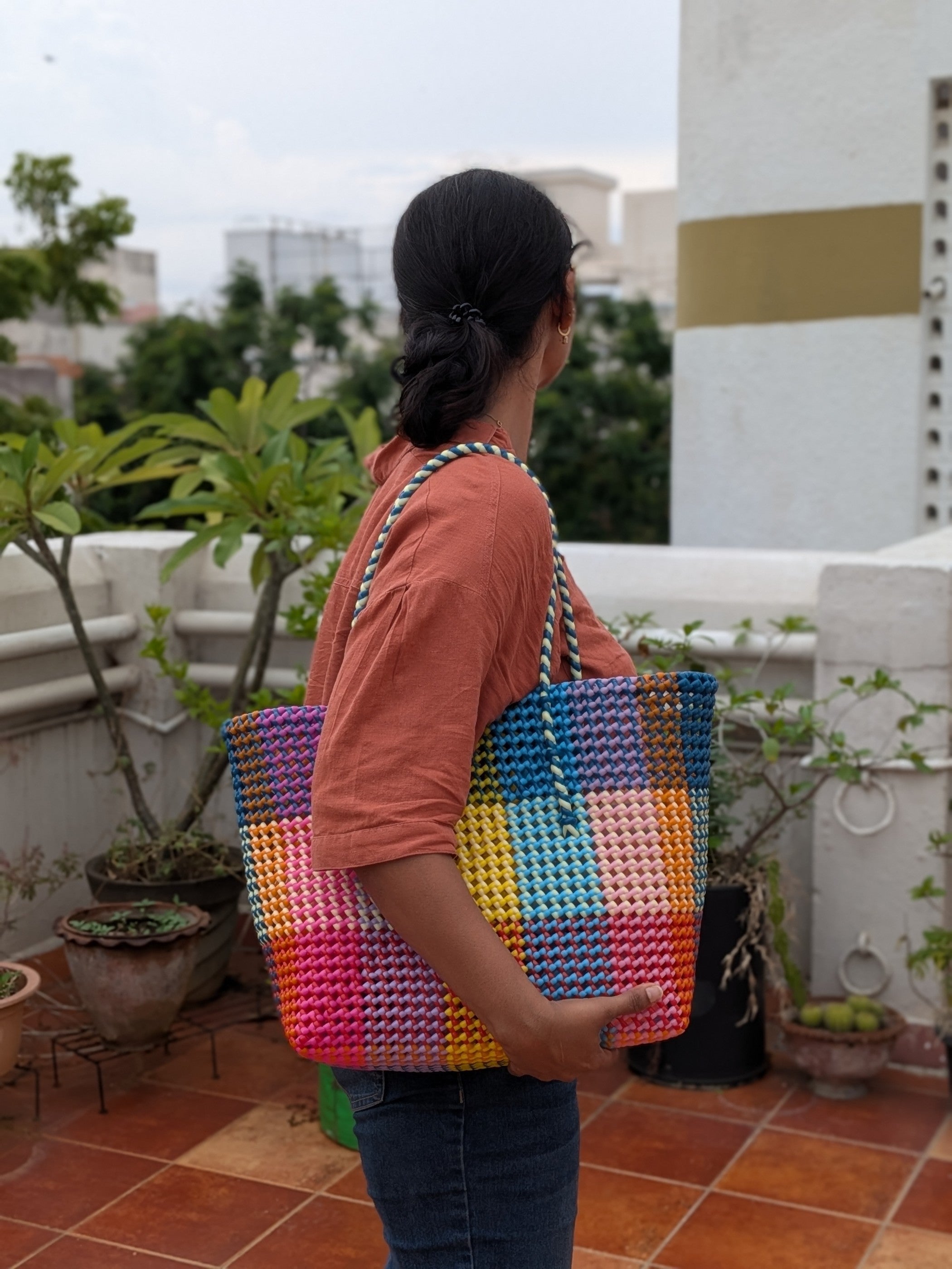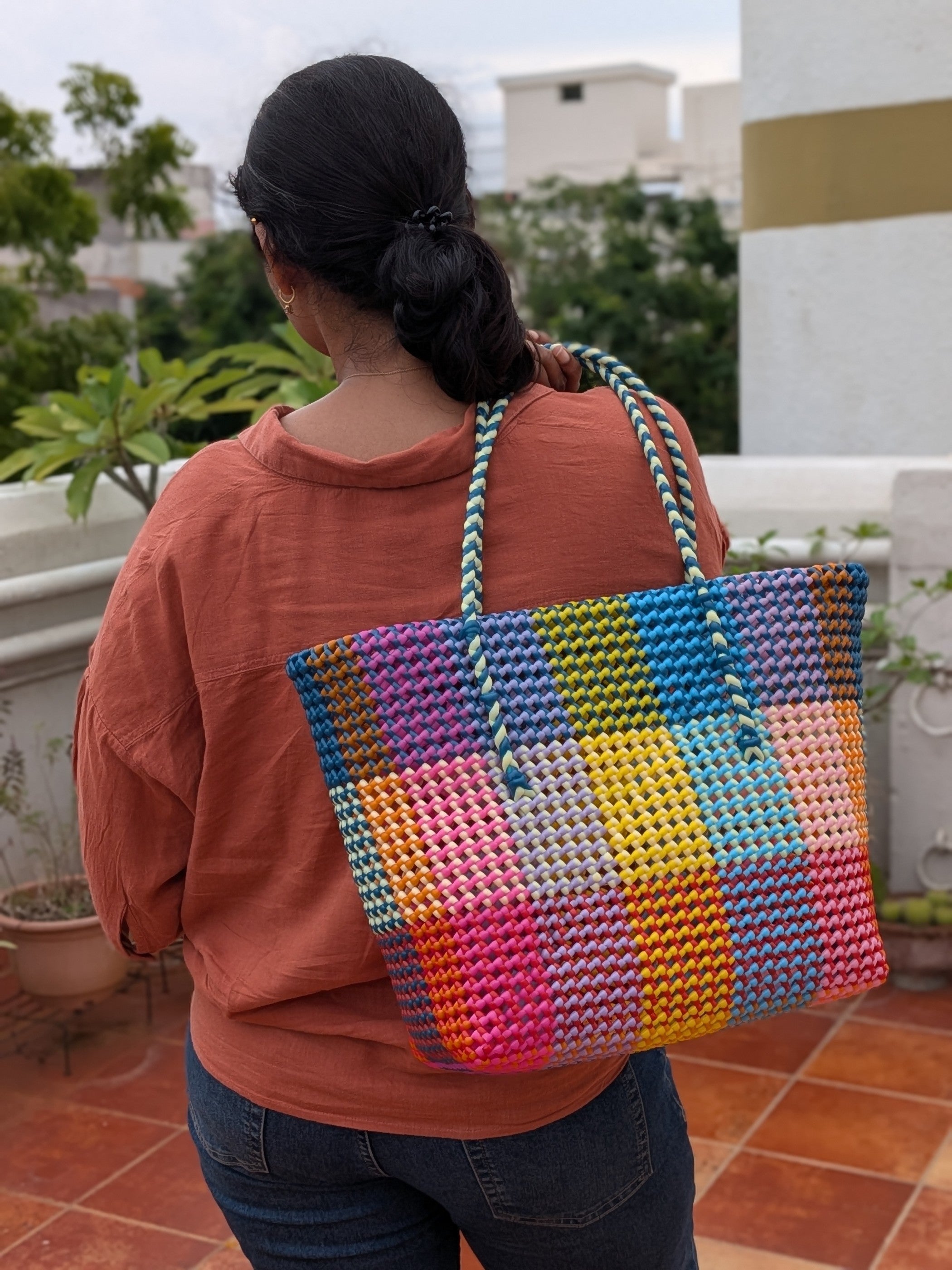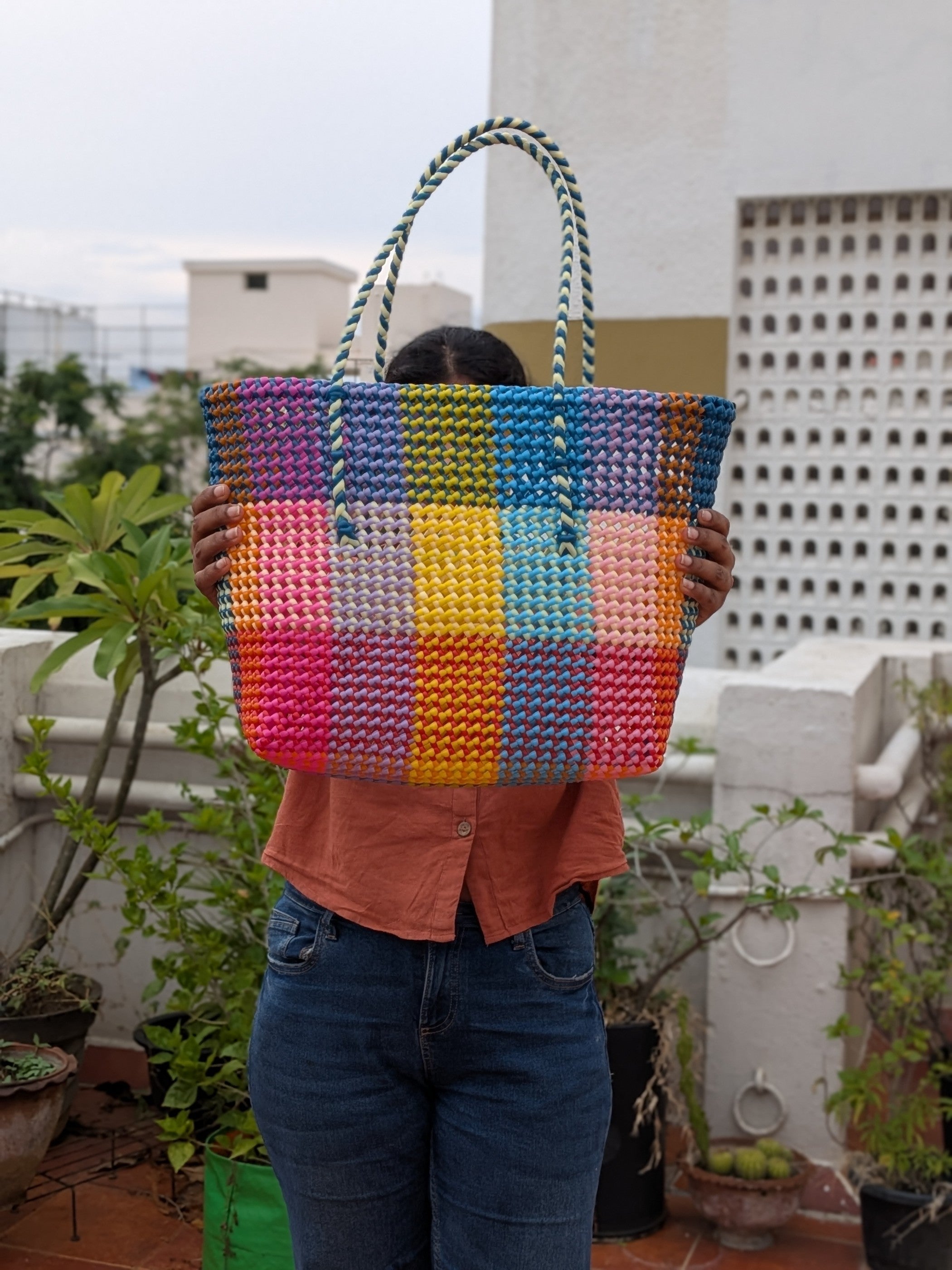 Our most requested, recreated multicolour koodai is here. Nostalgic, colourful and can instantly take you down the memory lane. These are perfect for a trip to the beach, you can carry a picnic or to work. Just dump everything because these are very sturdy. These are flat based koodais with 4.7inch base, 12 inches tall and base length of 12 inches. Mind you, koodais are always expandable.