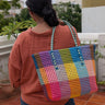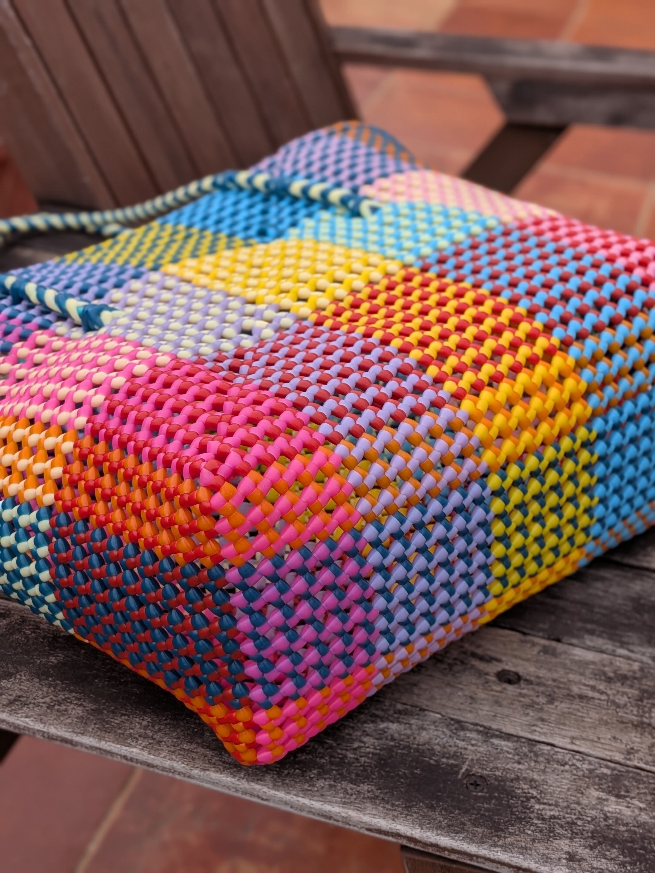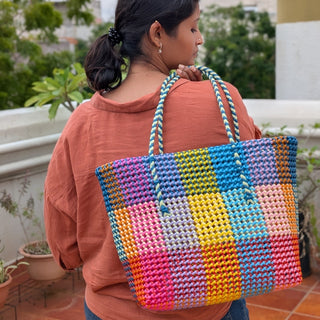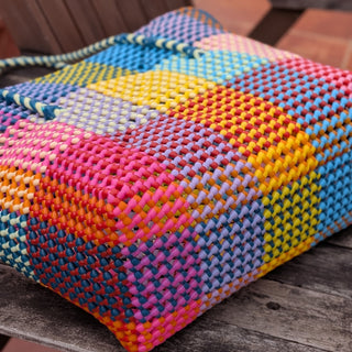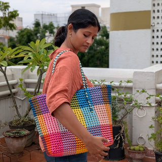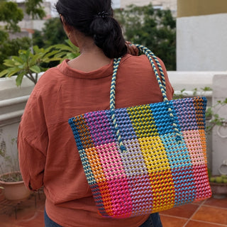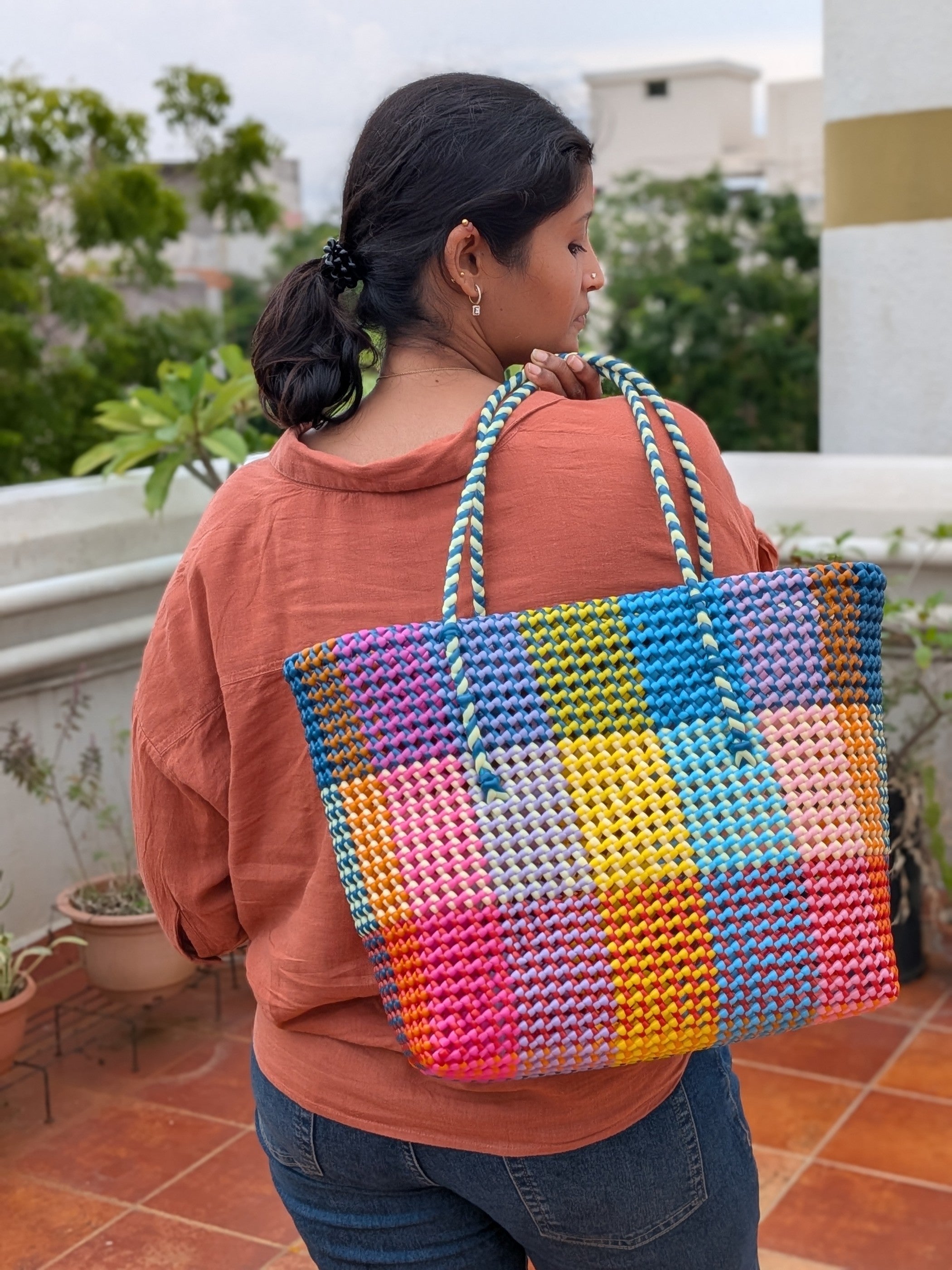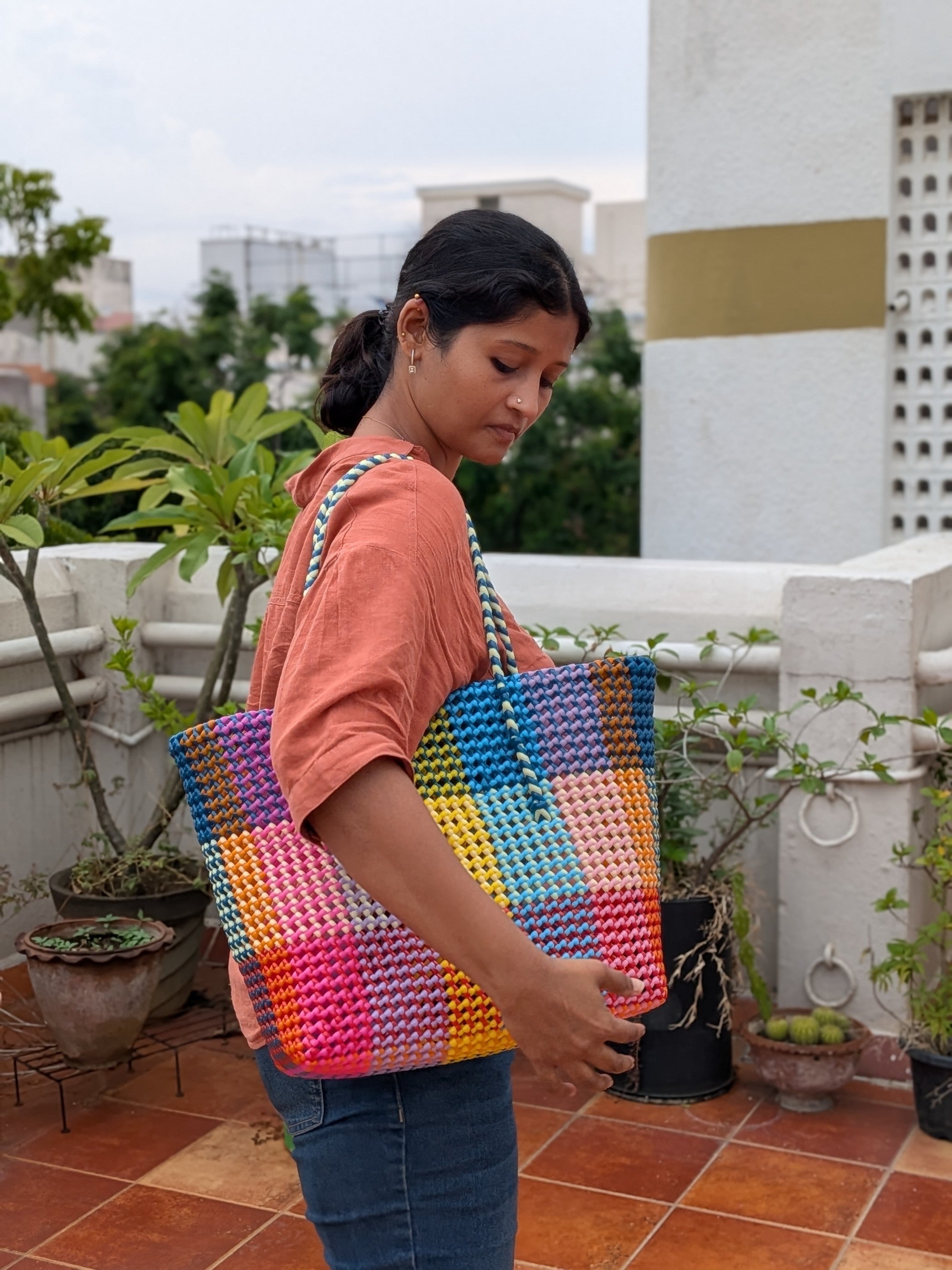 Our most requested, recreated multicolour koodai is here. Nostalgic, colourful and can instantly take you down the memory lane. These are perfect for a trip to the beach, you can carry a picnic or to work. Just dump everything because these are very sturdy. These are flat based koodais with 4.7inch base, 12 inches tall and base length of 12 inches. Mind you, koodais are always expandable.