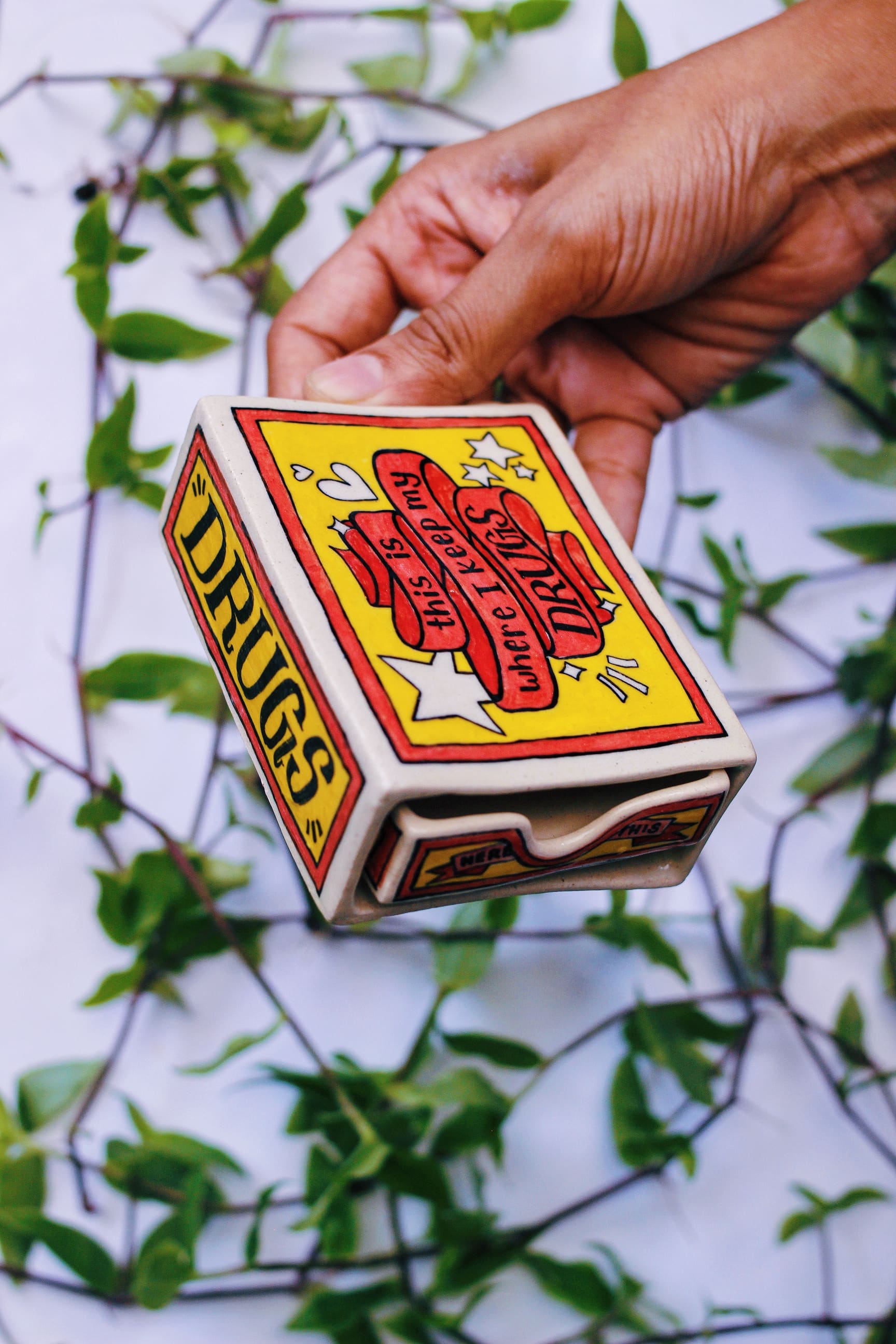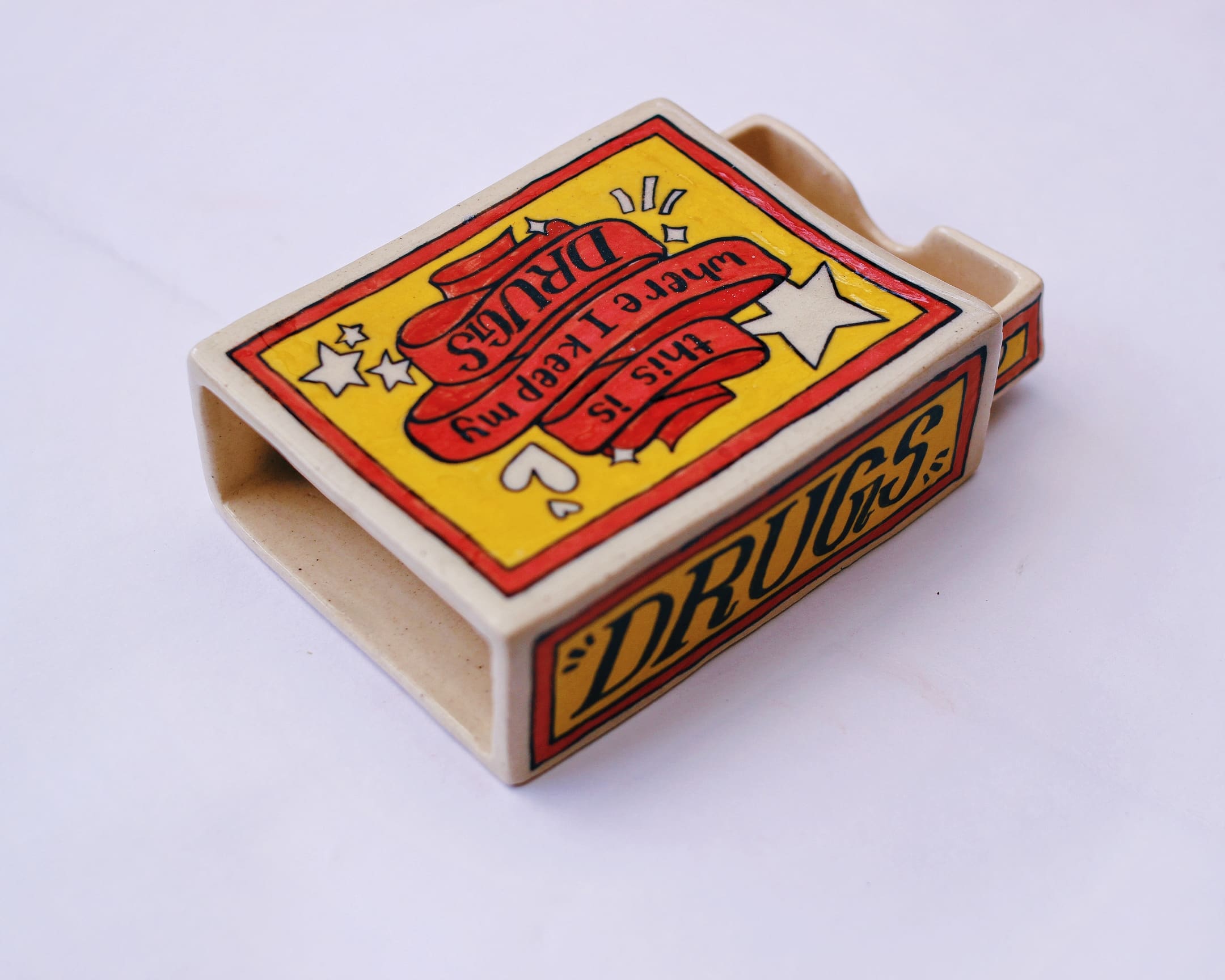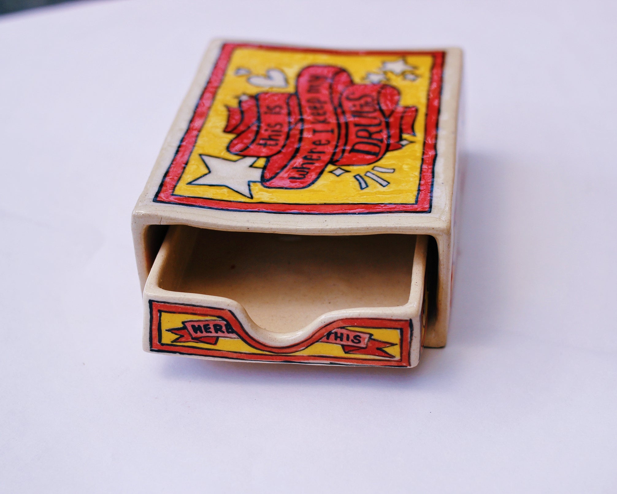 Crafted with a smooth pull-out drawer, it's perfect for stashing your secrets or completely legal ashes with a not-so-subtle sense of humor.
