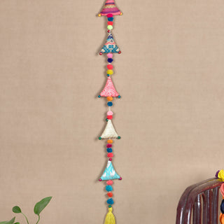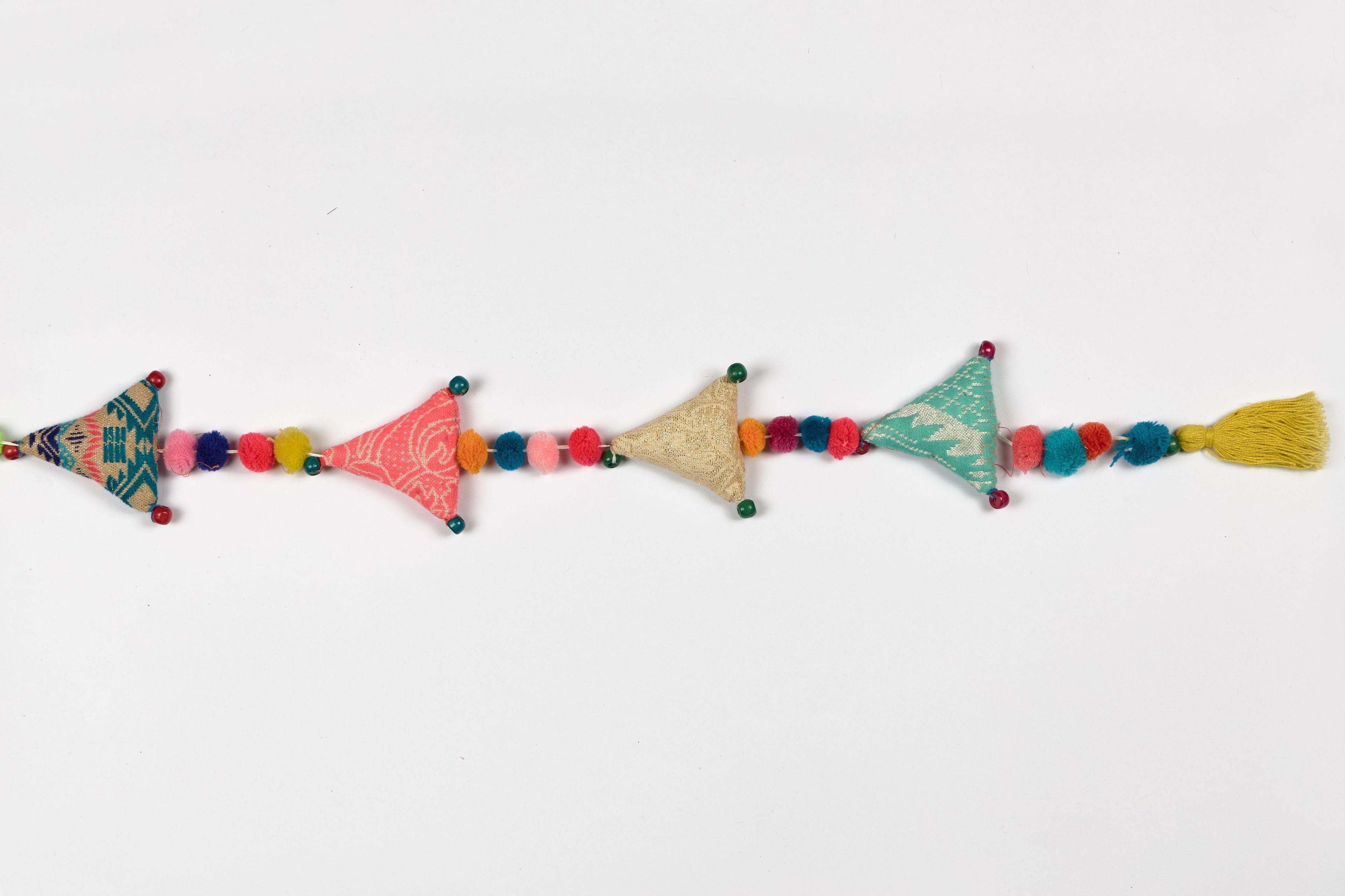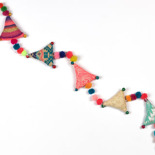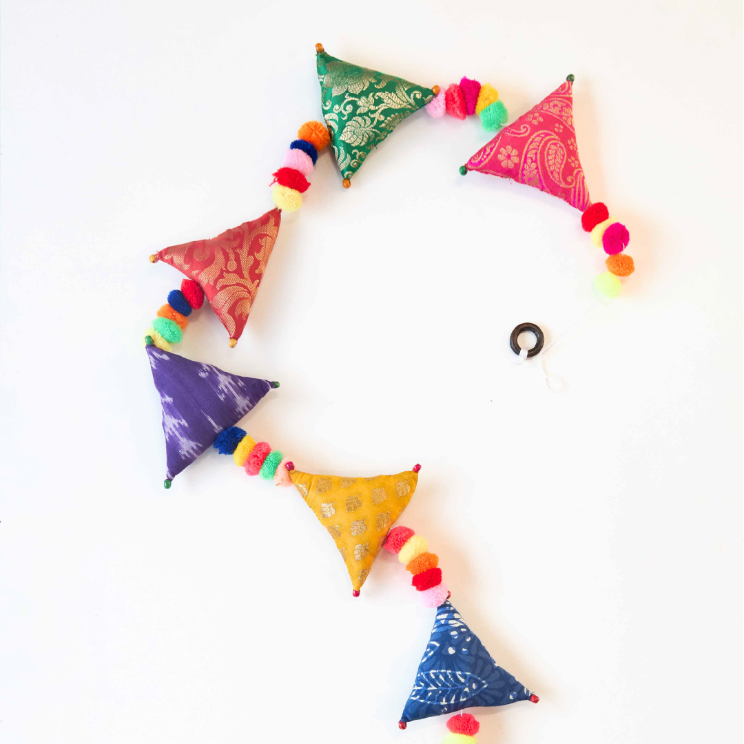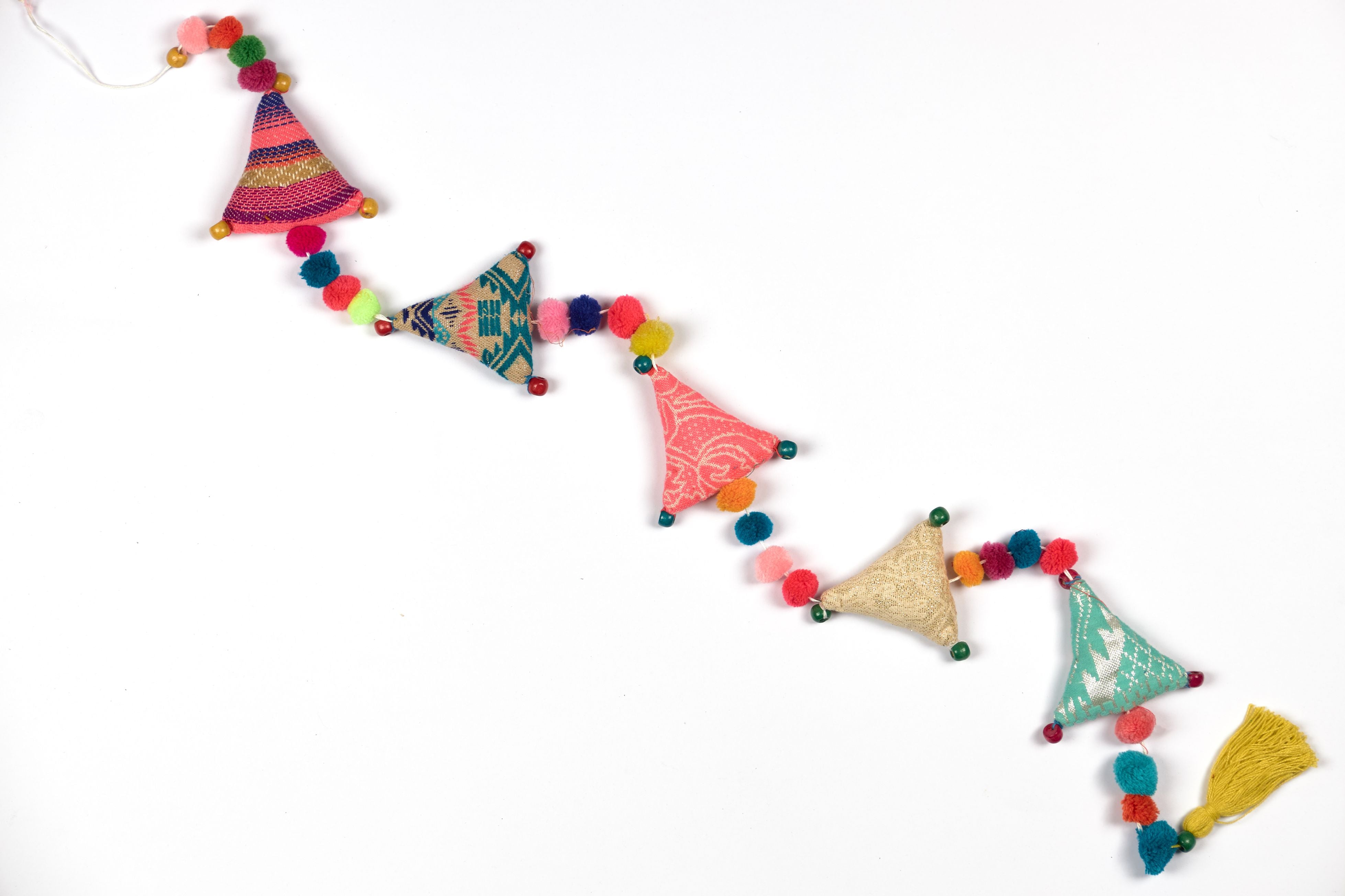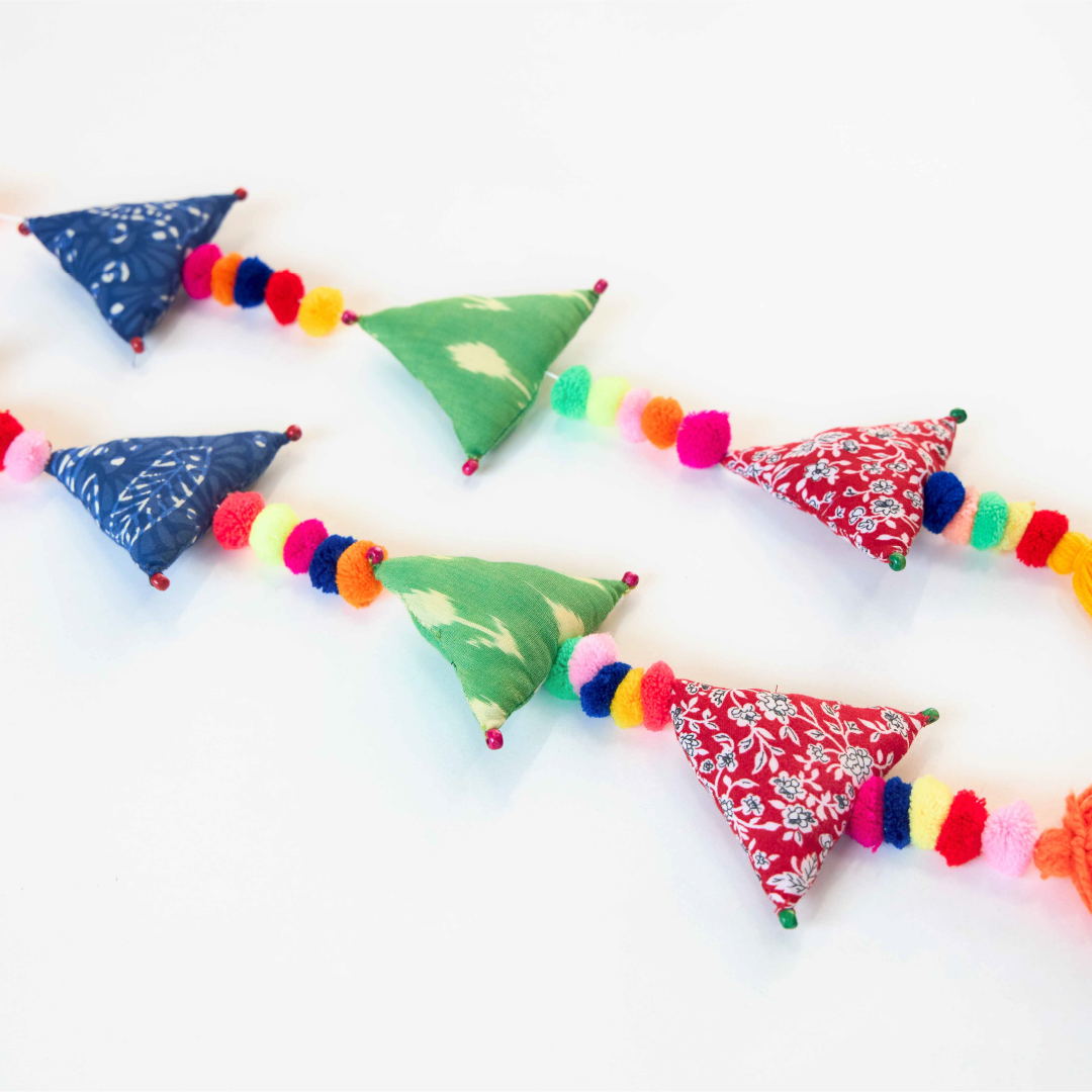 Introducing our Upcycled Boho Triangle Festive Decoration String, the perfect choice for eco-conscious celebrations. Handcrafted with handmade pom poms and wooden beads, these sustainable and reusable decorations add a whimsical touch to your festivities. This Strings not only add a festive touch to your Festive decorations but also offers a sustainable and reusable alternative to balloons, all while being completely plastic-free.