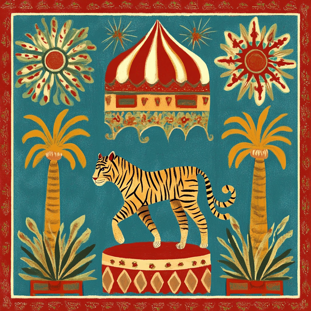 Not all prophets walk on two legs. This majestic tiger, draped in ancient wisdom and grace, walks the sacred circle each night. With each silent step upon the velvet pedestal, it carries the weight of unspoken fates. Some say, if you meet its gaze, you’ll dream the future.