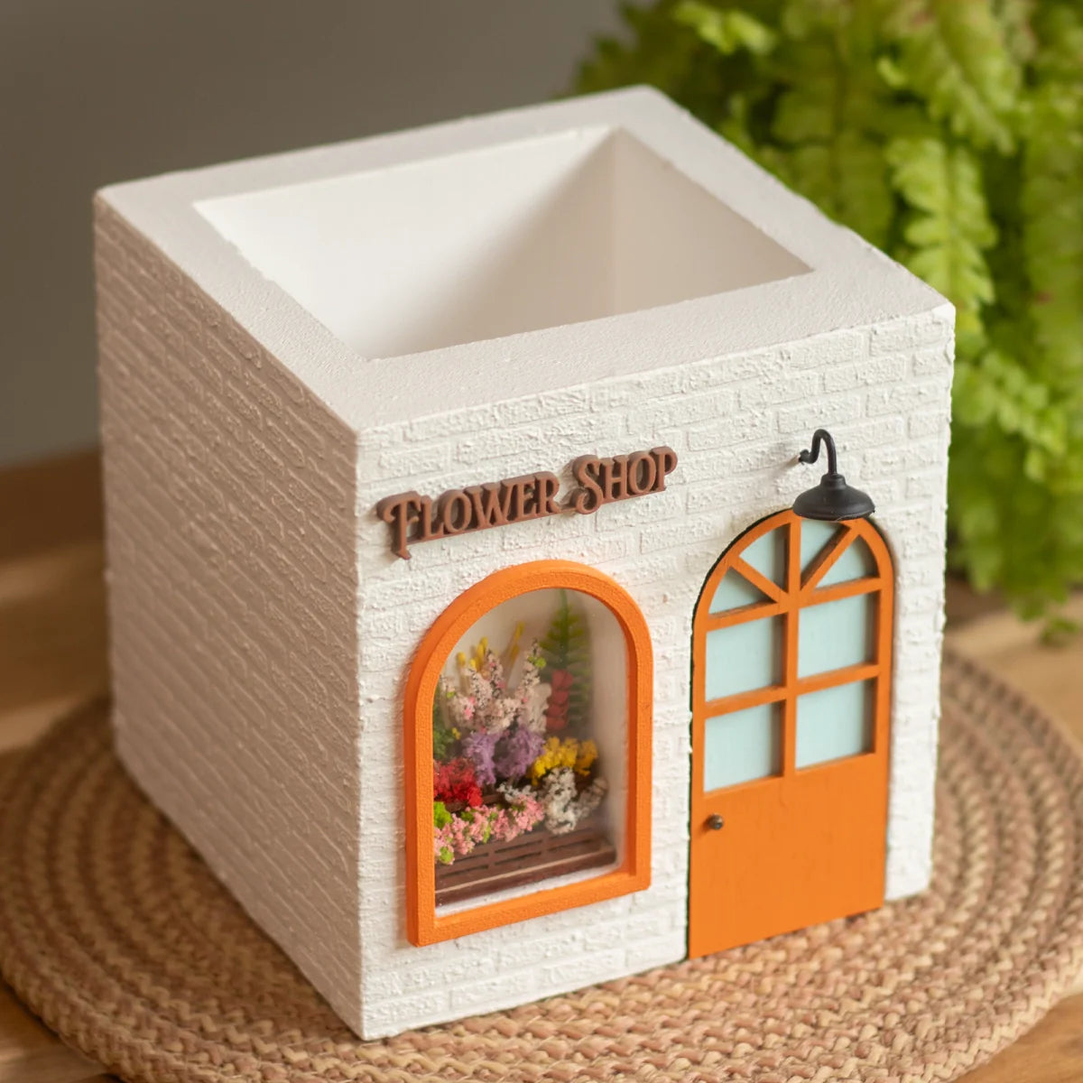 Turn your shelf into a blooming street corner with our Flower Shop Planter. Inspired by the charm of tiny storefronts, this handcrafted planter captures the essence of a cozy flower shop, complete with miniature detailing and a space to house your favorite greens or succulents.