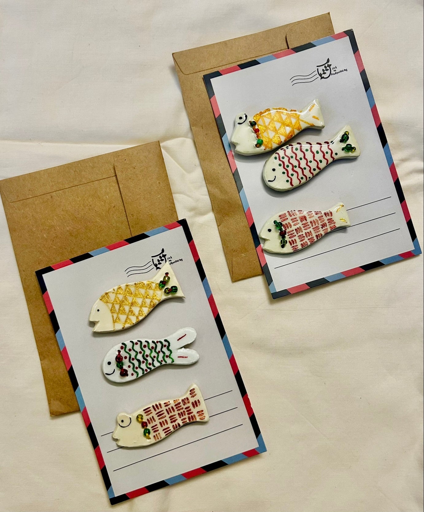 Set of 3 handmade fish magnets crafted from air-dry clay. Each piece is hand-painted, detailed with embroidery and beads, and sealed for durability. No two are alike, each carries small, intentional irregularities that mark its handmade charm. Perfect for adding a touch of whimsy and nostalgia to your fridge or workspace.
