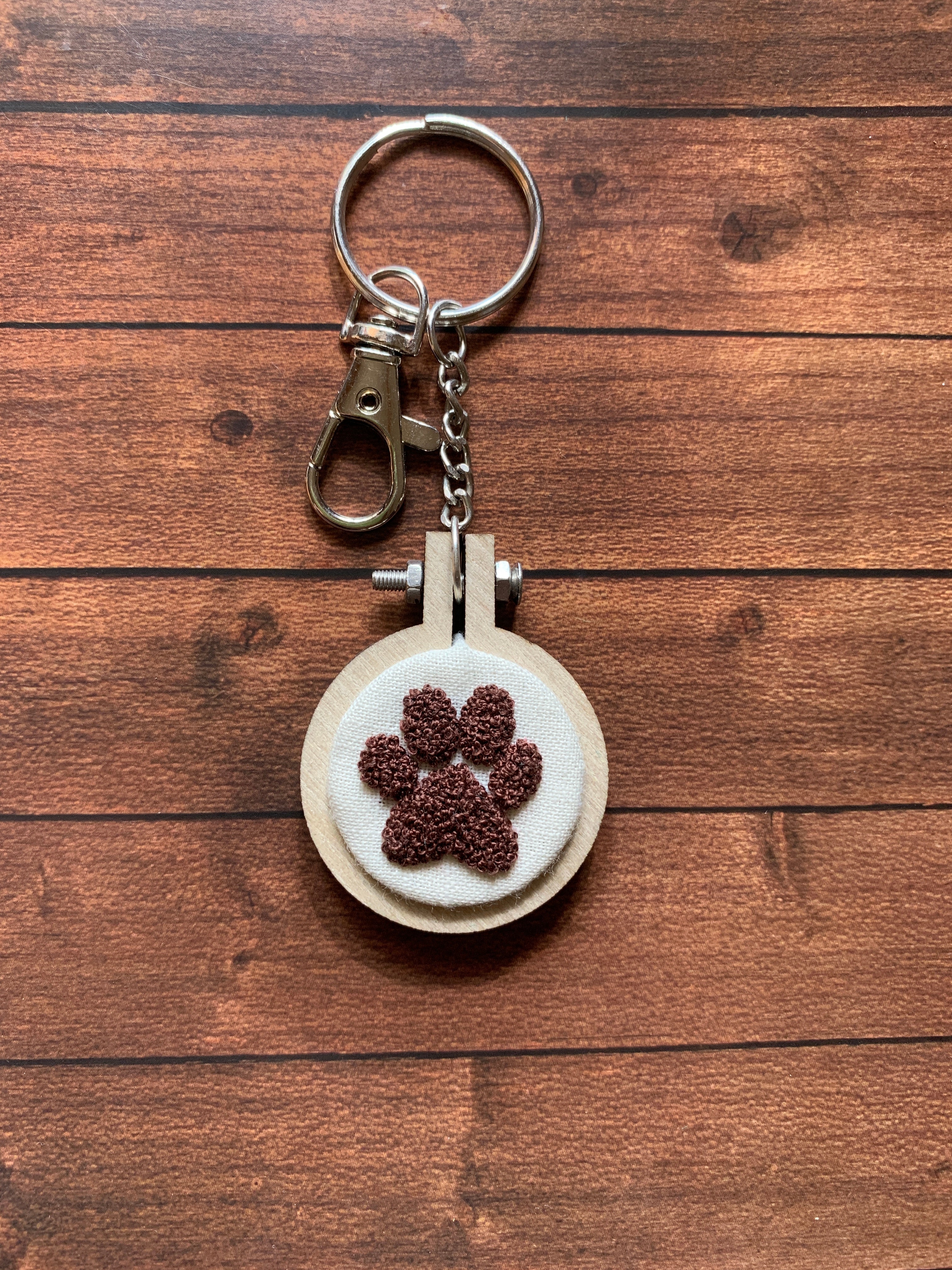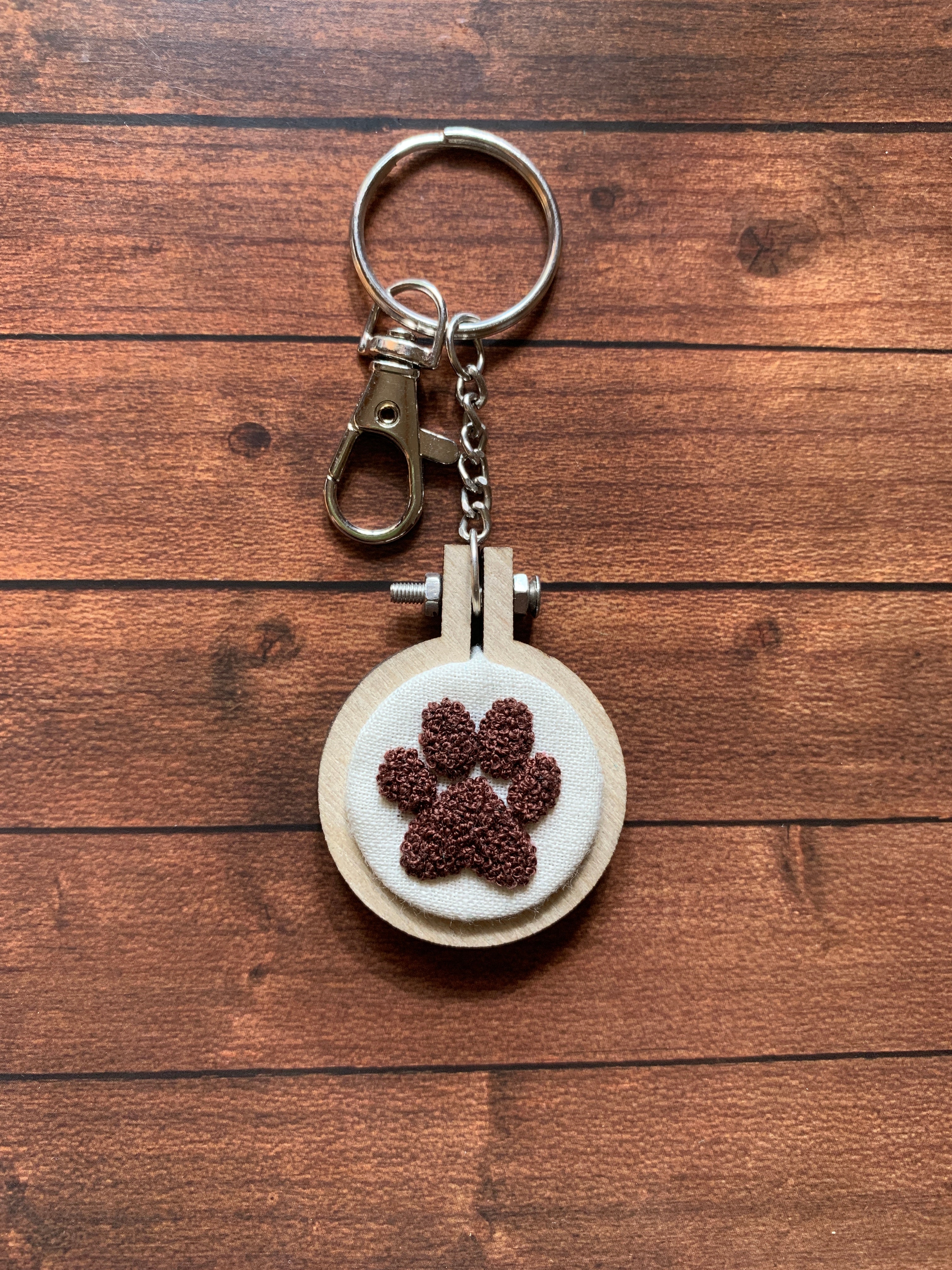 Furry paw intricately hand embroidered on a 4 cm Mini Hoop.