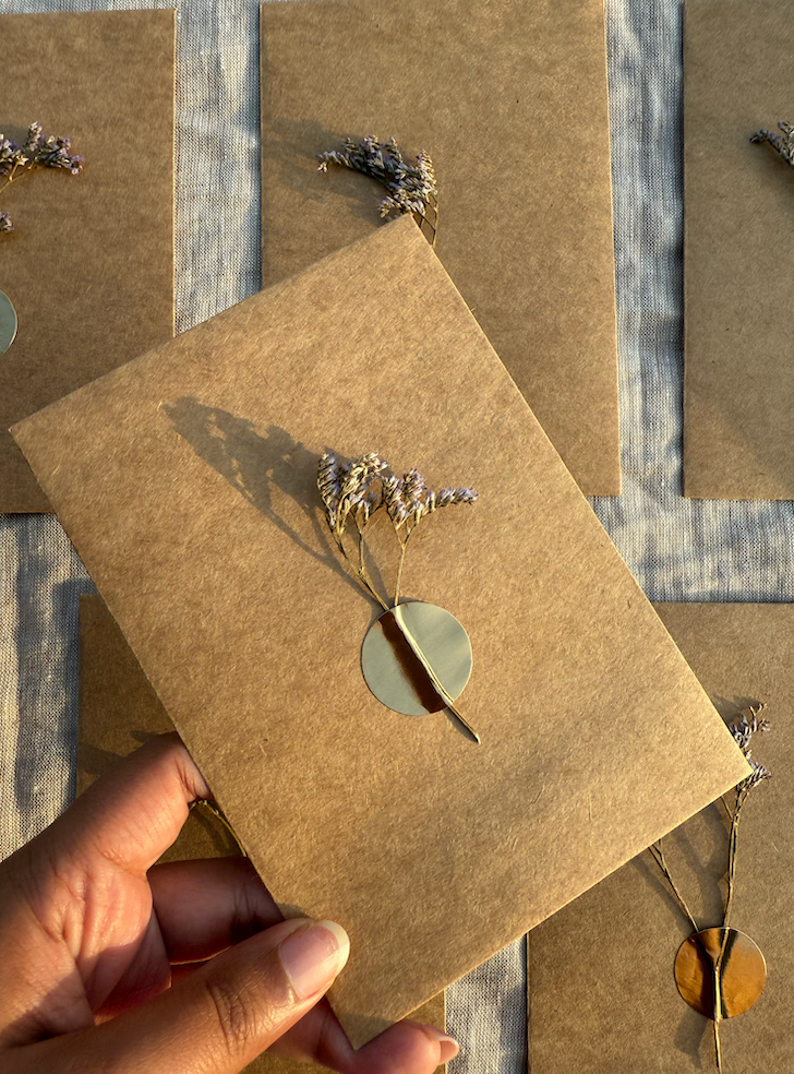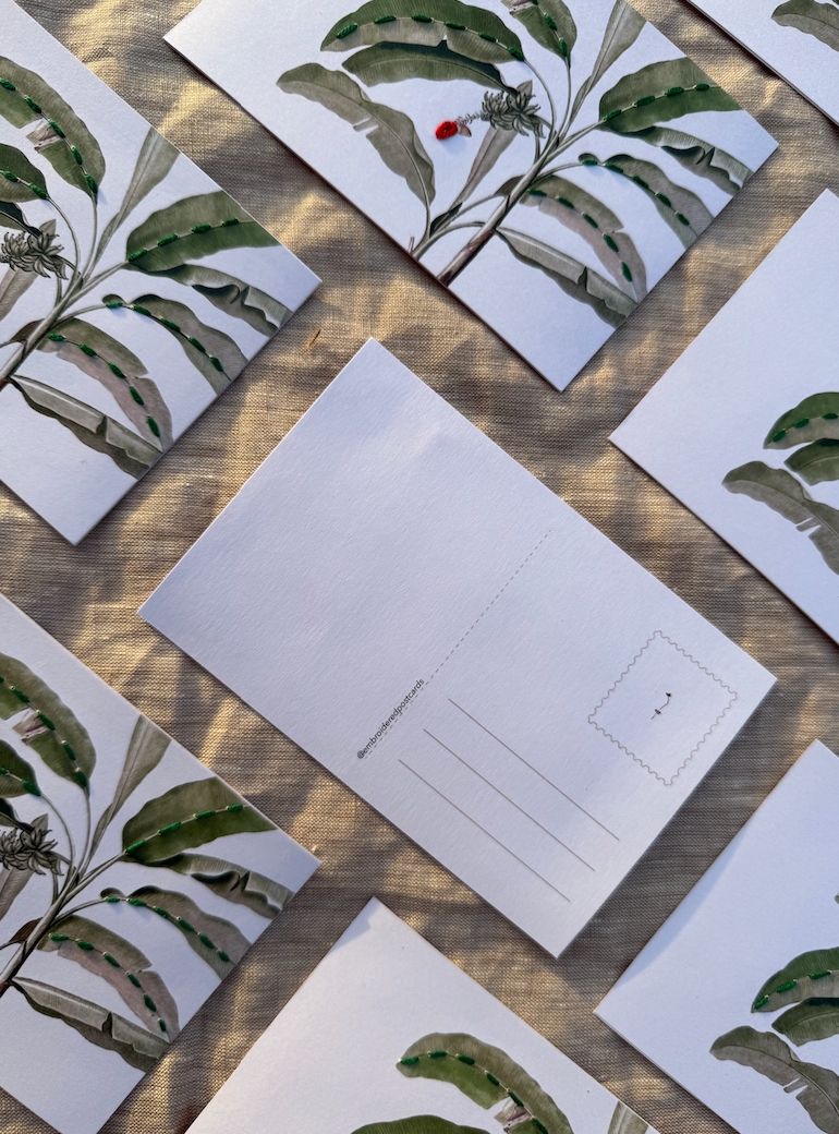 Each postcard is completely hand-crafted and hand-embroidered. Take time to feel the embroidery on paper and smell the threads for they are infused with fragrance of the flora-- take a sensory deep dive.