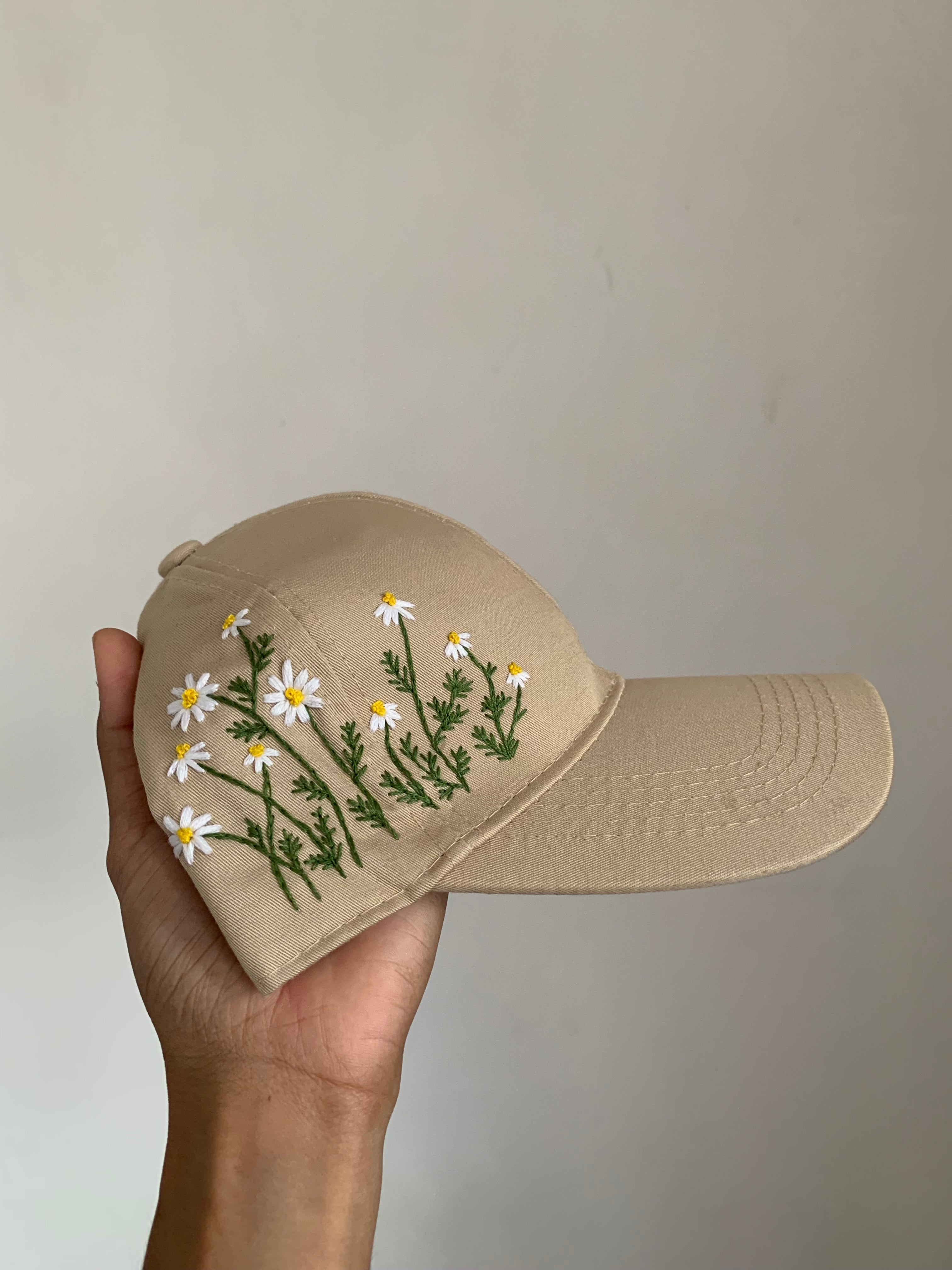 Soft daisies bloom along the side of this earthy beige cap, perfect for romantic walks and sunny thoughts.