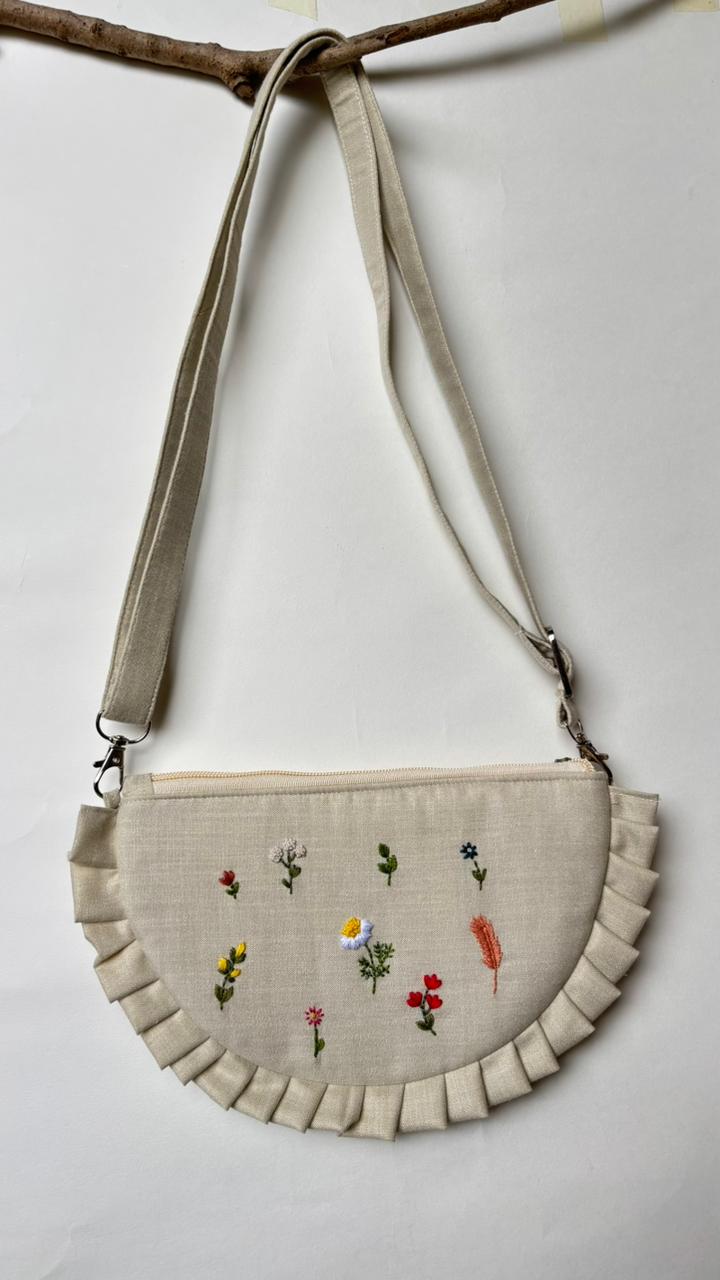 Step into timeless elegance with this hand-embroidered detachable sling bag cum pouch, crafted from pure linen-cotton fabric. The soft beige base is adorned with delicate, hand-stitched wildflowers in vibrant hues — each petal and stem celebrating the art of fine embroidery and slow fashion.