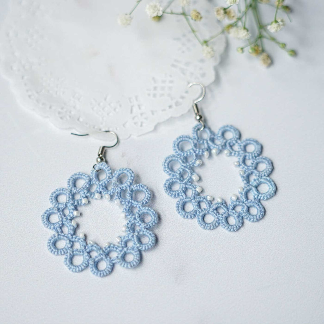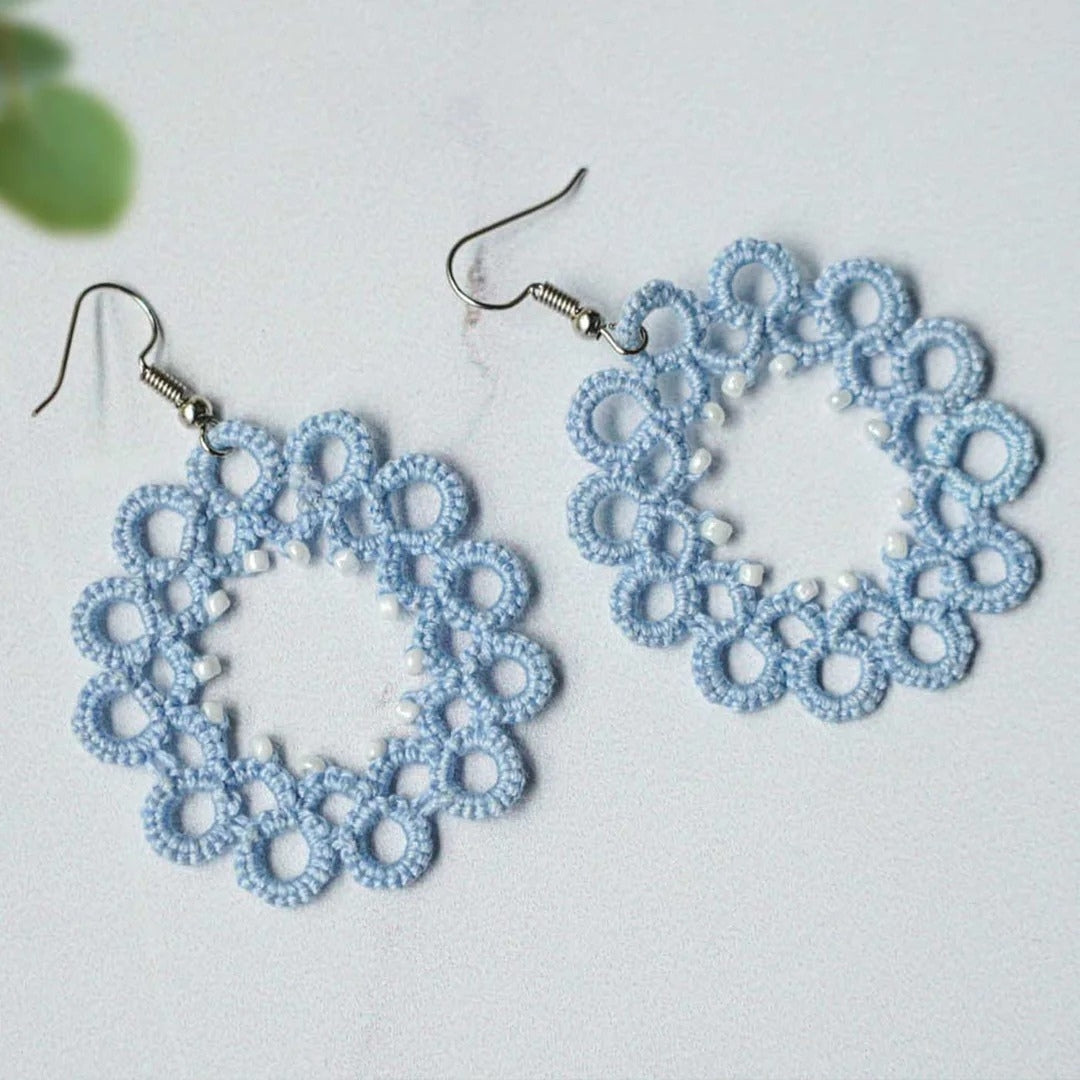 Beautifully crafted with cotton thread and beads using the age-old technique of tatting, these earrings feature intricate lacework created knot by knot with shuttle tatting. Handmade with great care, each pair is exclusively crafted using this traditional method. These super cool, extremely lightweight earrings are versatile enough to complement any attire, ensuring you can wear them all day with ease. As artisanal items entirely made and decorated by hand, small imperfections denote the originality of the product. So, hop on board and add a touch of artisanal charm to your ensemble!