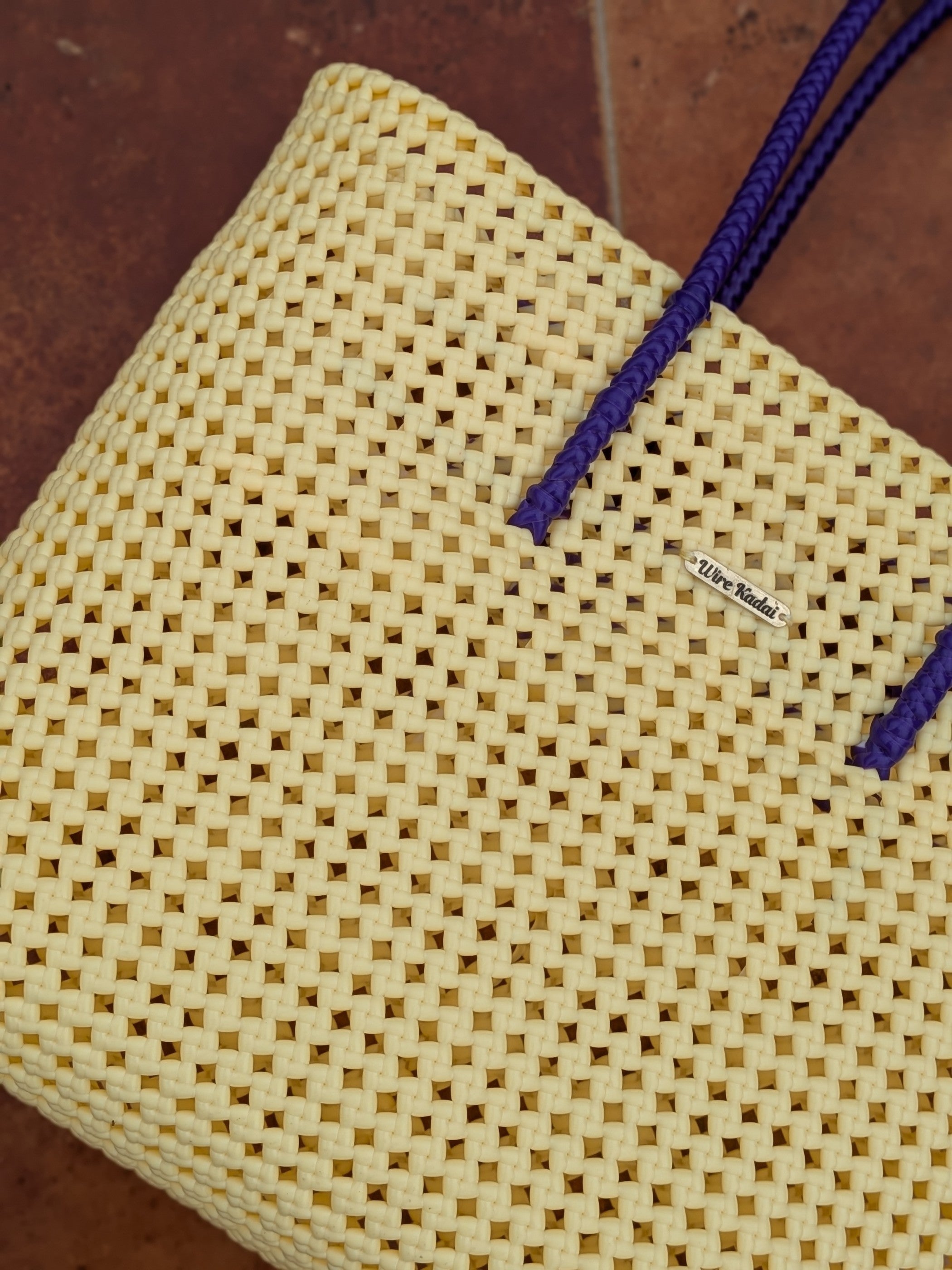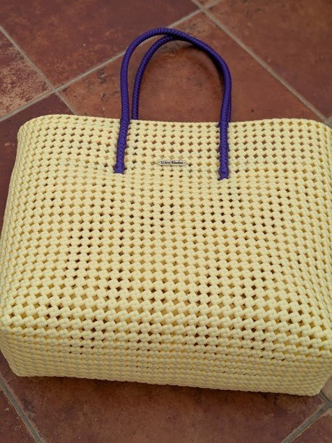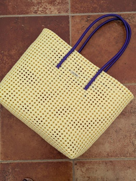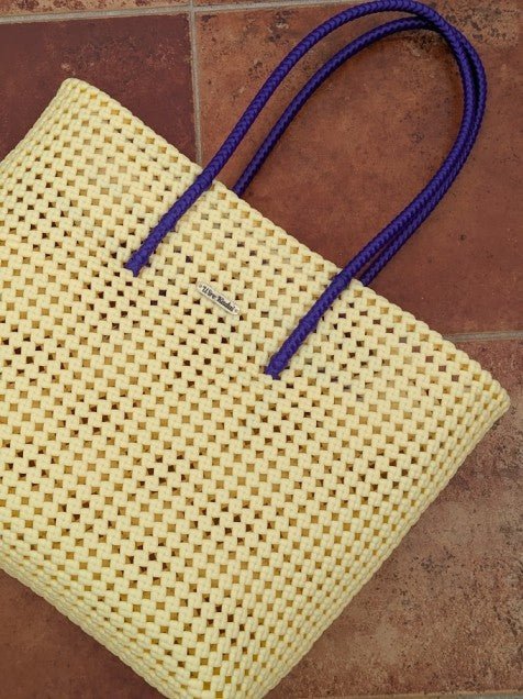 Solid cream tote with a vibrant violet handle. No frills, no thrills. Just plain, solid, pretty koodai.