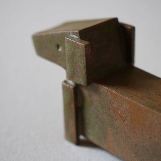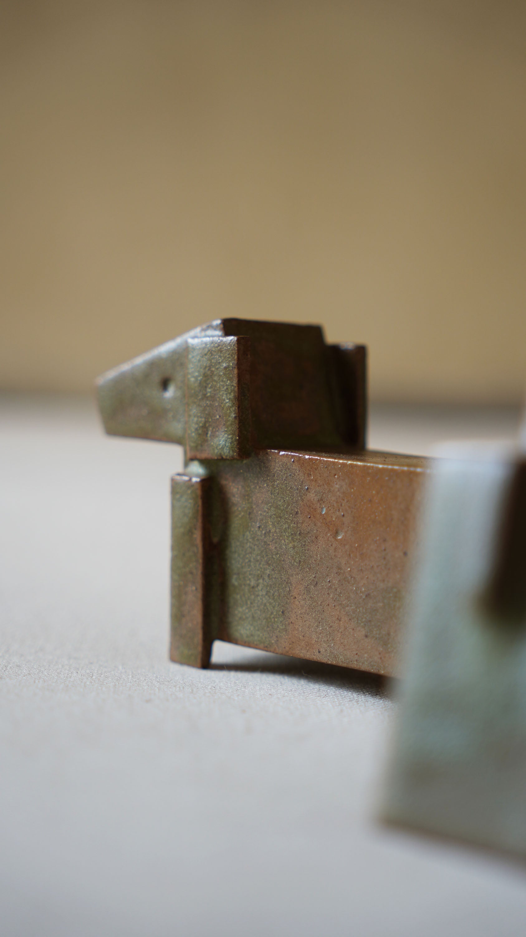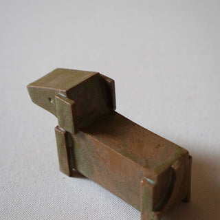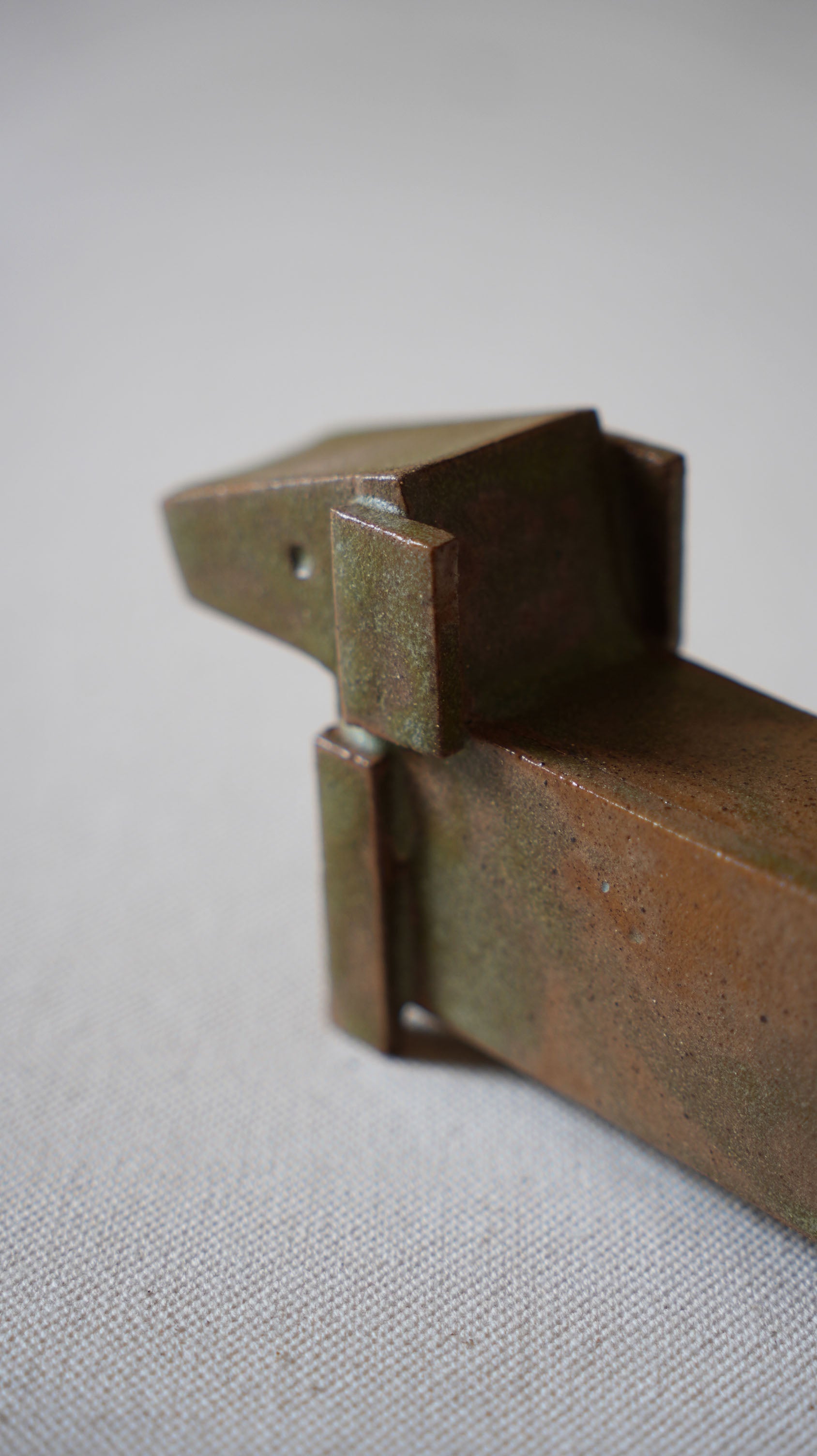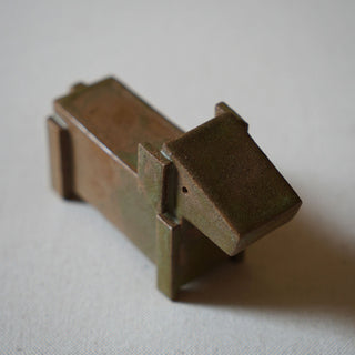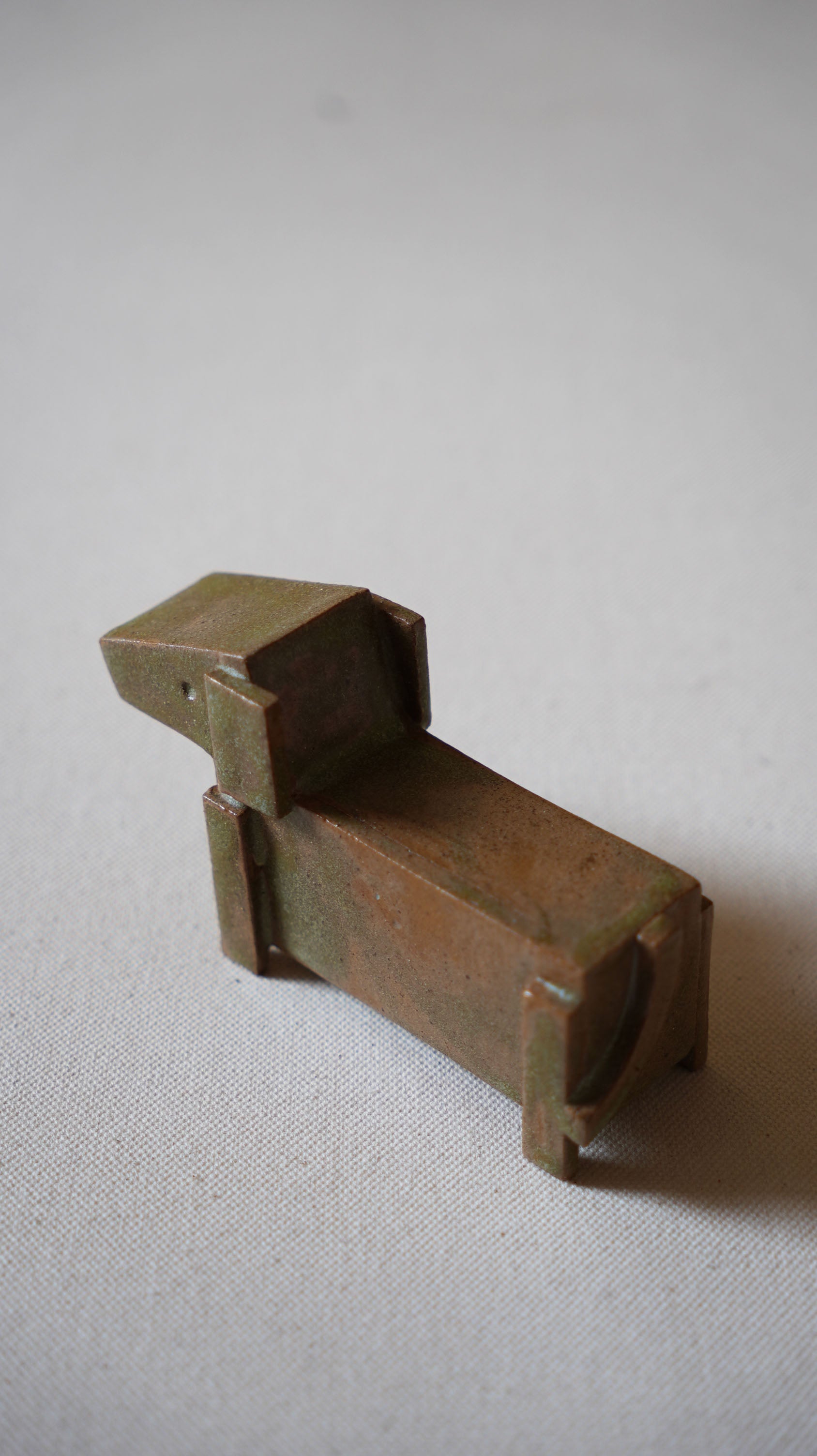 This handmade ceramic sculpture is an abstract, minimalist interpretation of an animal figure, potentially inspired by a canine or equine form. The piece combines geometric shapes and clean, angular lines, creating a balance between abstraction and recognition.