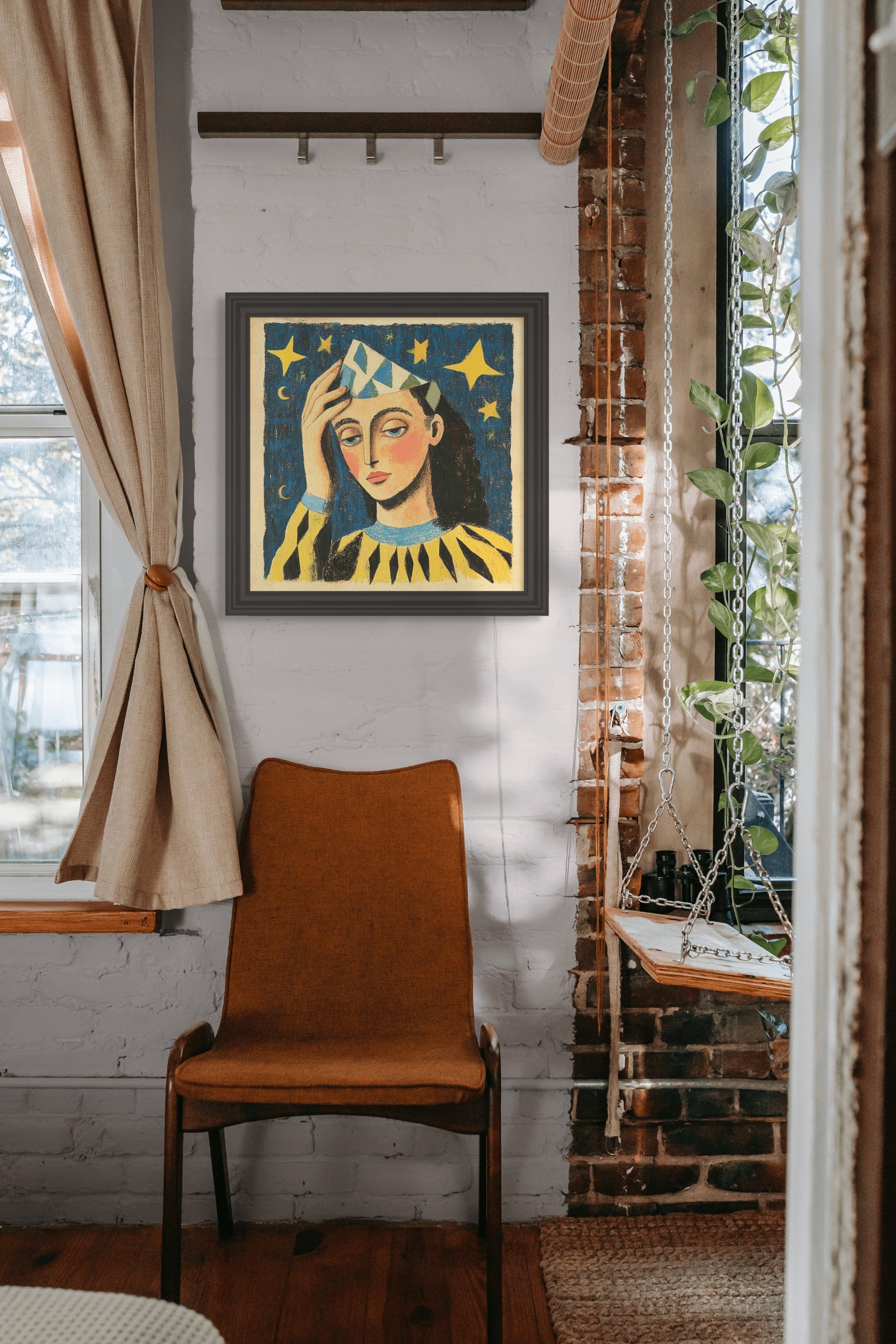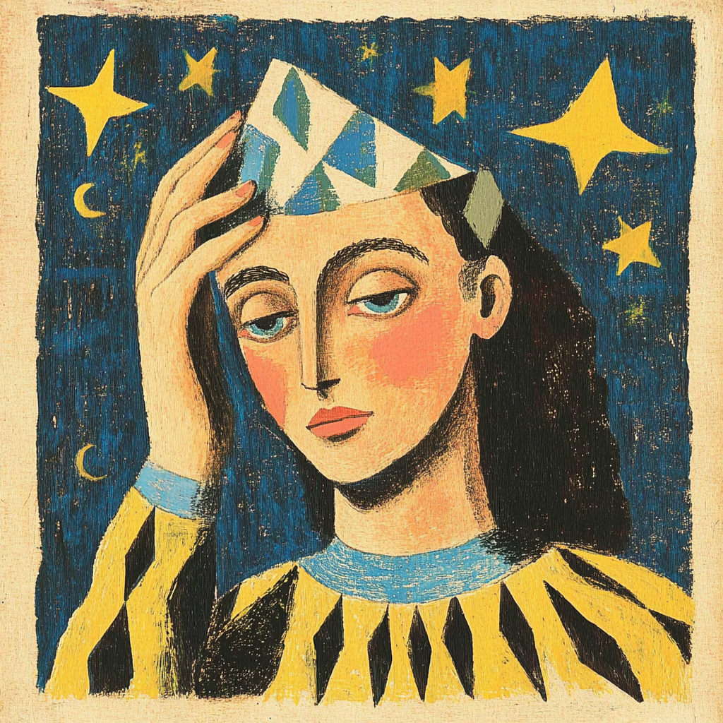 Her delicate crown is folded from torn pages of lost prophecies and unsent love letters—a symbol of fragile hopes and unseen forces. With a simple tilt of her head, she unravels destinies written beneath moonlit skies.