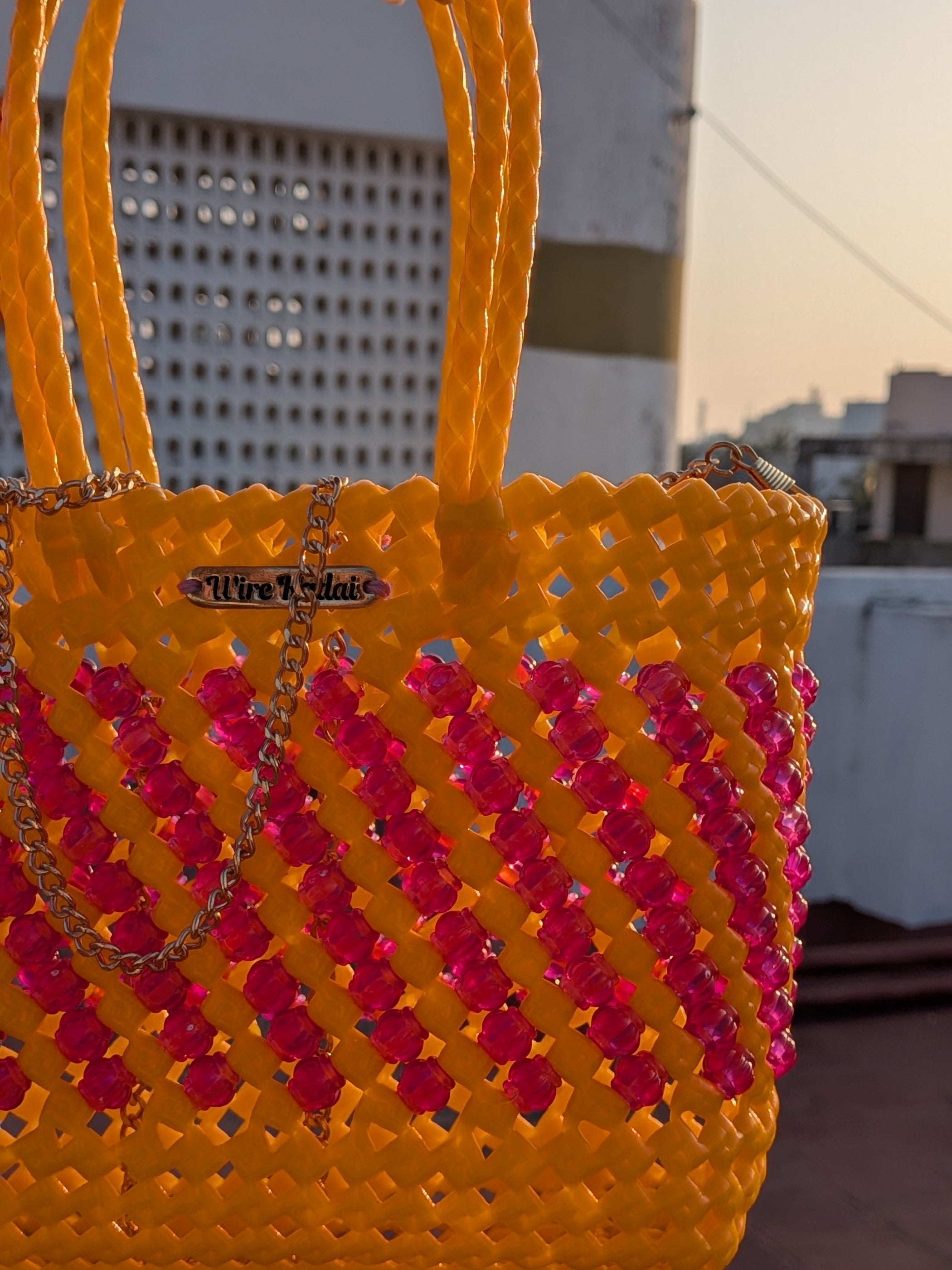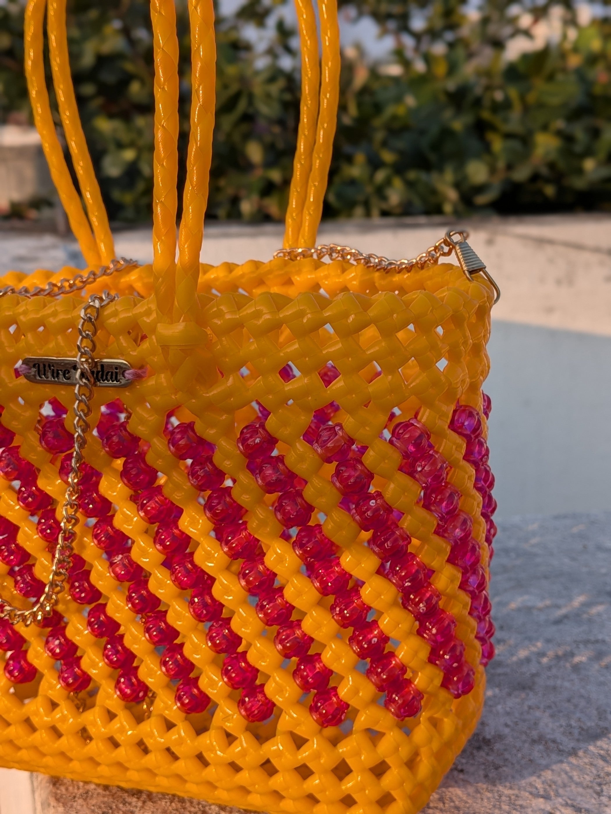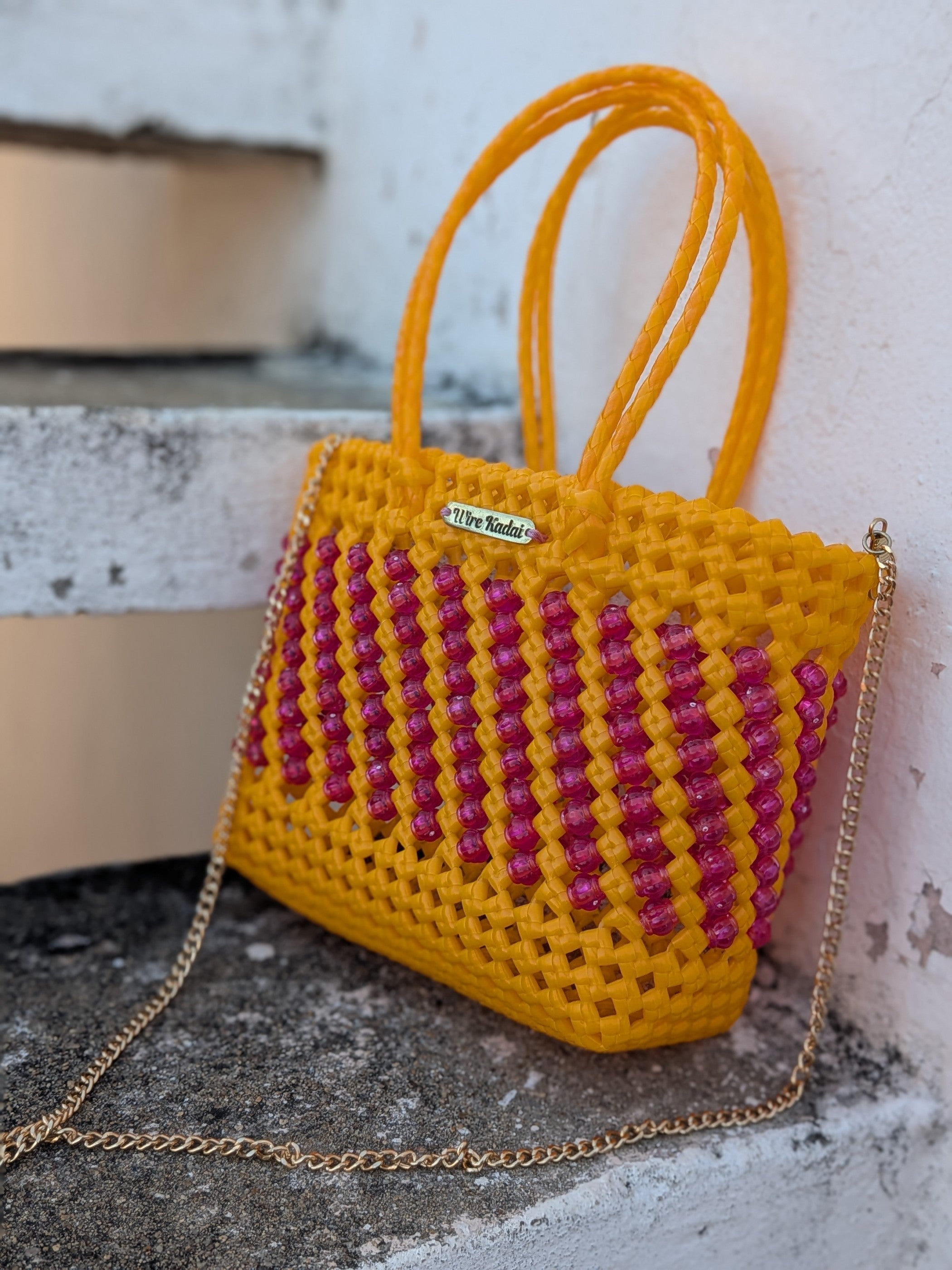 Our very fun, cute, compact mini koodai with bead detail. It has double handles and has a chain to carry on shoulder. Carry your phone, make up, keys, and goes effortlessly with any outfit. Comes with a detachable chain.
