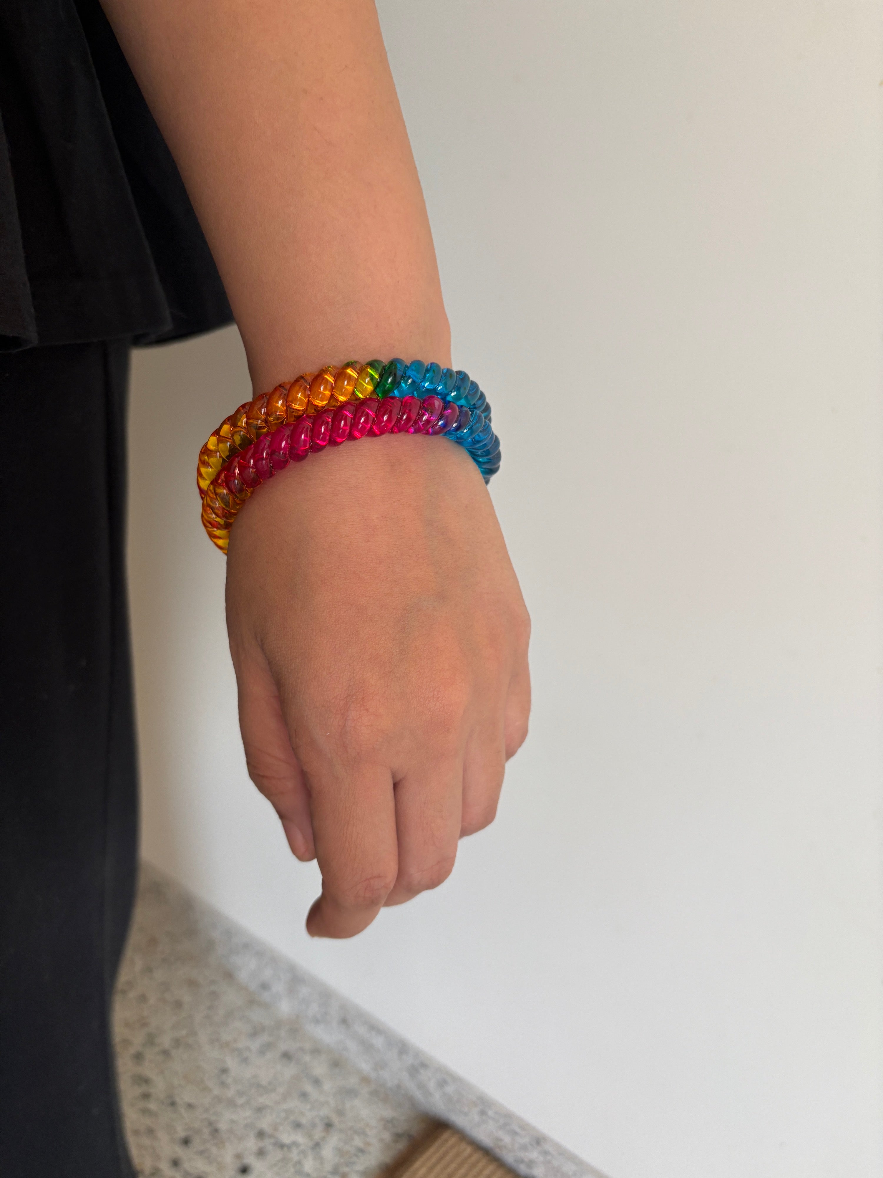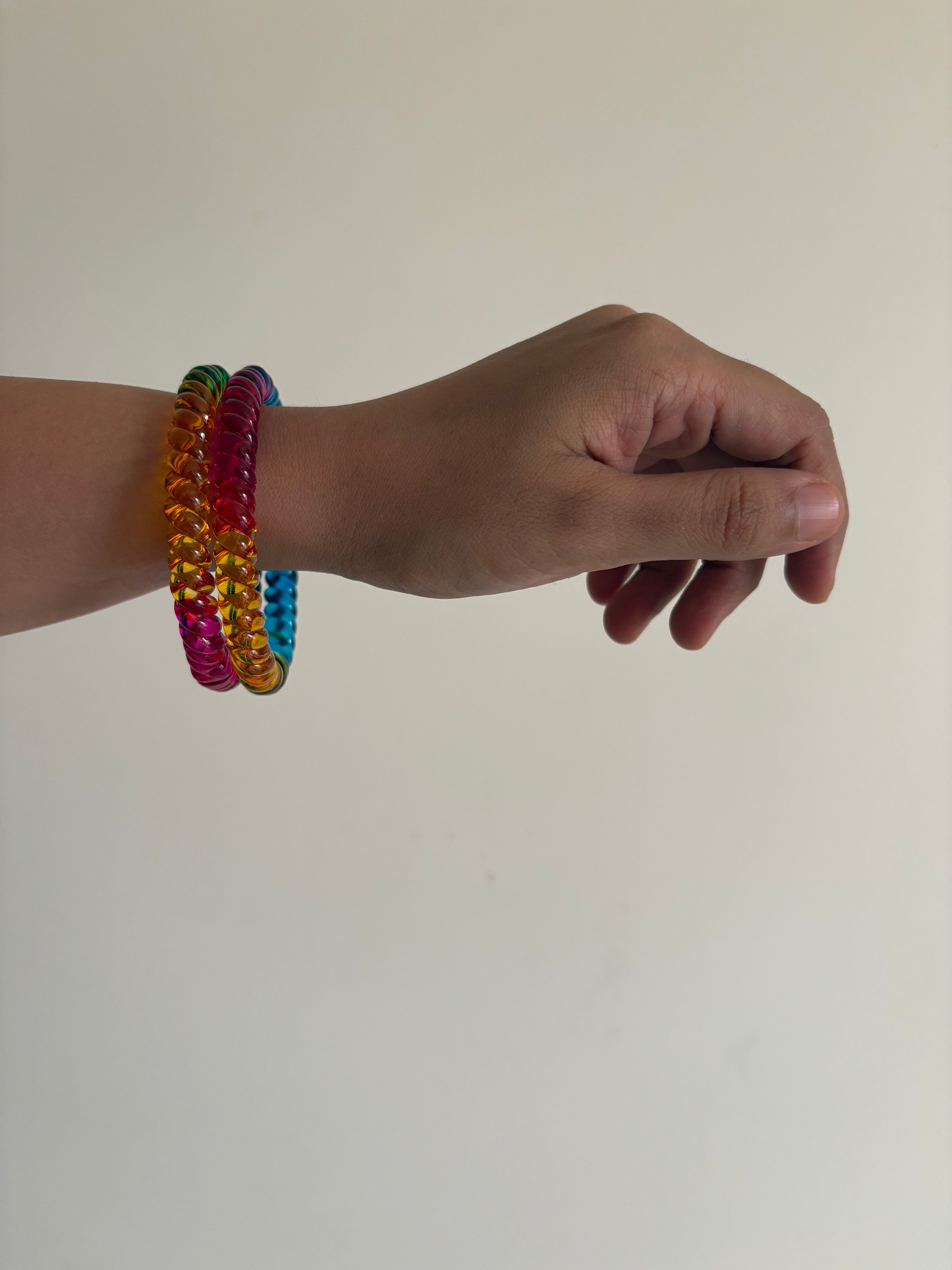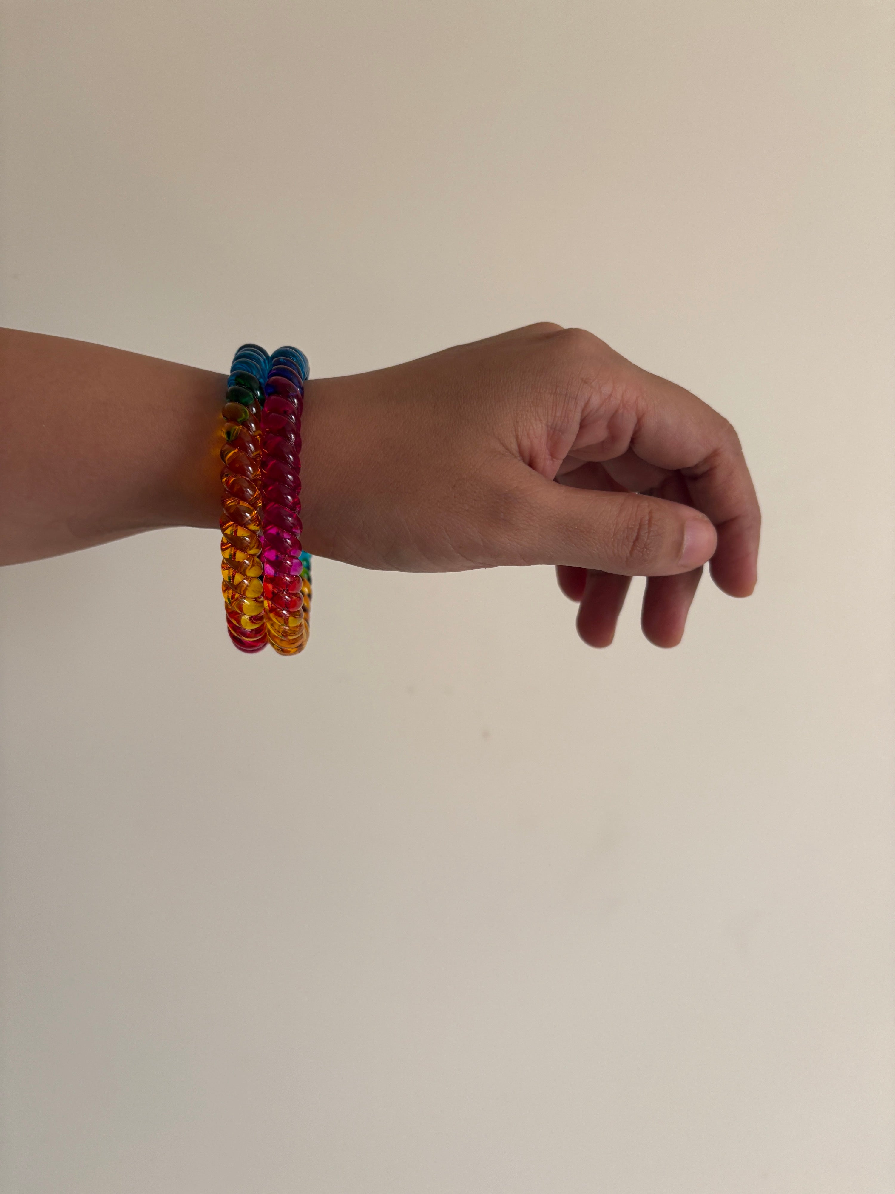 These Rangoli Bangles in a chunky spiral form are handcrafted to bring a burst of multicolour charm. Their smooth, reflective finish catches the light beautifully, giving them a glassy, statement-worthy appeal. Effortless and versatile to be paired in a stack or worn by themselves.