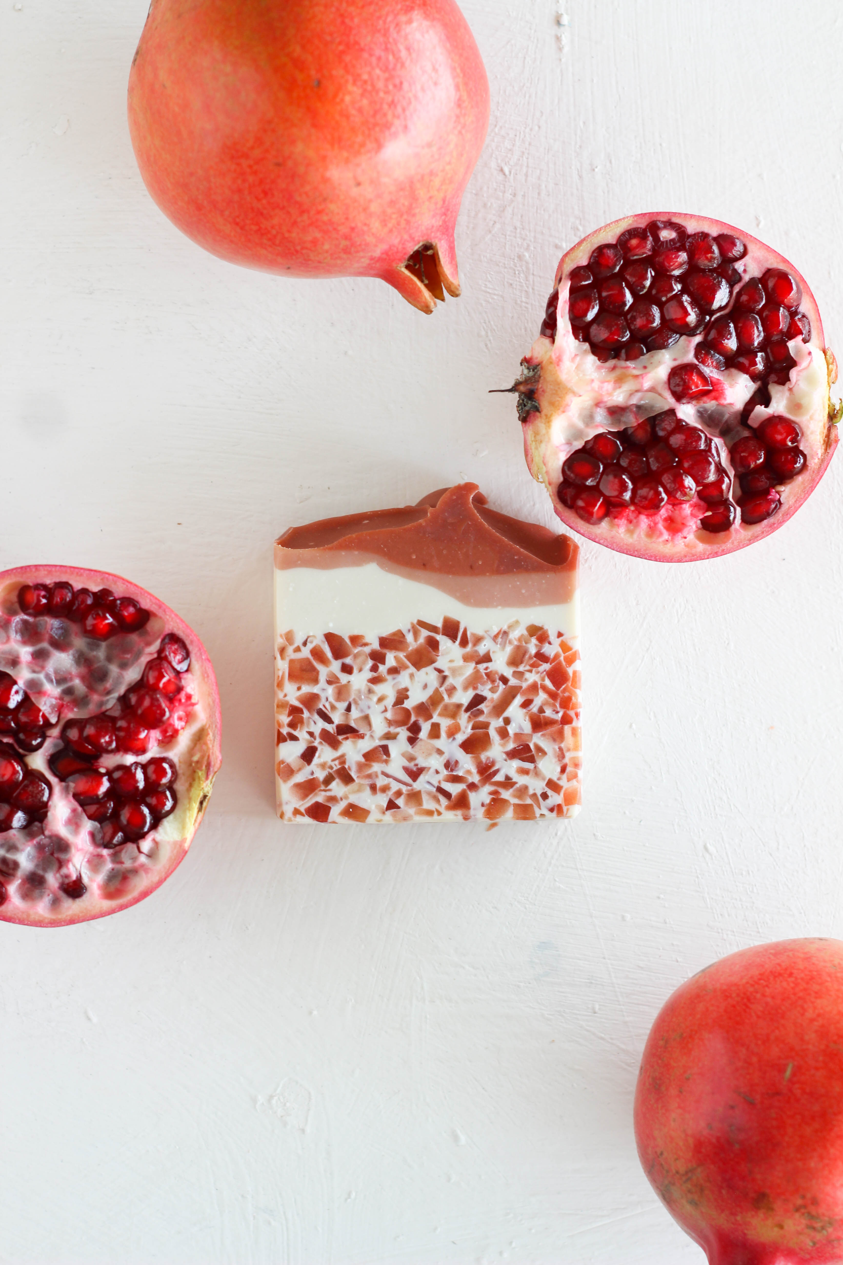 Fragrance notes of berries, oranges, oak moss, pomegranate & orchid flower cold process soap; coloured with French red clay & French pink clay