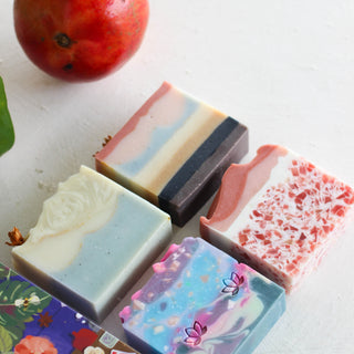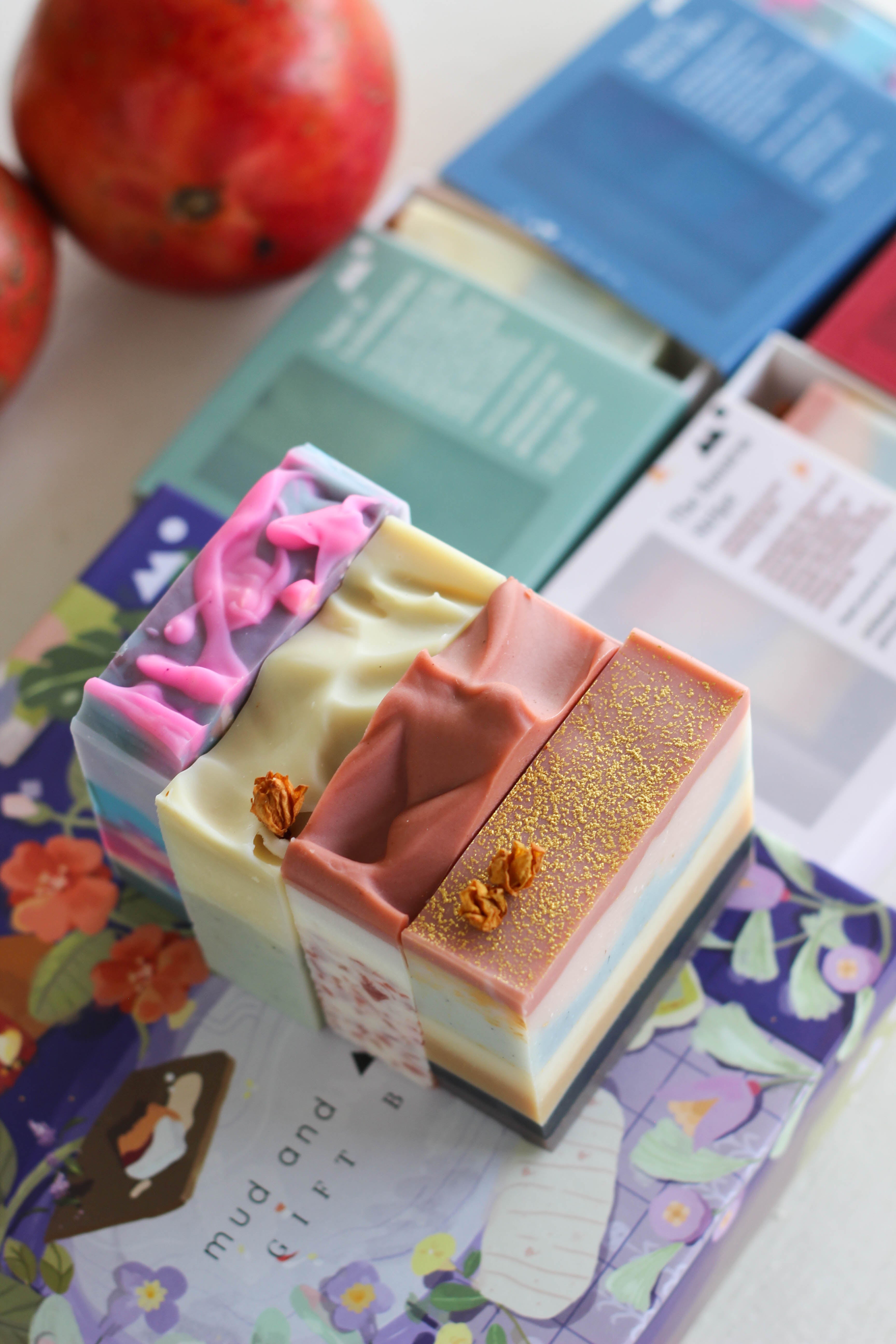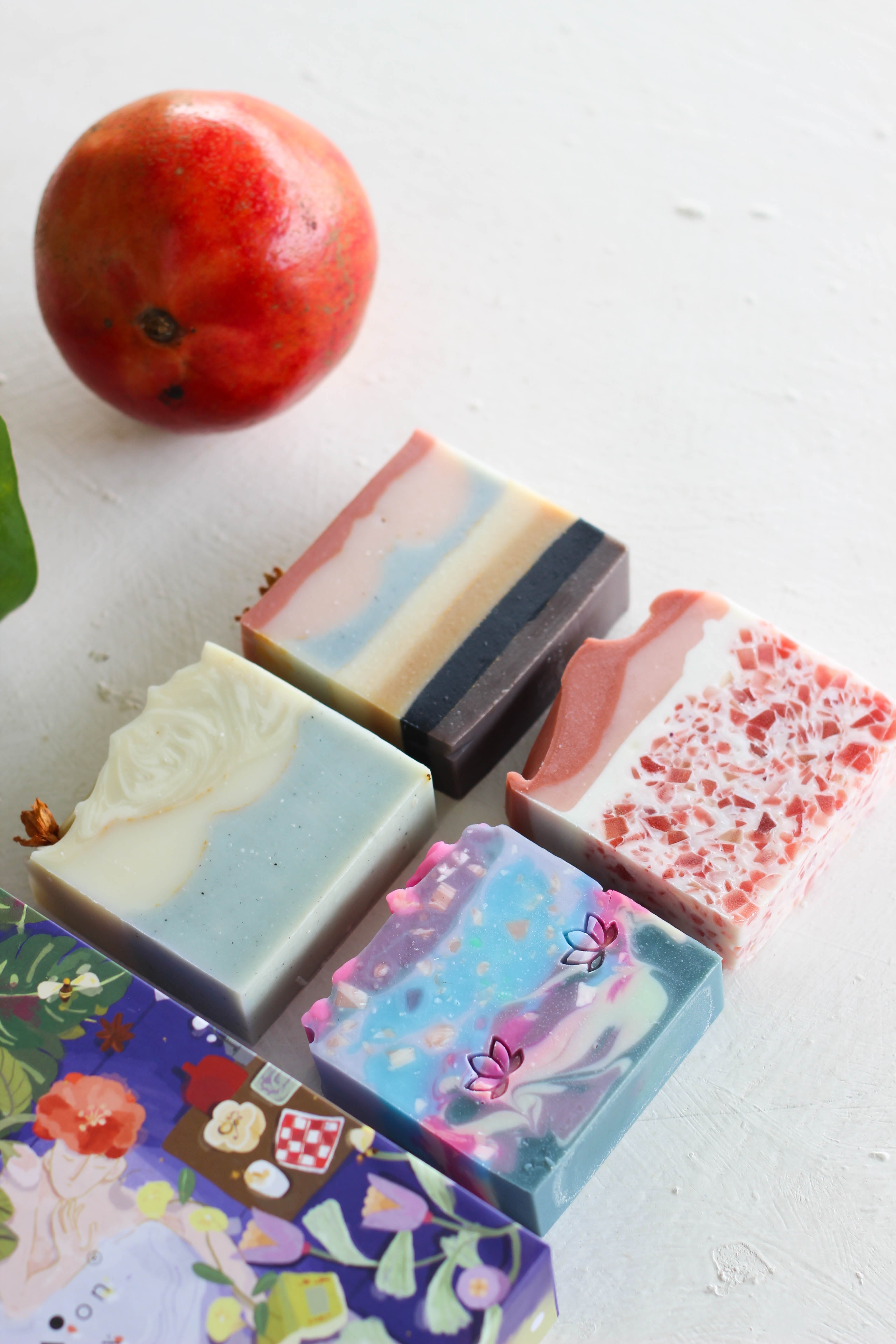 3) Pomegranate – This artisanal cold process soap with notes of berries, oranges, oak moss, pomegranate & orchid flower, handcrafted cold-process soap is inspired by the sheer of Pomegranate; coloured with French red clay & French Pink clay