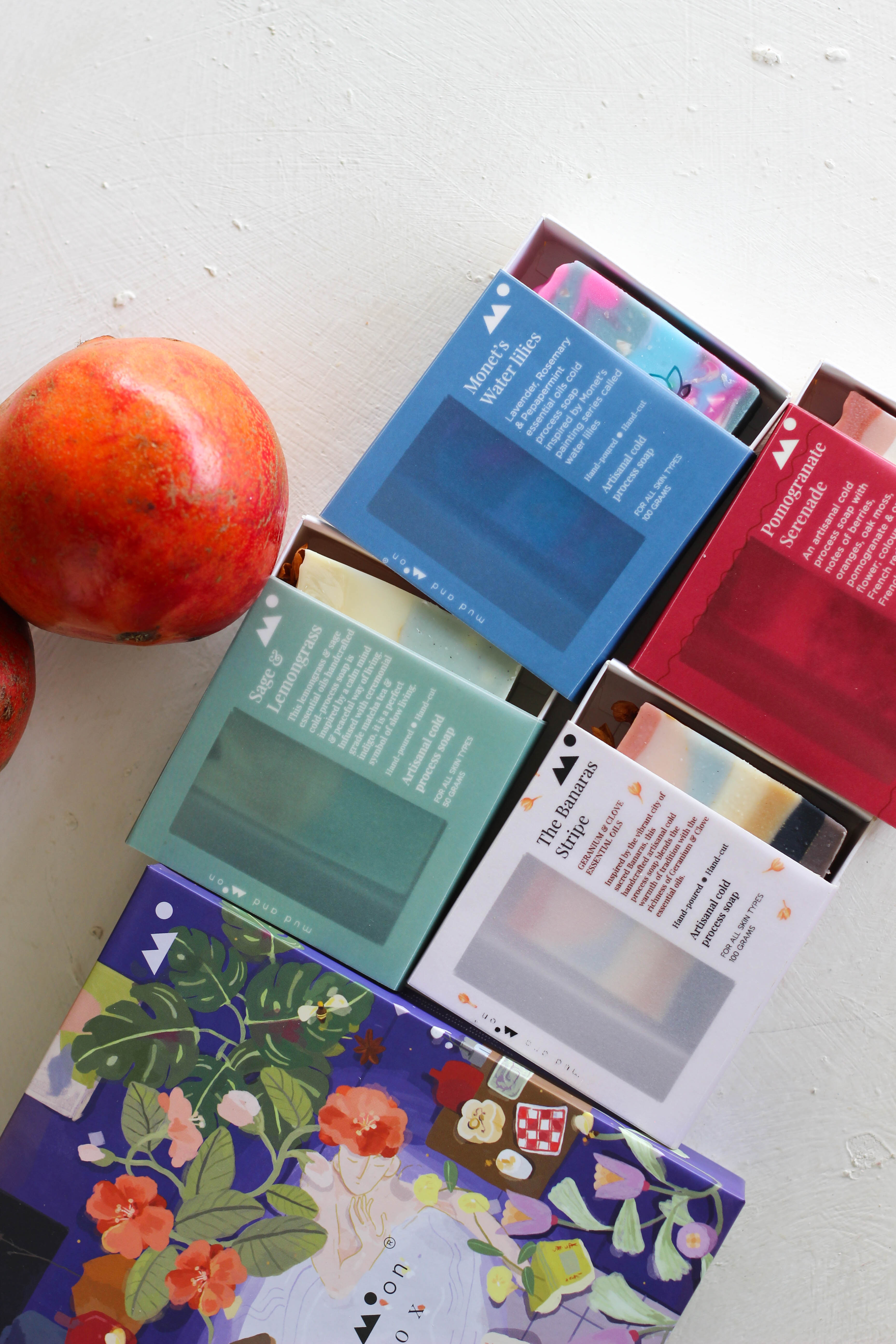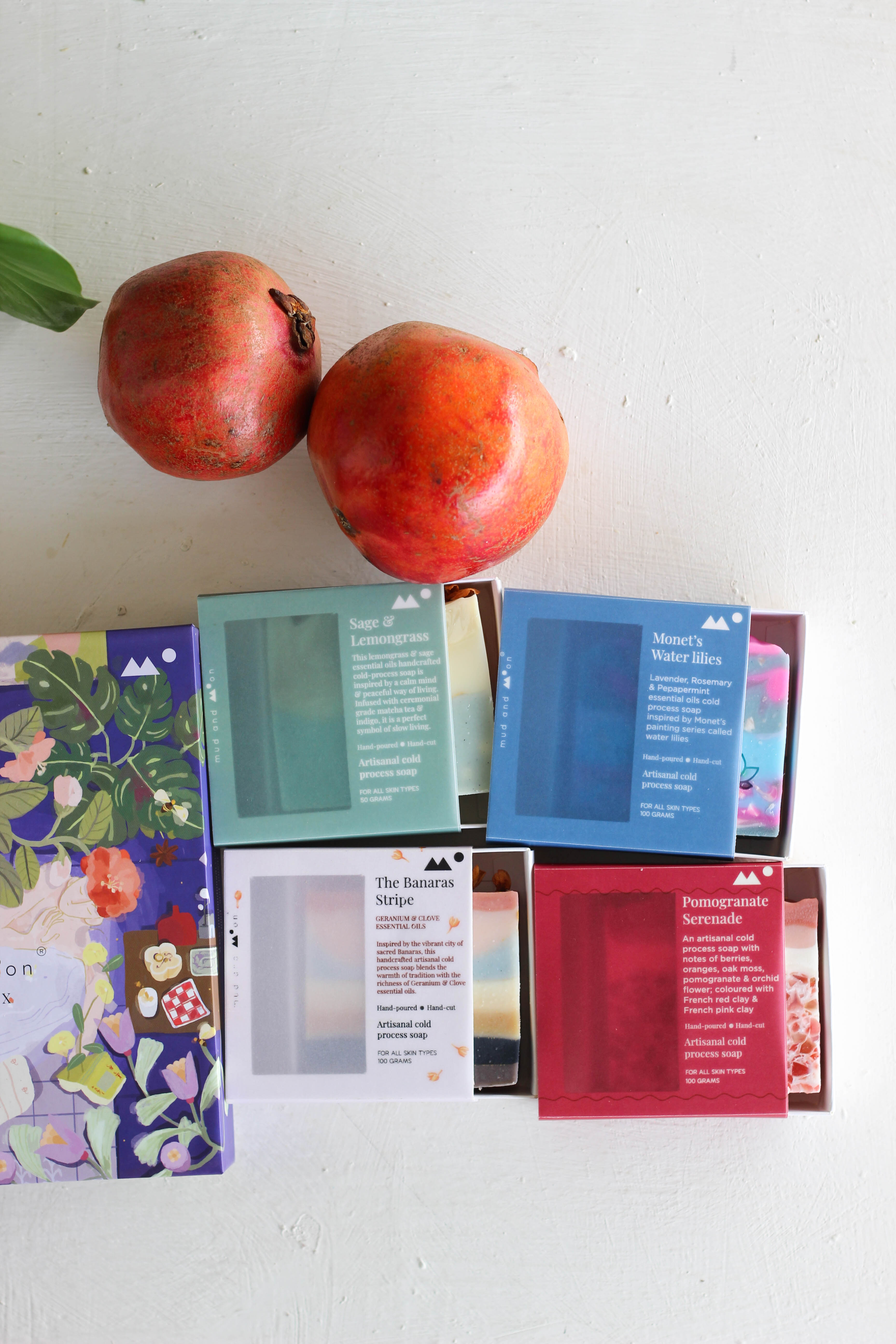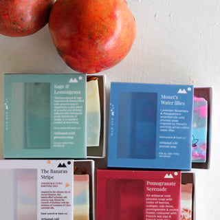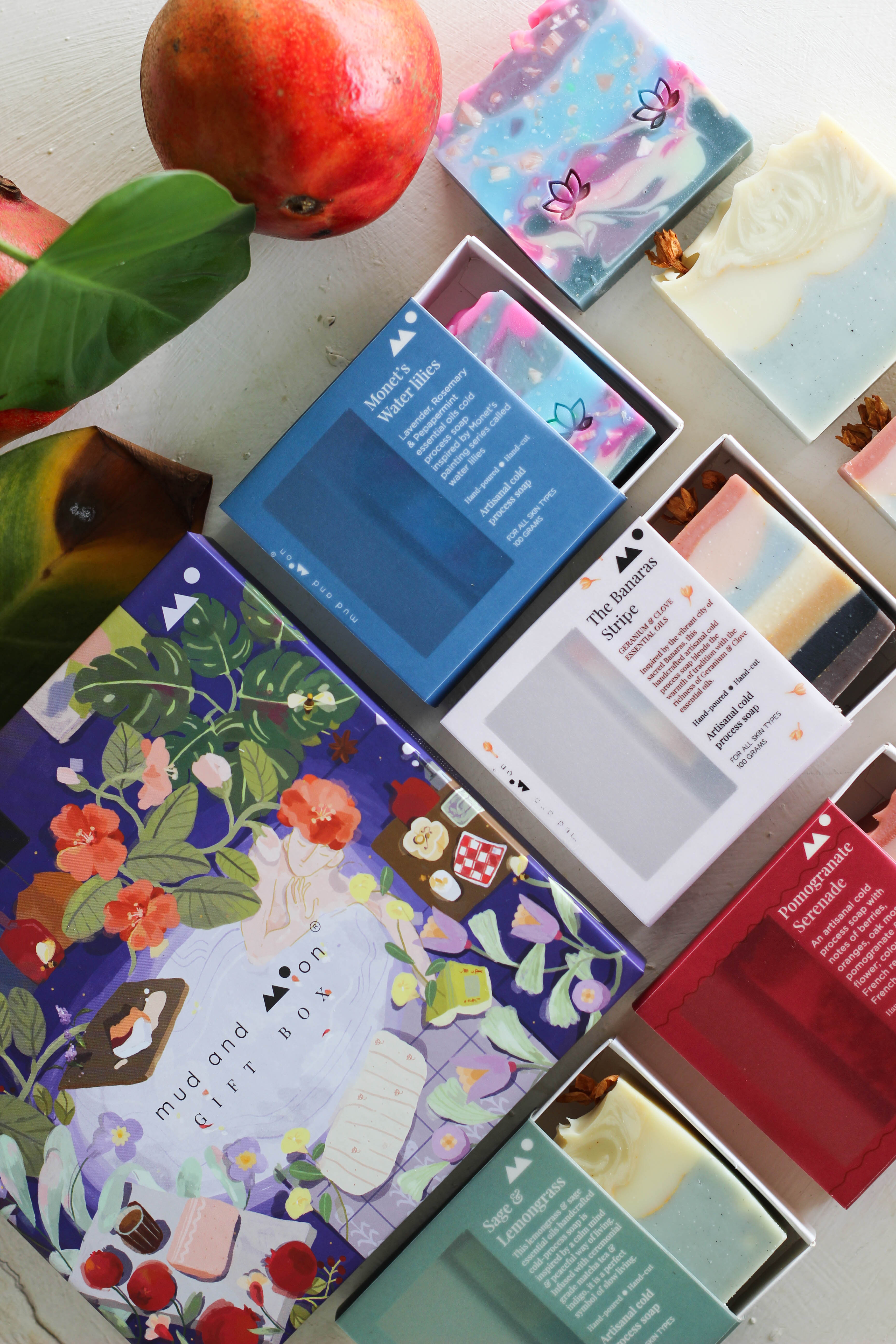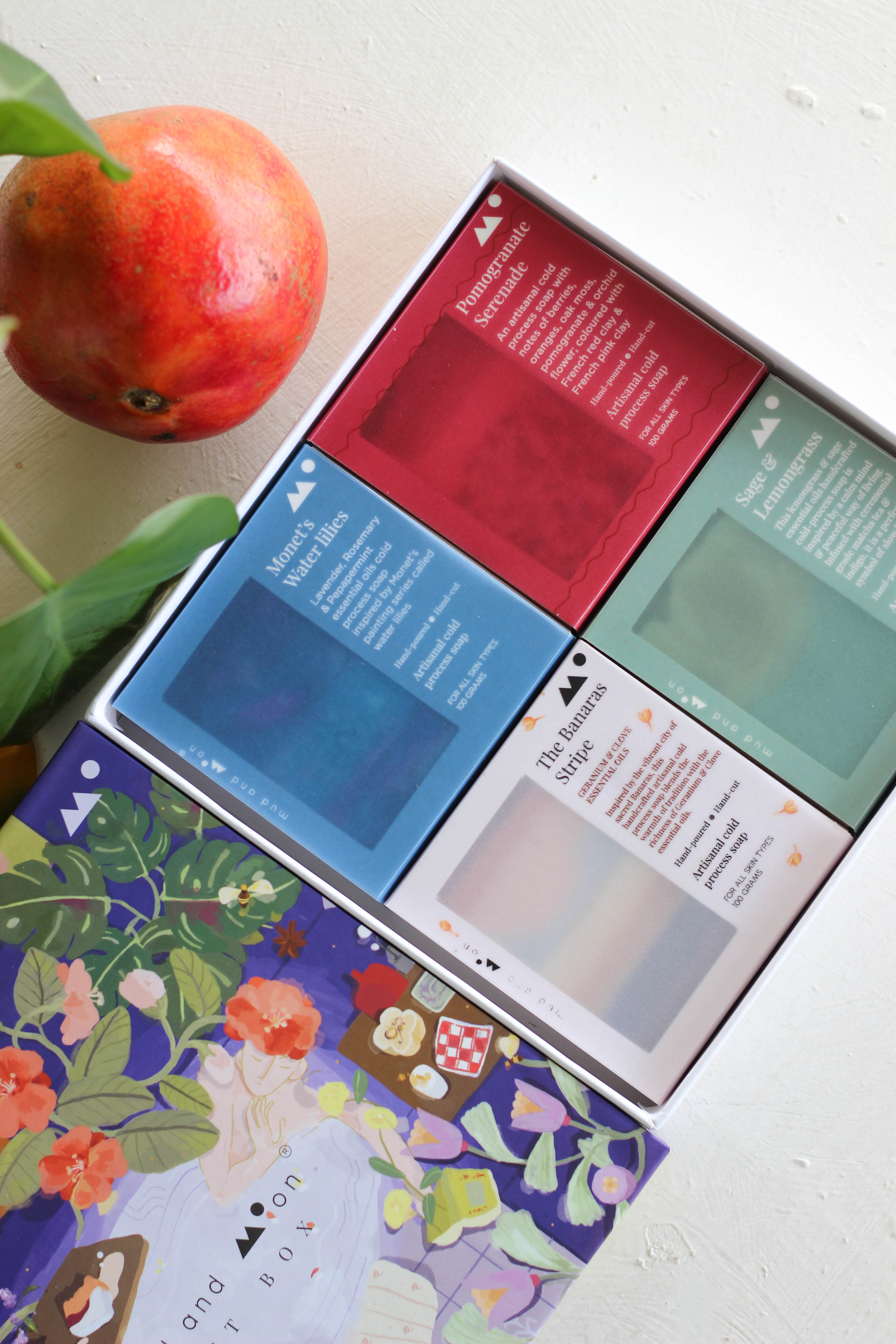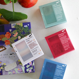 This special illustrated box contains a collection of 4 limited edition artisanal cold process soaps.