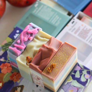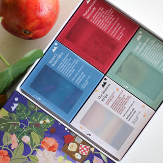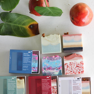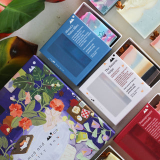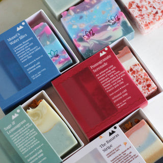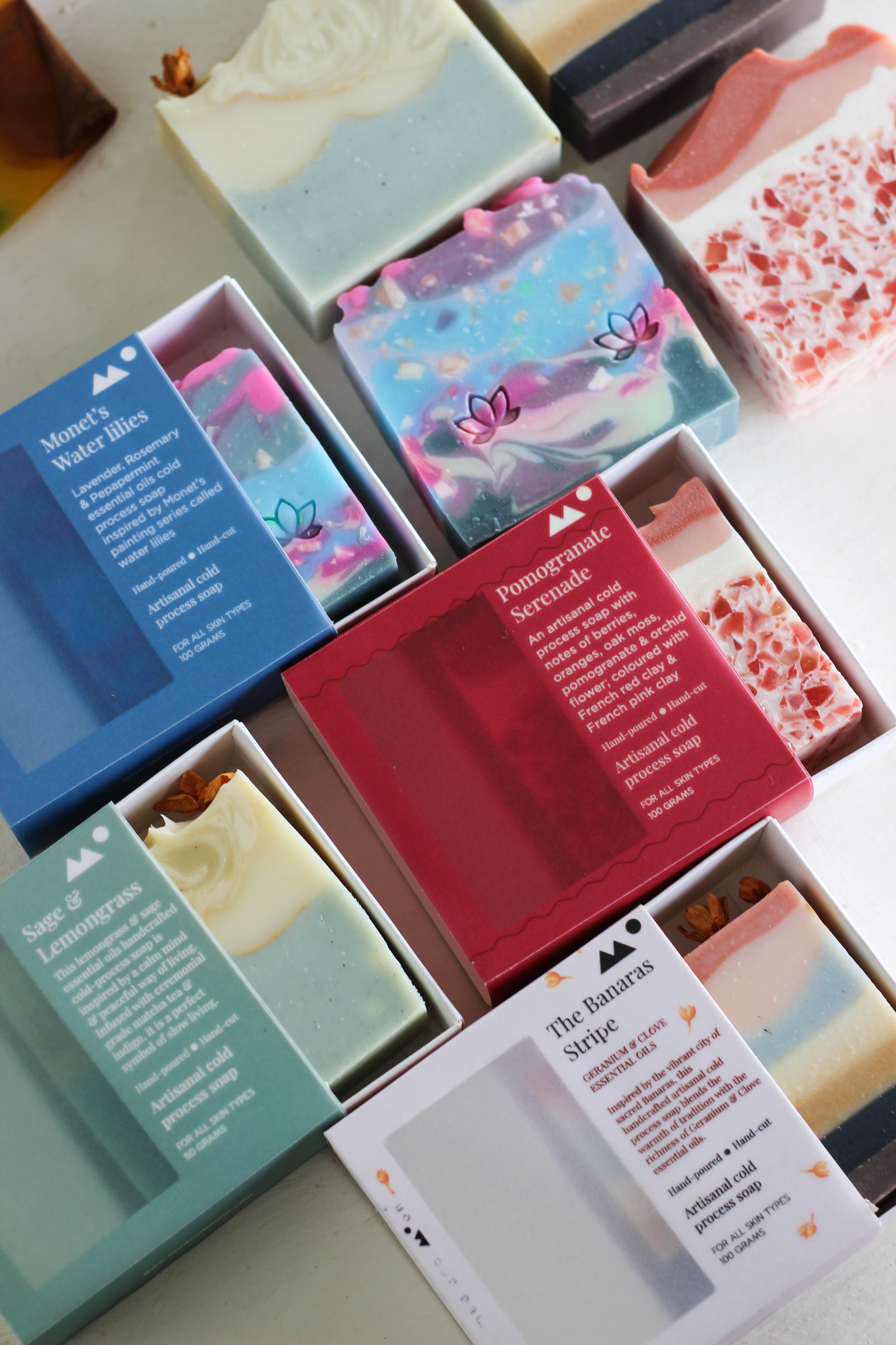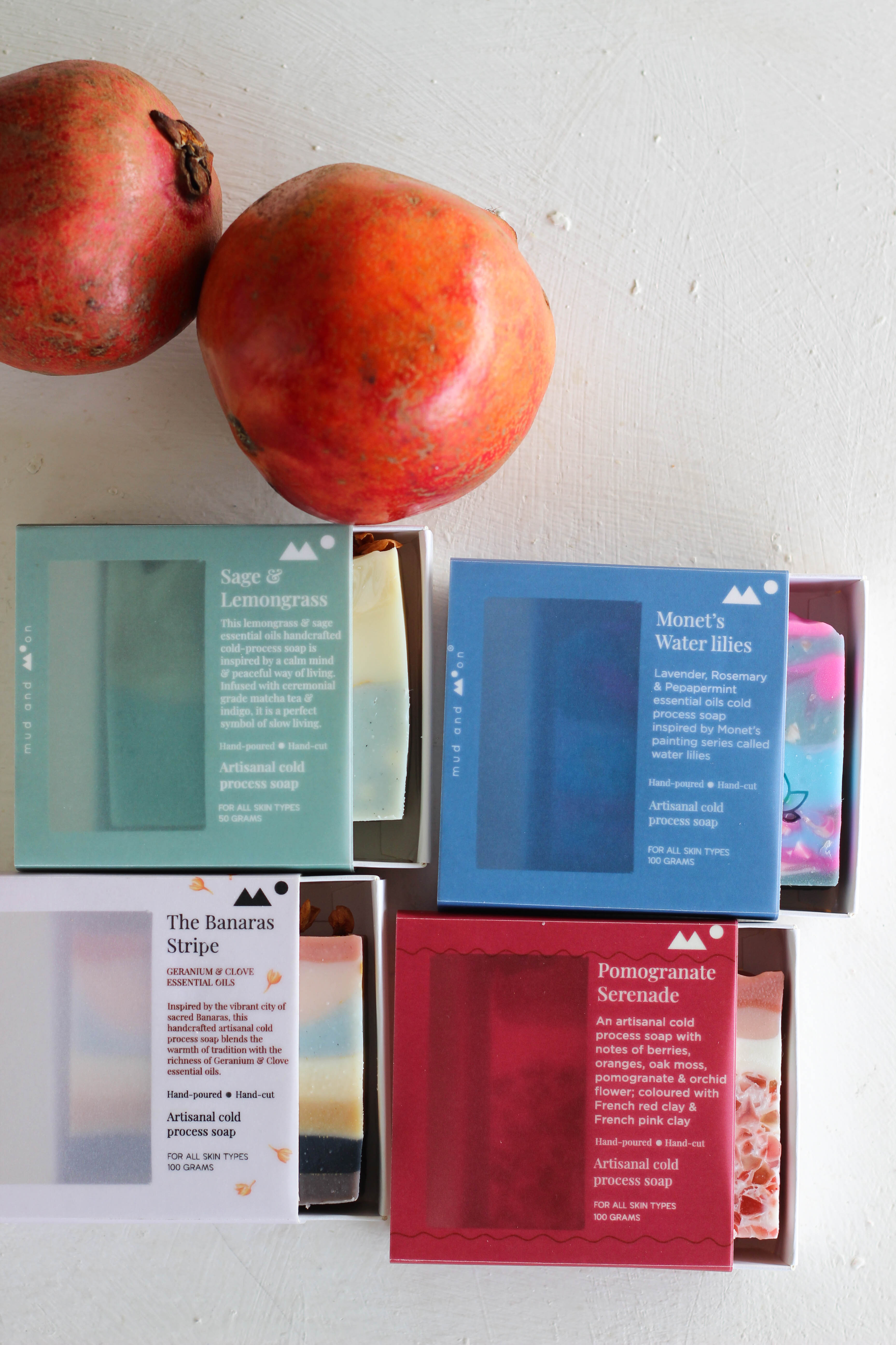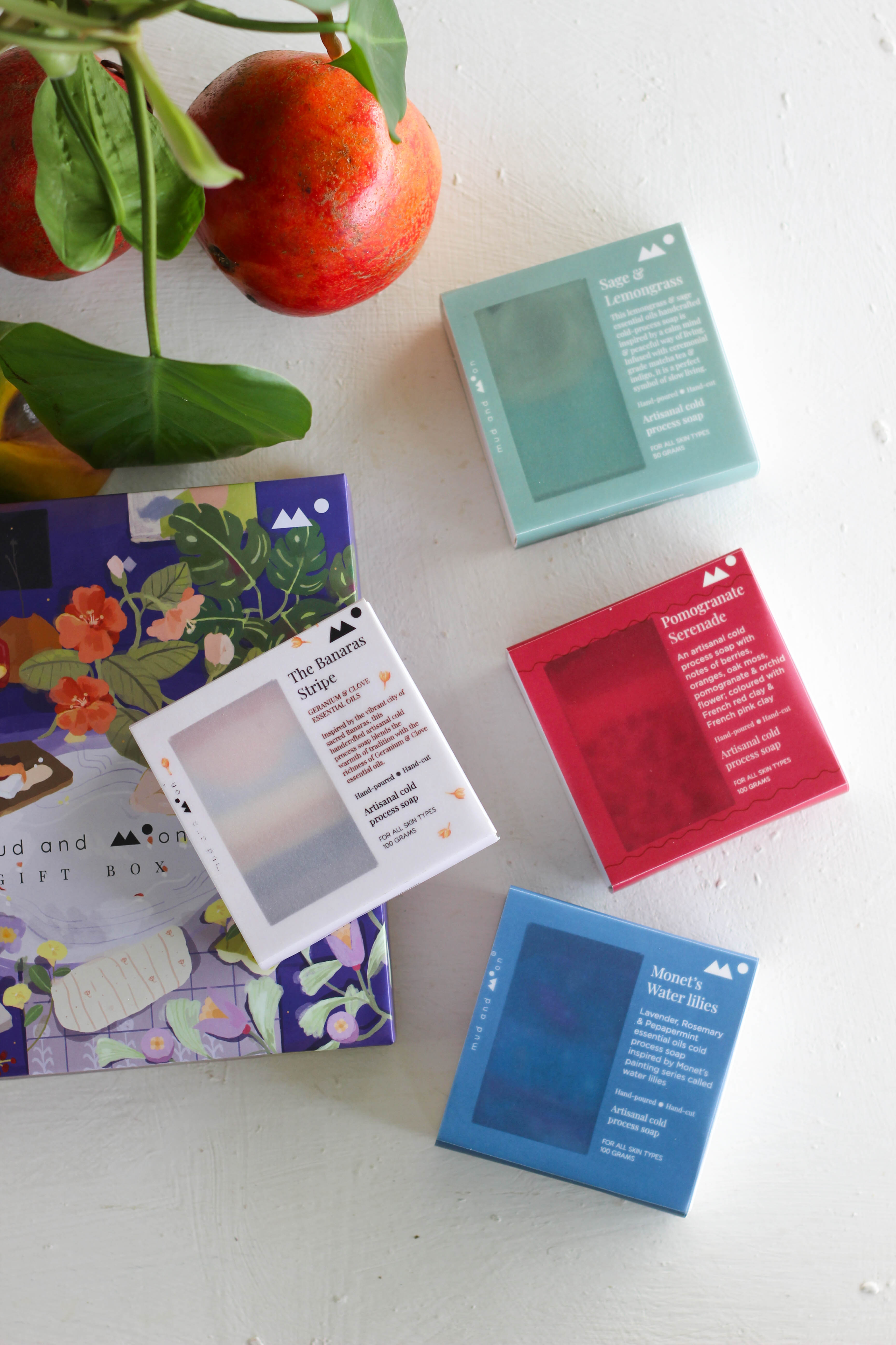 This special illustrated box contains a collection of 4 limited edition artisanal cold process soaps.
