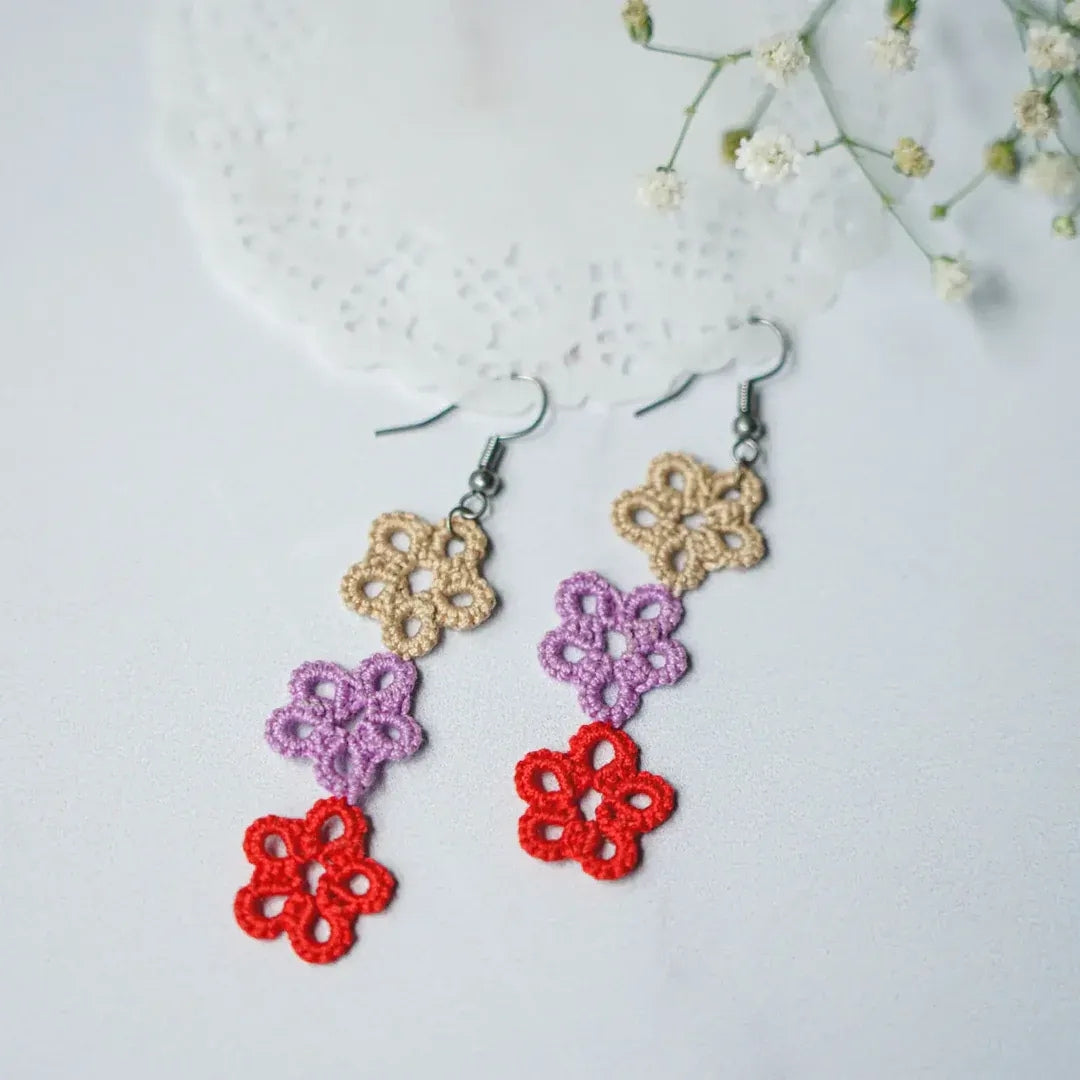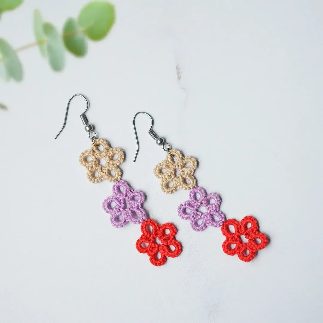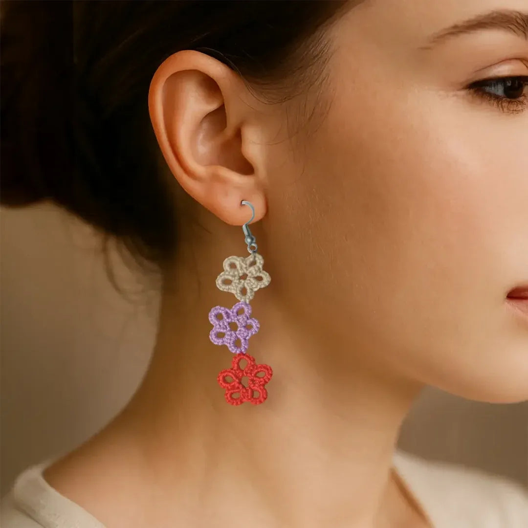 Beautifully crafted with cotton thread using the age-old technique of tatting, these earrings feature intricate lacework created knot by knot with shuttle tatting. Handmade with great care, each pair is exclusively crafted using this traditional method. These super cool, extremely lightweight earrings are versatile enough to complement any attire, ensuring you can wear them all day with ease. As artisanal items entirely made and decorated by hand, small imperfections denote the originality of the product. So, hop on board and add a touch of artisanal charm to your ensemble!