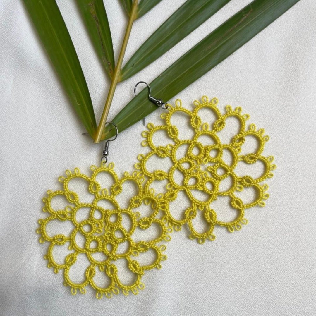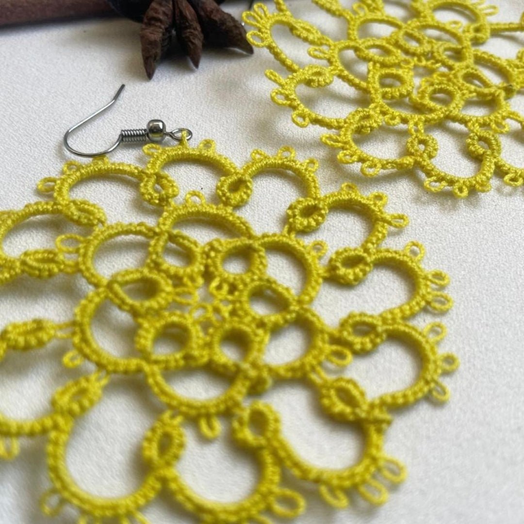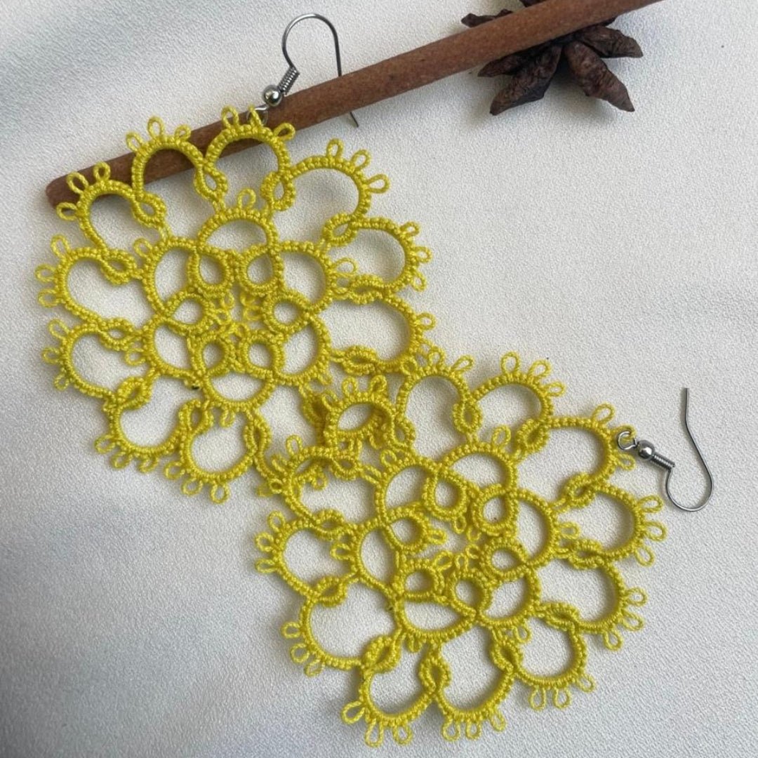 Beautifully crafted with cotton thread using the age-old technique of tatting, these earrings feature intricate lacework created knot by knot with shuttle tatting. Handmade with great care, each pair is exclusively crafted using this traditional method. These super cool, extremely lightweight earrings are versatile enough to complement any attire, ensuring you can wear them all day with ease. As artisanal items entirely made and decorated by hand, small imperfections denote the originality of the product. So, hop on board and add a touch of artisanal charm to your ensemble! Dimensions: L 6.3 x W 6.3 cm (approx)