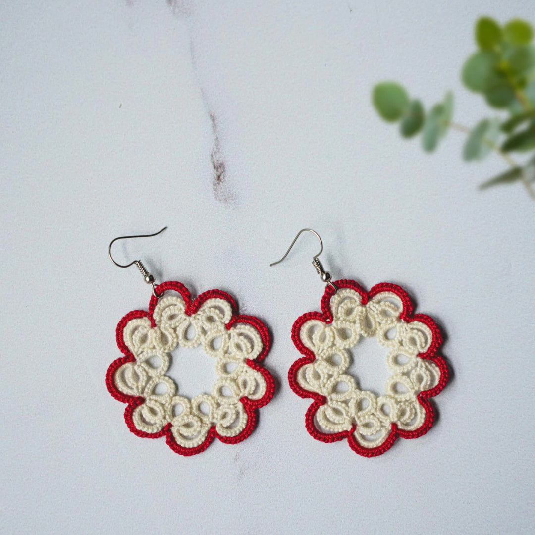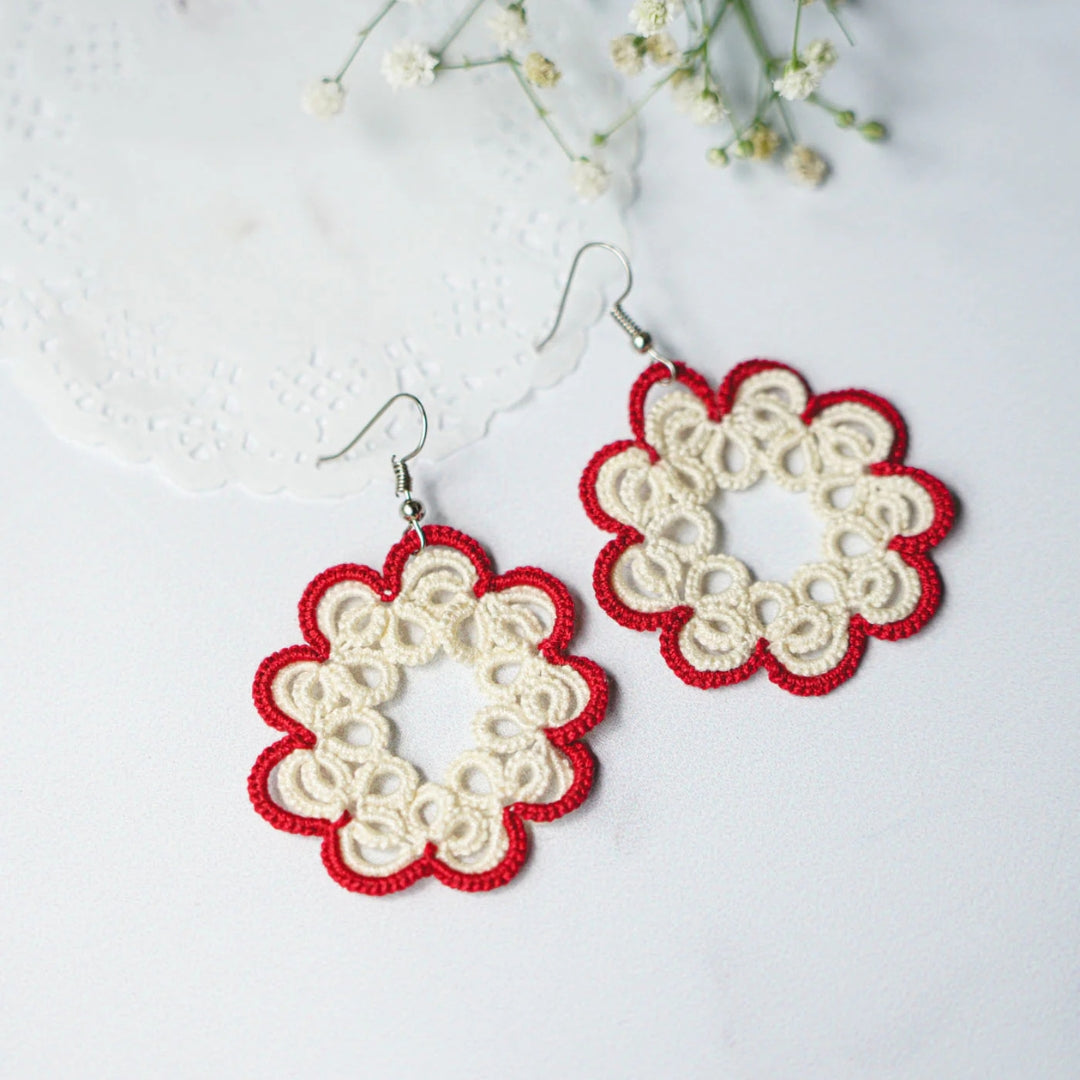 Beautifully crafted with cotton thread using the age-old technique of tatting, these earrings feature intricate lacework created knot by knot with shuttle tatting. Handmade with great care, each pair is exclusively crafted using this traditional method. These super cool, extremely lightweight earrings are versatile enough to complement any attire, ensuring you can wear them all day with ease. As artisanal items entirely made and decorated by hand, small imperfections denote the originality of the product. So, hop on board and add a touch of artisanal charm to your ensemble!