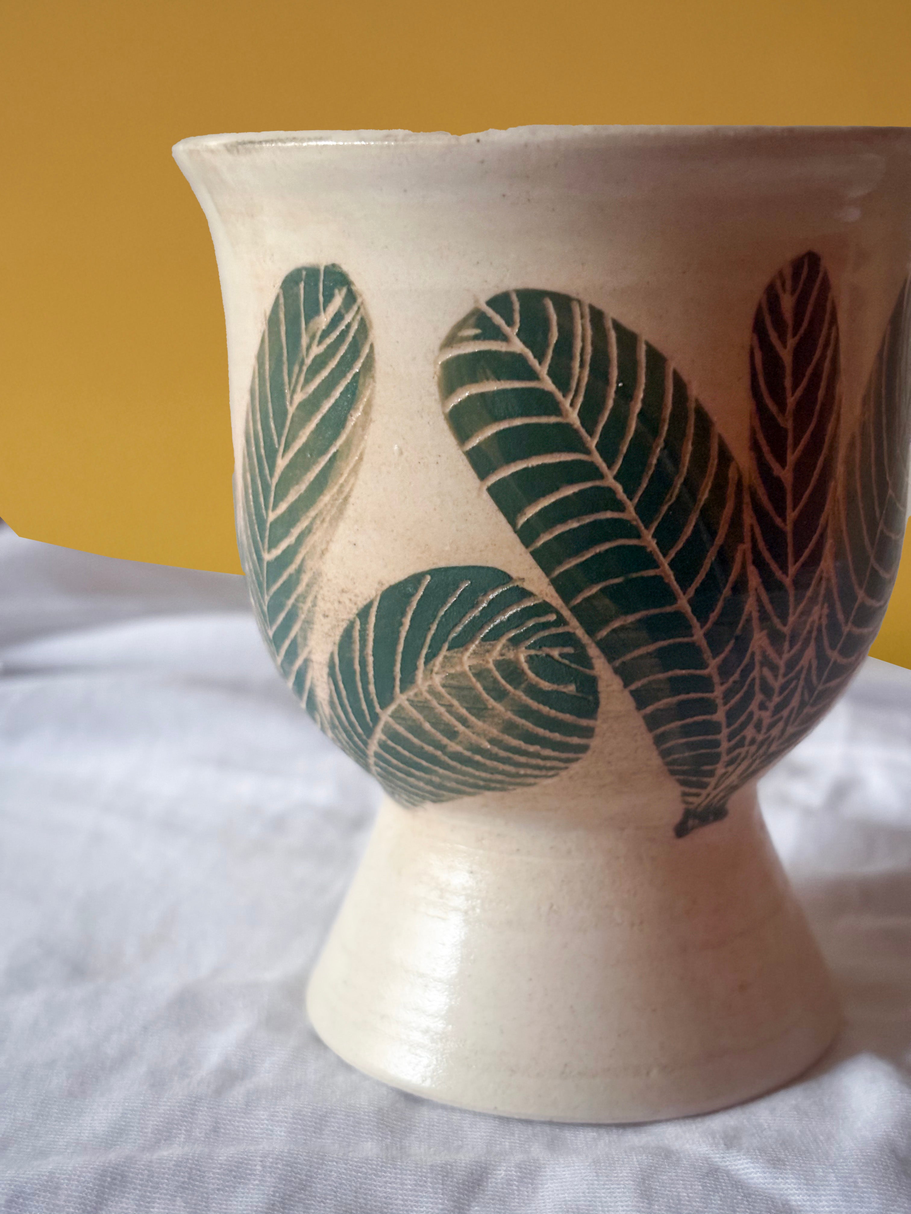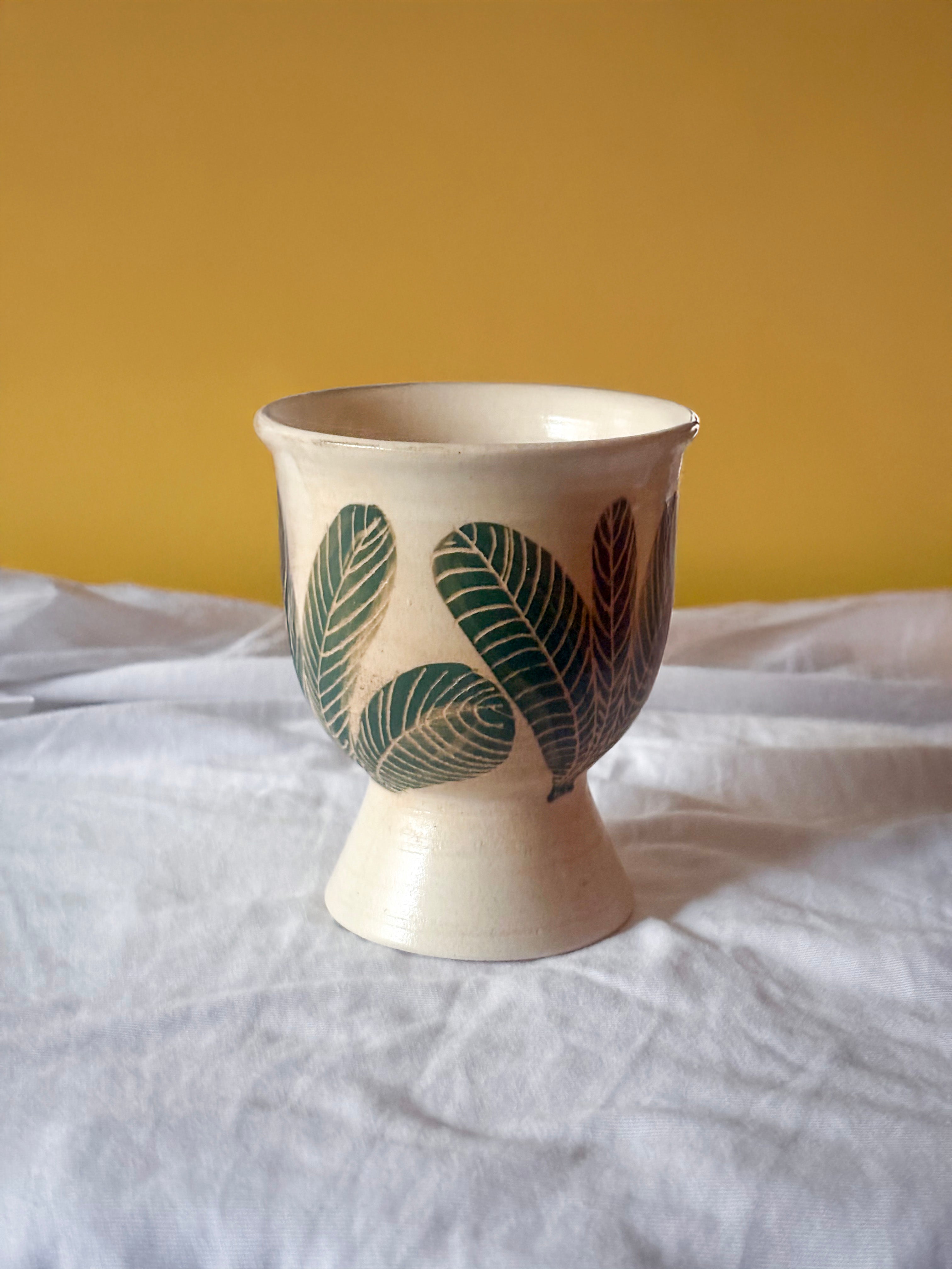 A graceful stoneware goblet adorned with hand-carved leaf motifs in deep green. Its organic form and earthy palette make it perfect for serving wine, cocktails, or even as a decorative accent in your home. The subtle curve of the rim and the sturdy pedestal base give it both elegance and functionality. Each piece is handmade, carrying its own unique character.