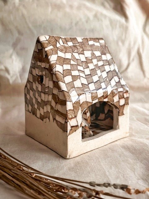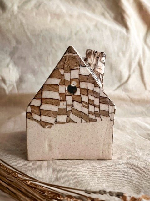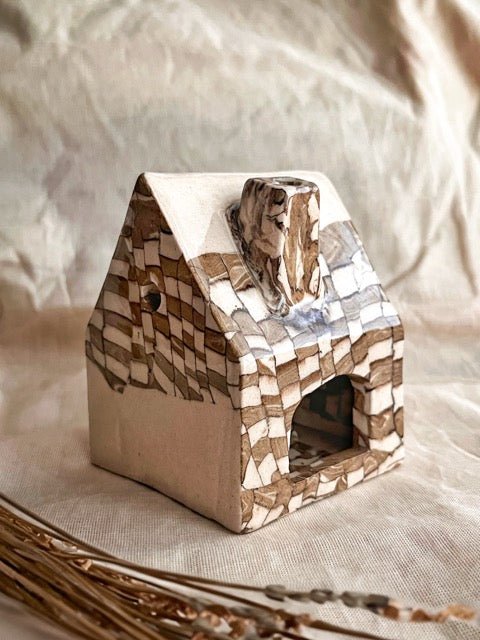 Part of the Mitti Houses series, this Nerikomi Cottage is a miniature stoneware house designed to hold incense cones. Light an incense inside and watch the fragrant smoke curl gently out of the tiny chimney—turning the cottage into a storybook scene. Crafted with Nerikomi marbled clay patterns, its earthy browns and whites create a patchwork roof and walls, making it as much a piece of décor as it is a functional incense burner. Place it on your shelf, desk, or altar to bring warmth and whimsy into your space.
