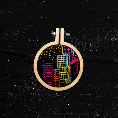 Hand embroidered fridge magnet, inspired by the 1980s Tokyo city at night and the City Pop genre.