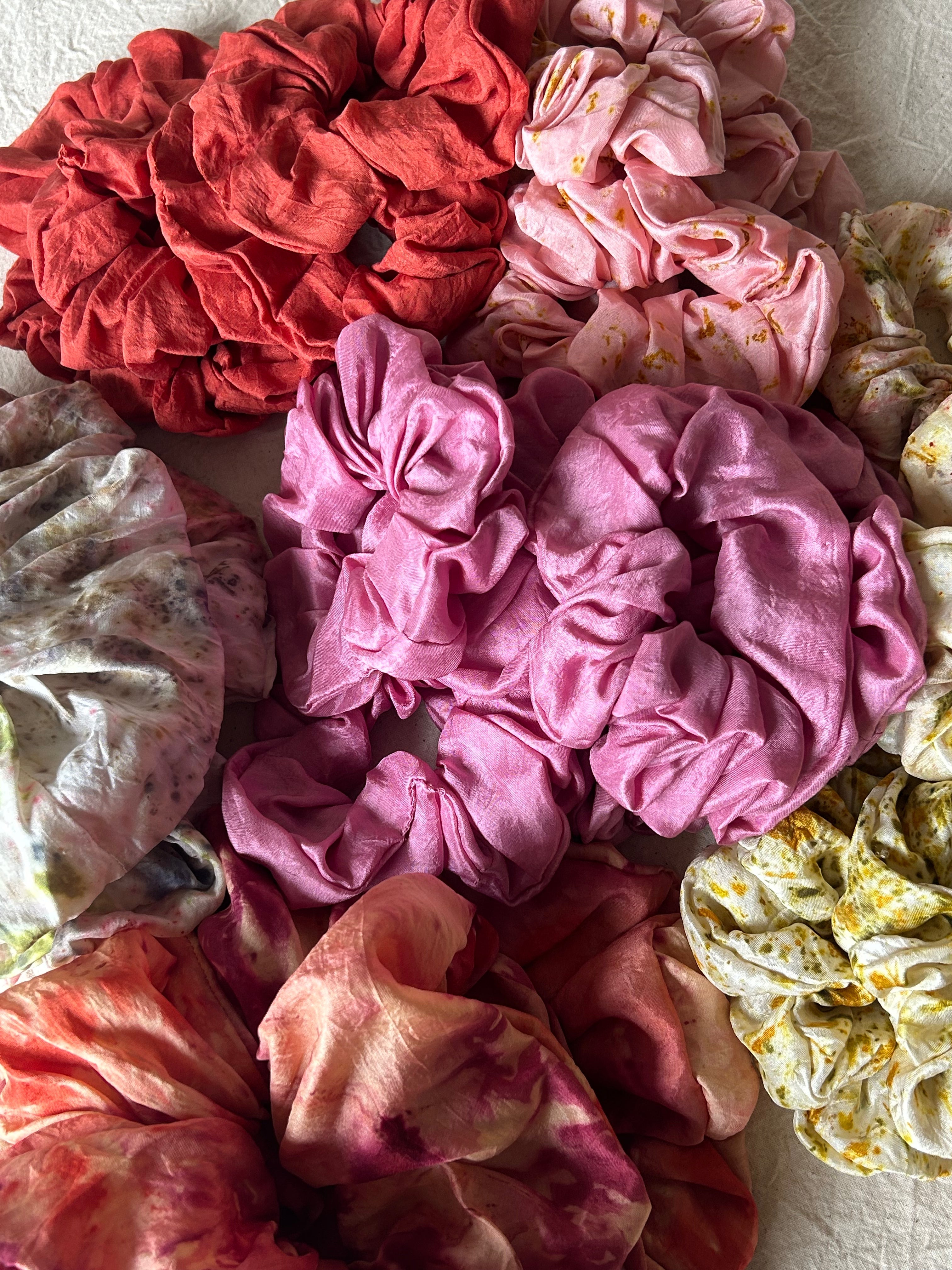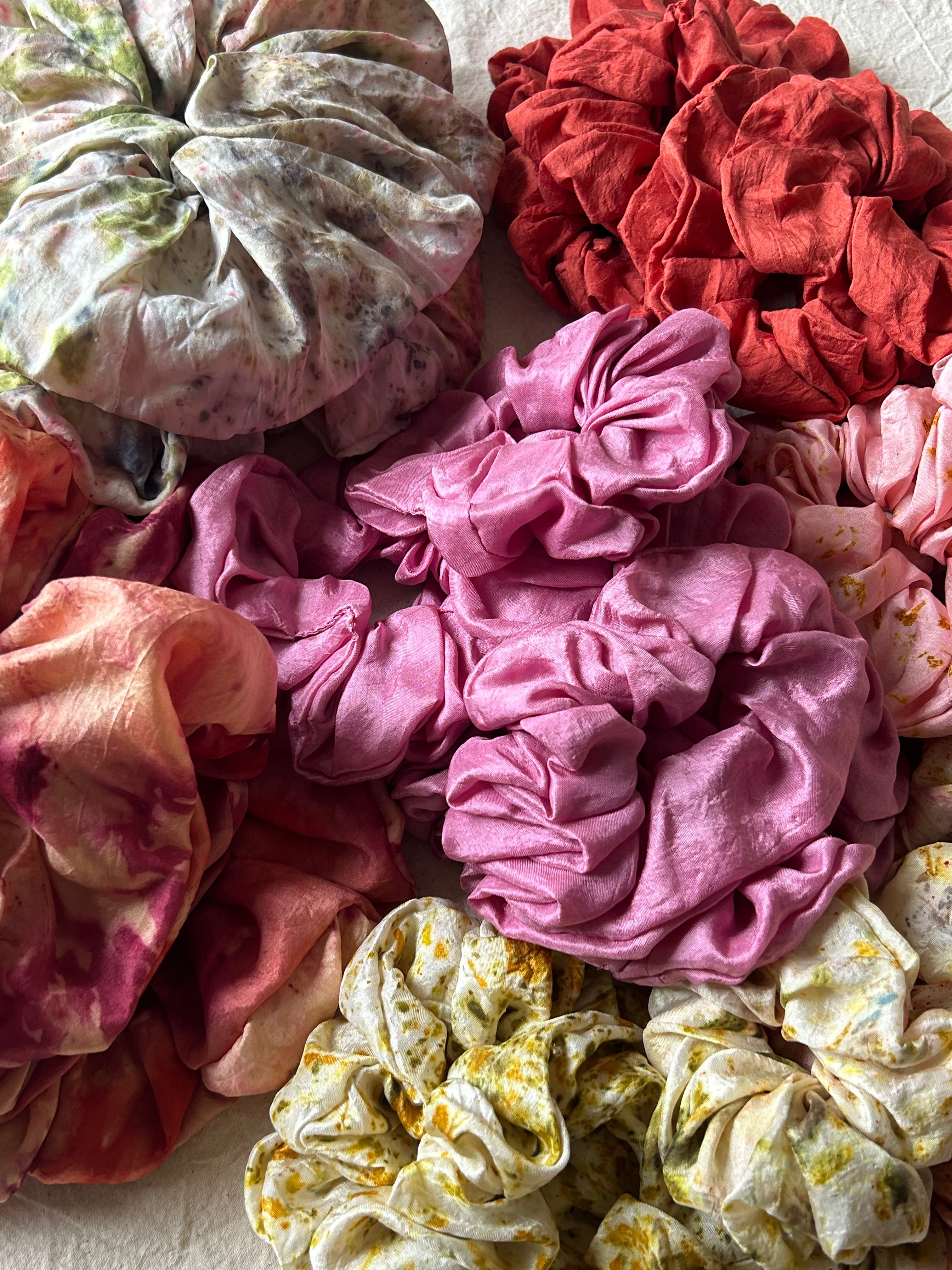 Silk scrunchies are kind to your hair and prevents breakage. Our silk scrunchies are plant dyed which kind to the environment as well.