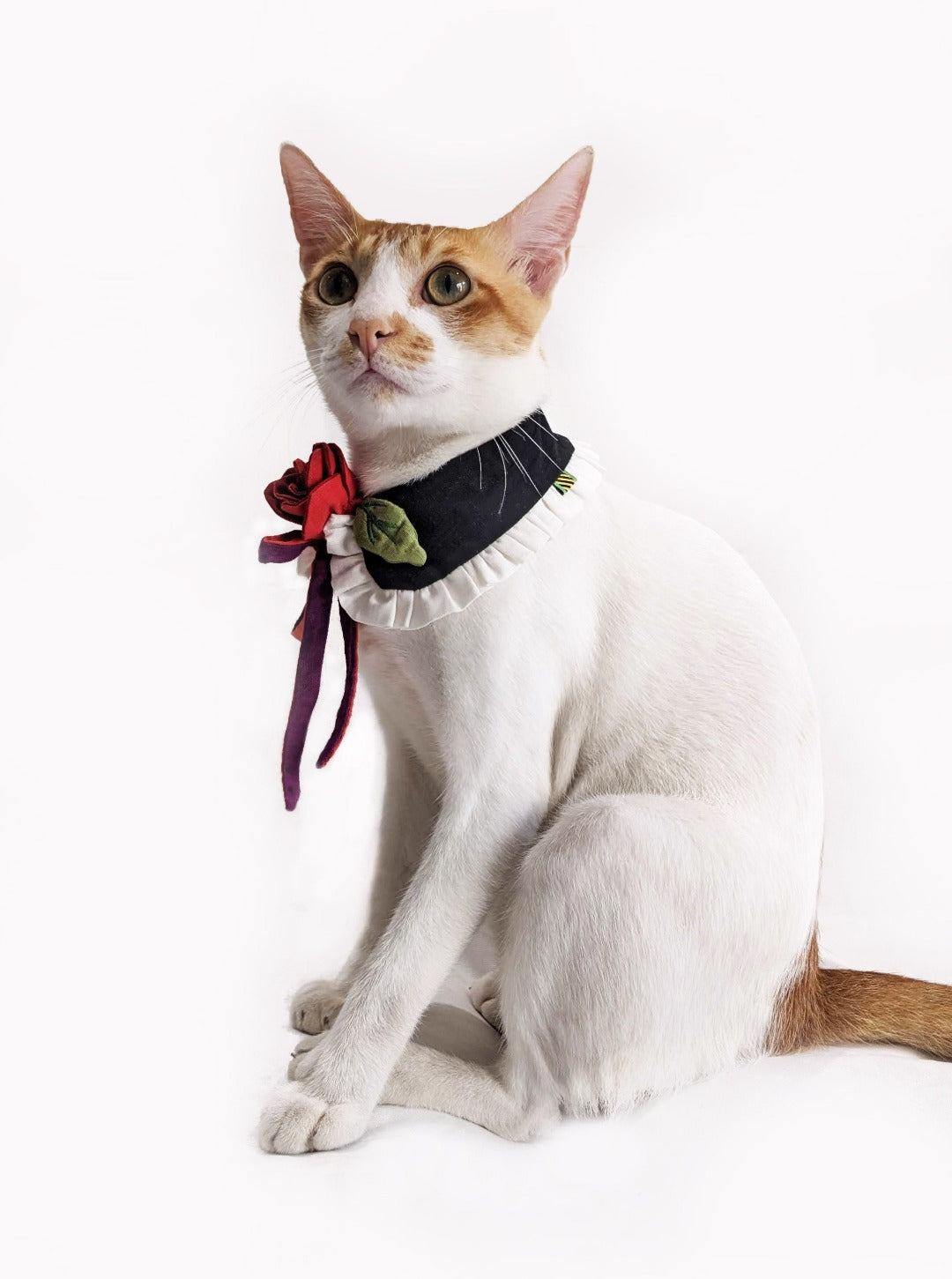 The collar has a lovely white ruffle and a completely handcrafted, hand stitched red button rose, two puffy, 3D, hand stitched, machine embroidered leaves. You can slide the rose up and down the straps to close and open the collar and then tie a sweet little bow 😭 and its fully lined so its soft and comfortable for the meow meow too <3