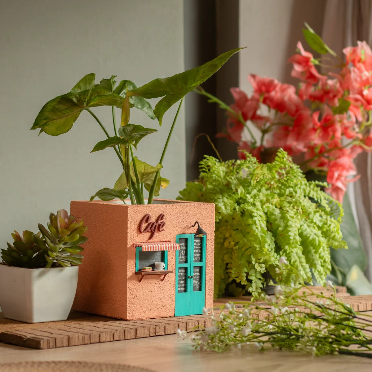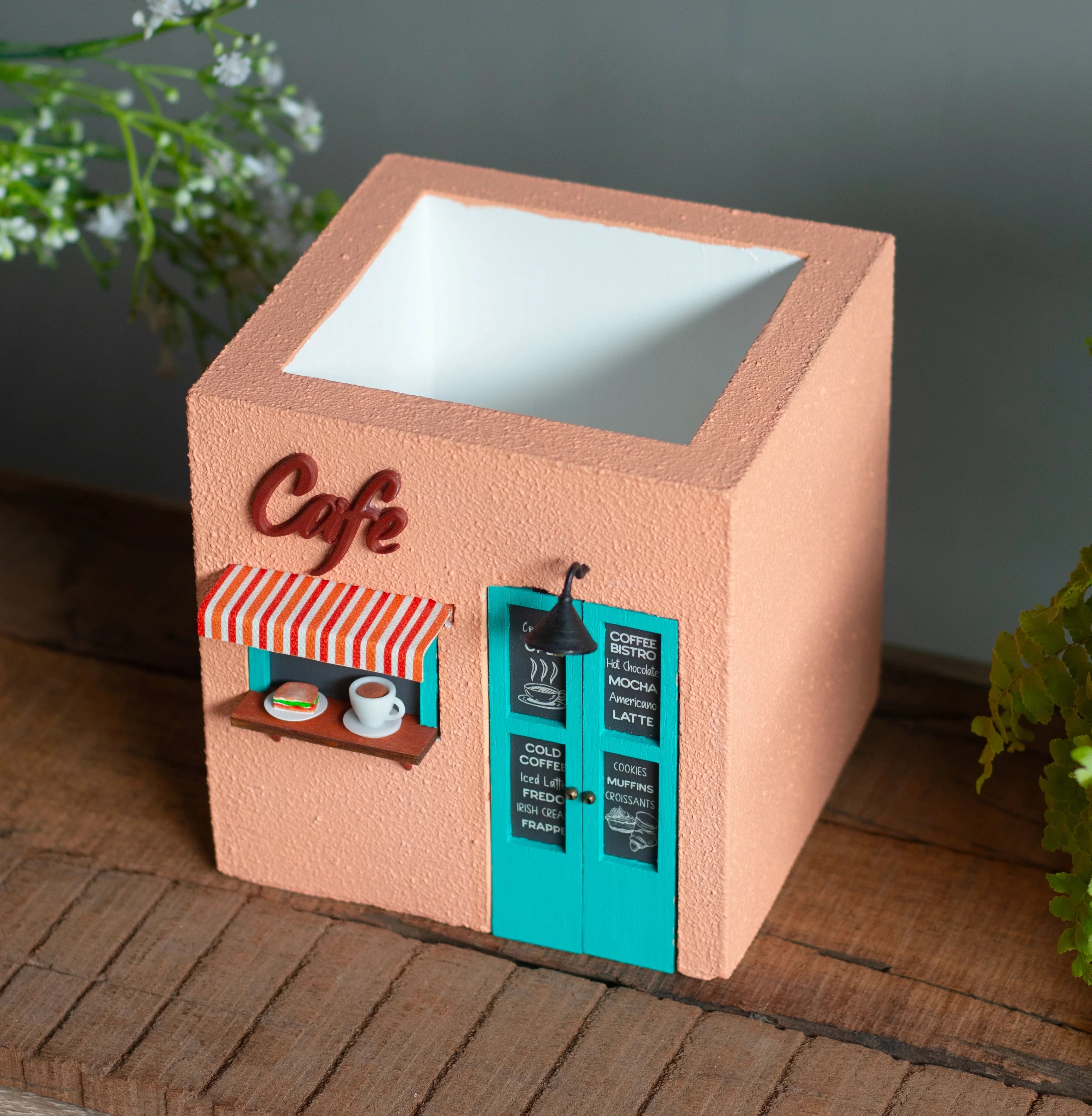 Infuse your space with the charm of a cozy cafe with the Cafe Planter (Peach & Teal). This beautifully designed planter features a textured stucco finish and intricate miniature details, making it the perfect home for small plants, succulents, or artificial flowers.