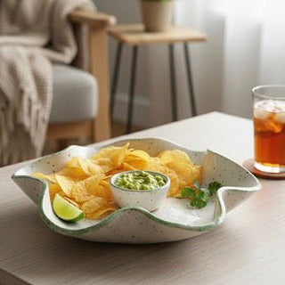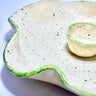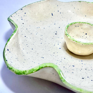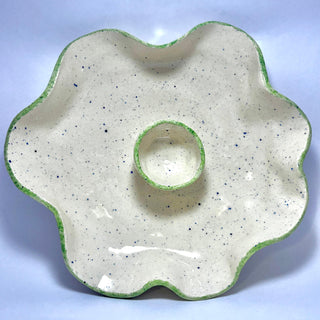 The festive season brings guests and loved ones along with it, and this chip 'n' dip platter is the perfect tableware for you to pull out for your table setting. Easy to handle and clean and shaped like a blooming flower, the handcrafted design is finished with a charming speckled off-white glaze and a bold, vibrant green rim that adds a pop of color to any occasion. Perfect for presenting appetizers, snacks, or desserts, this unique plate will impress your guests at gatherings, parties, or everyday meals. Approximate size: 10 inches in diameter. As each piece is handmade, slight variations in color and shape are to be expected.
