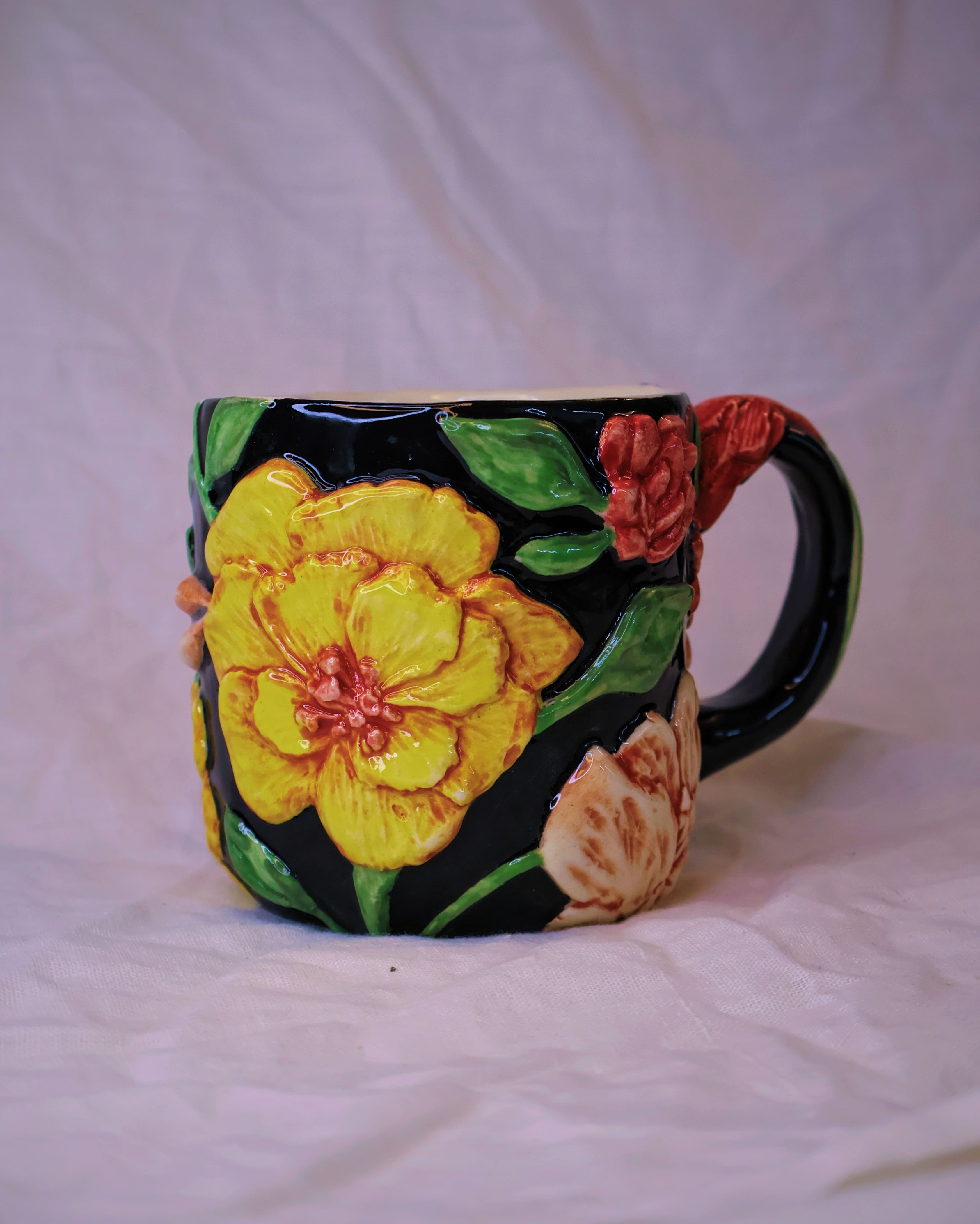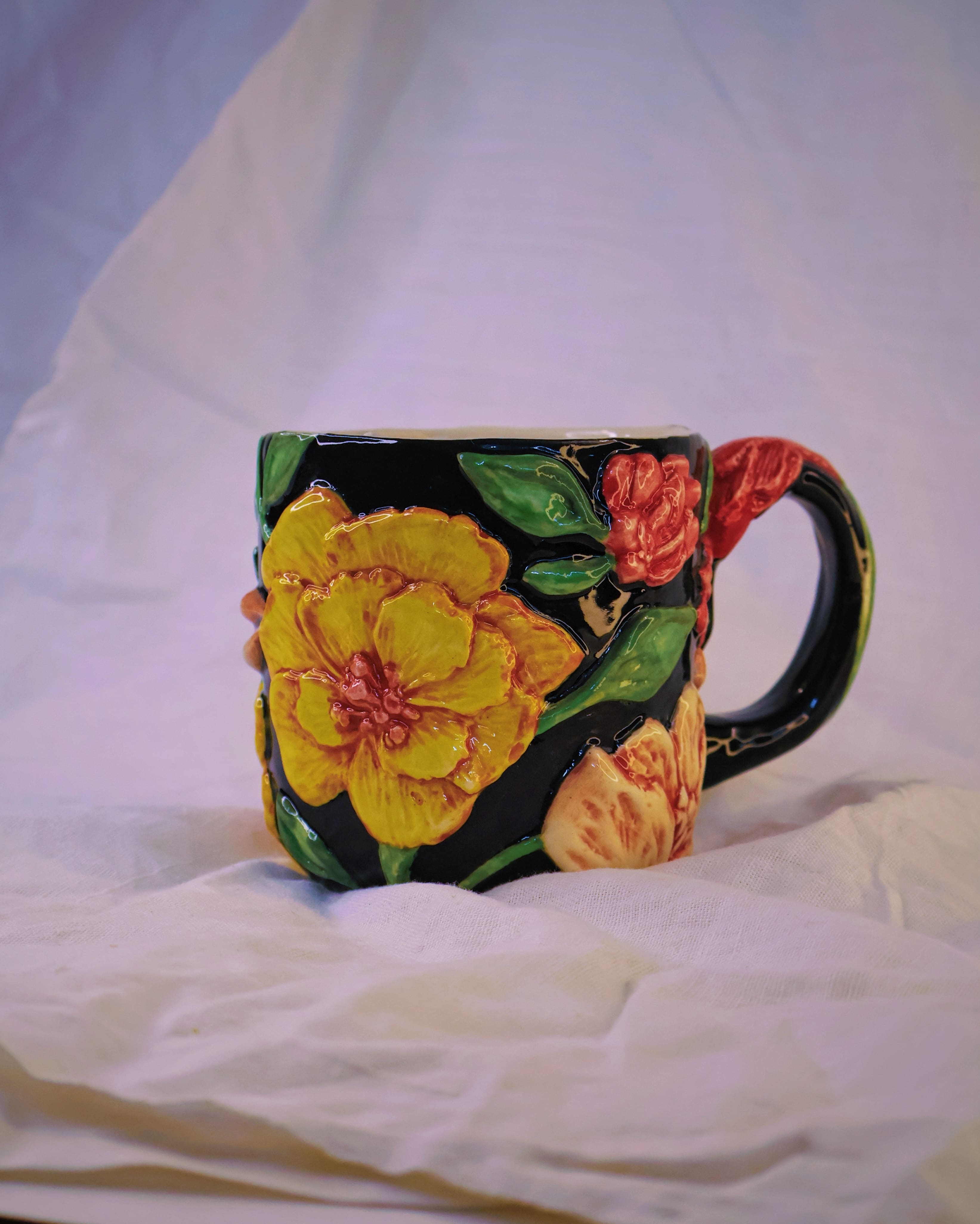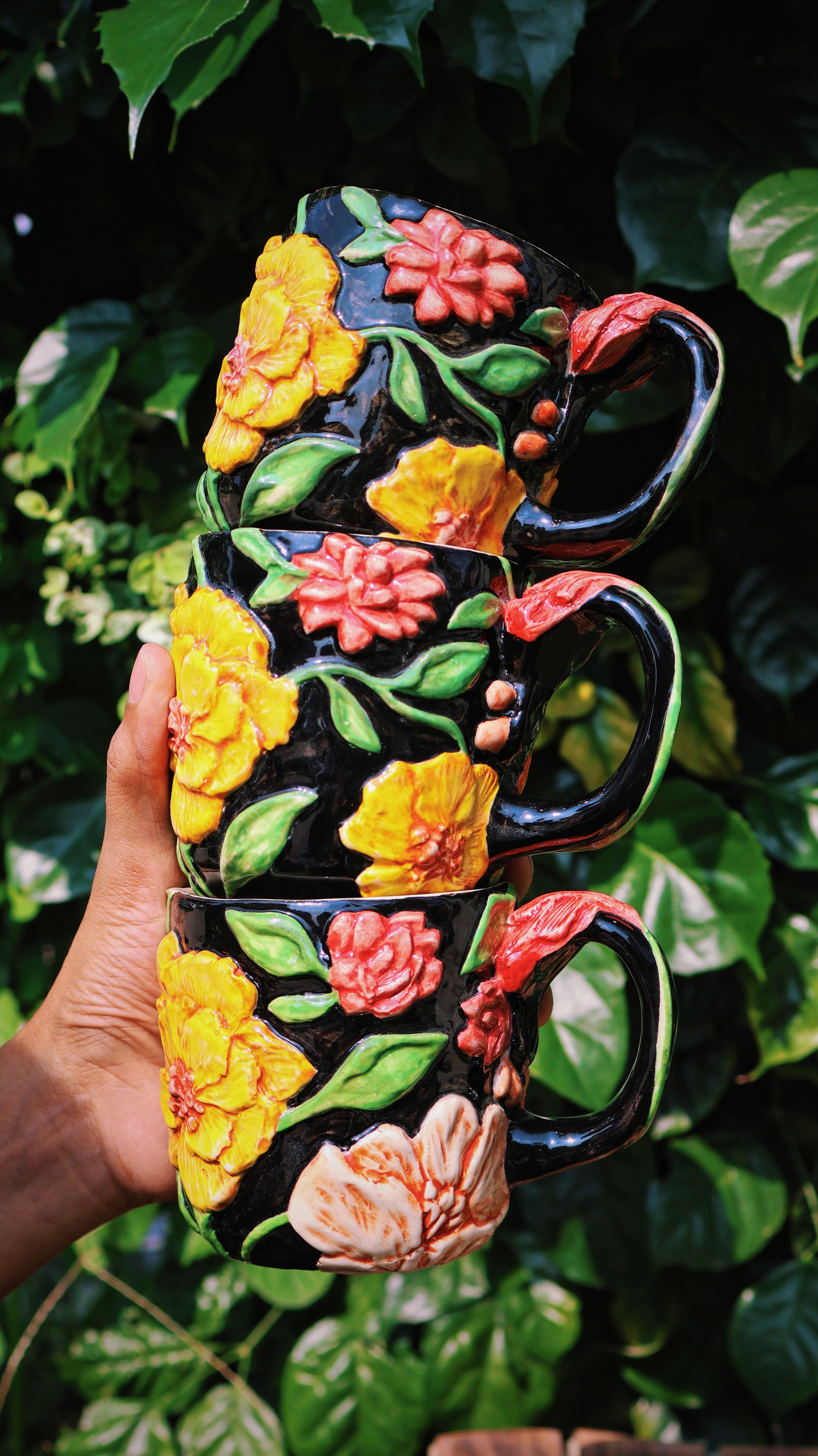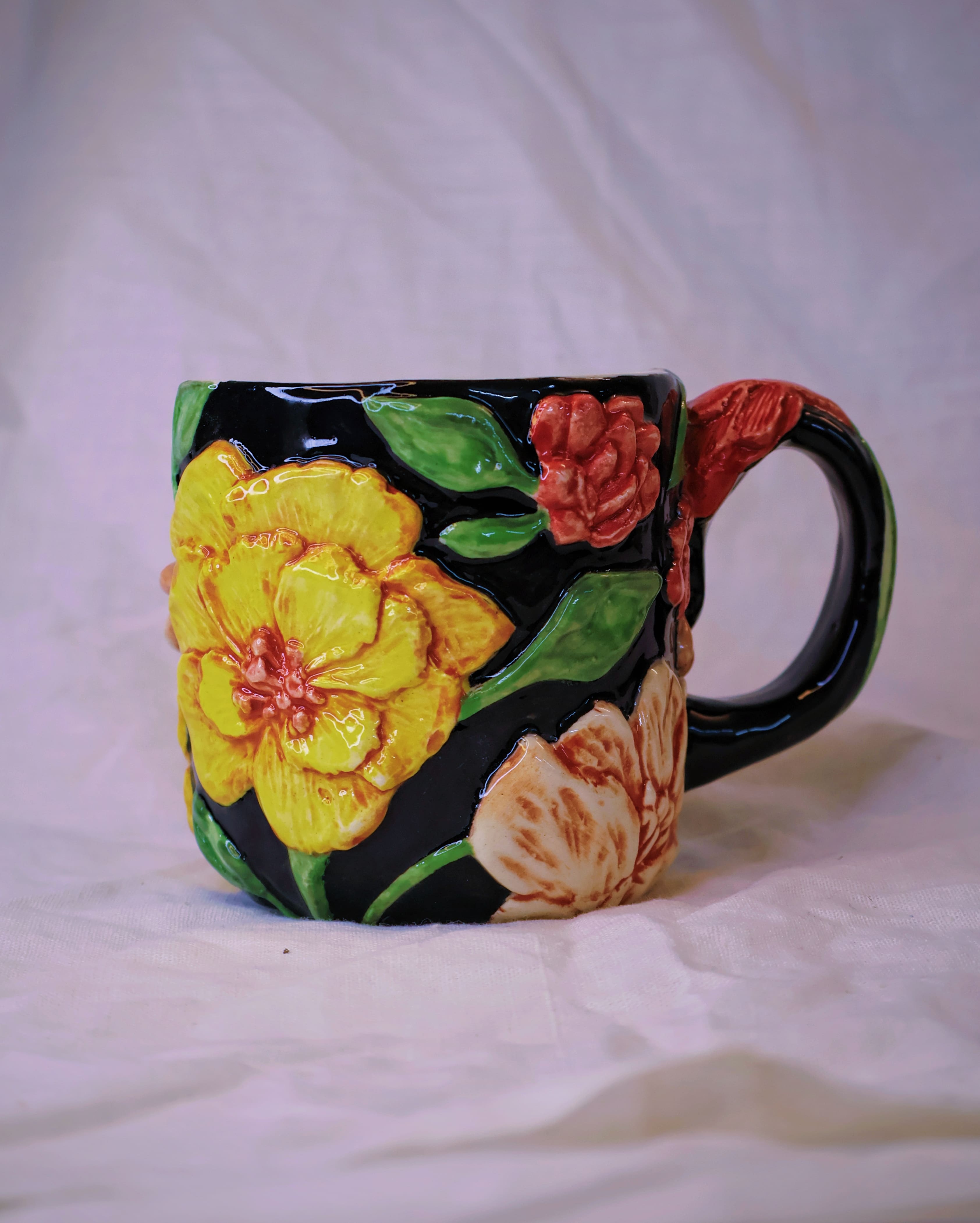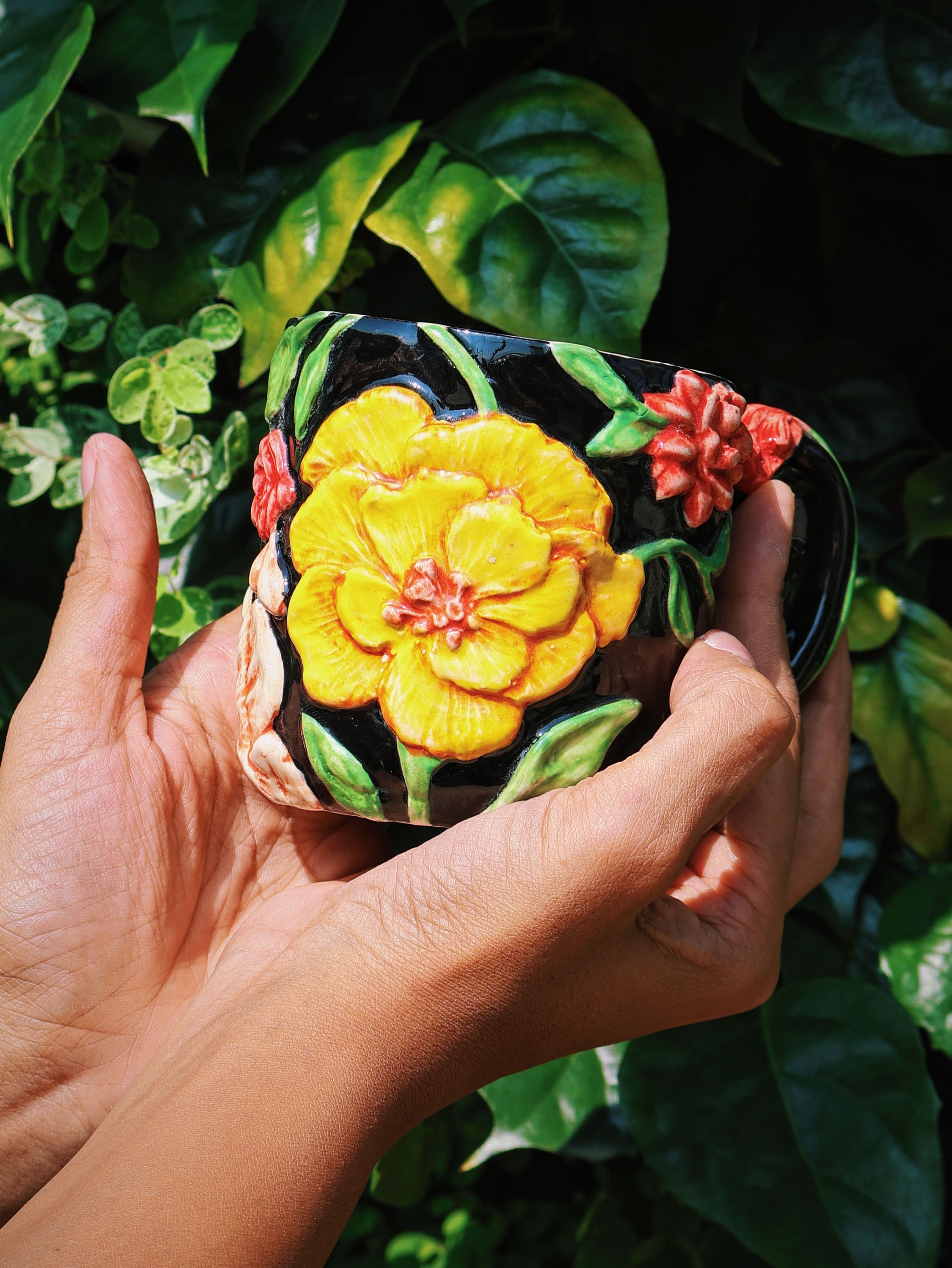 Hand-sculpted with care and painted in radiant detail, this ceramic mug transforms your everyday sip into something quietly extraordinary. Each flower is brought to life in bold relief—the golden yellow petals opening wide like a morning sun, the deep coral blossoms adding warmth, and soft ivory blooms resting gently against a glossy black backdrop. Together, they create a garden that never fades.The raised textures invite touch, reminding you of the craftsmanship behind every curve and brushstroke. Perfect for tea, coffee, or even just sitting beautifully on your shelf, it carries both charm and refinement.