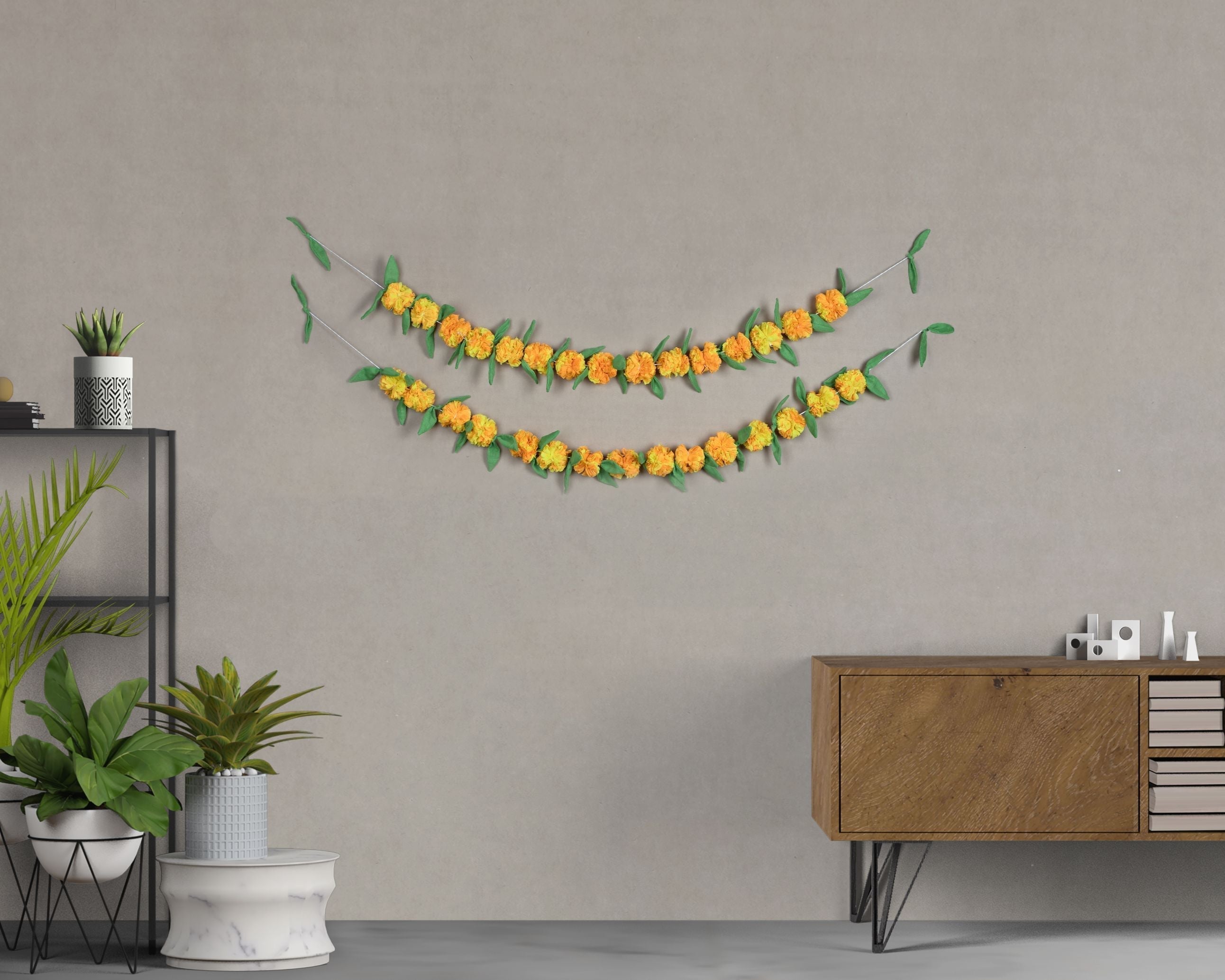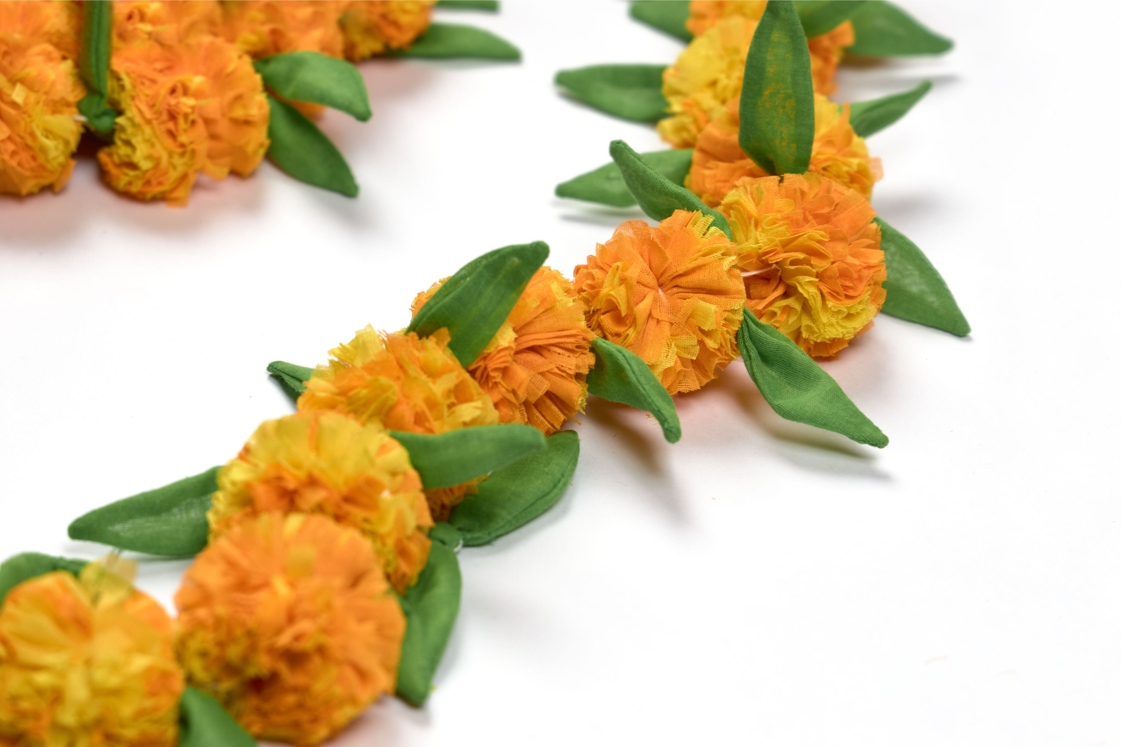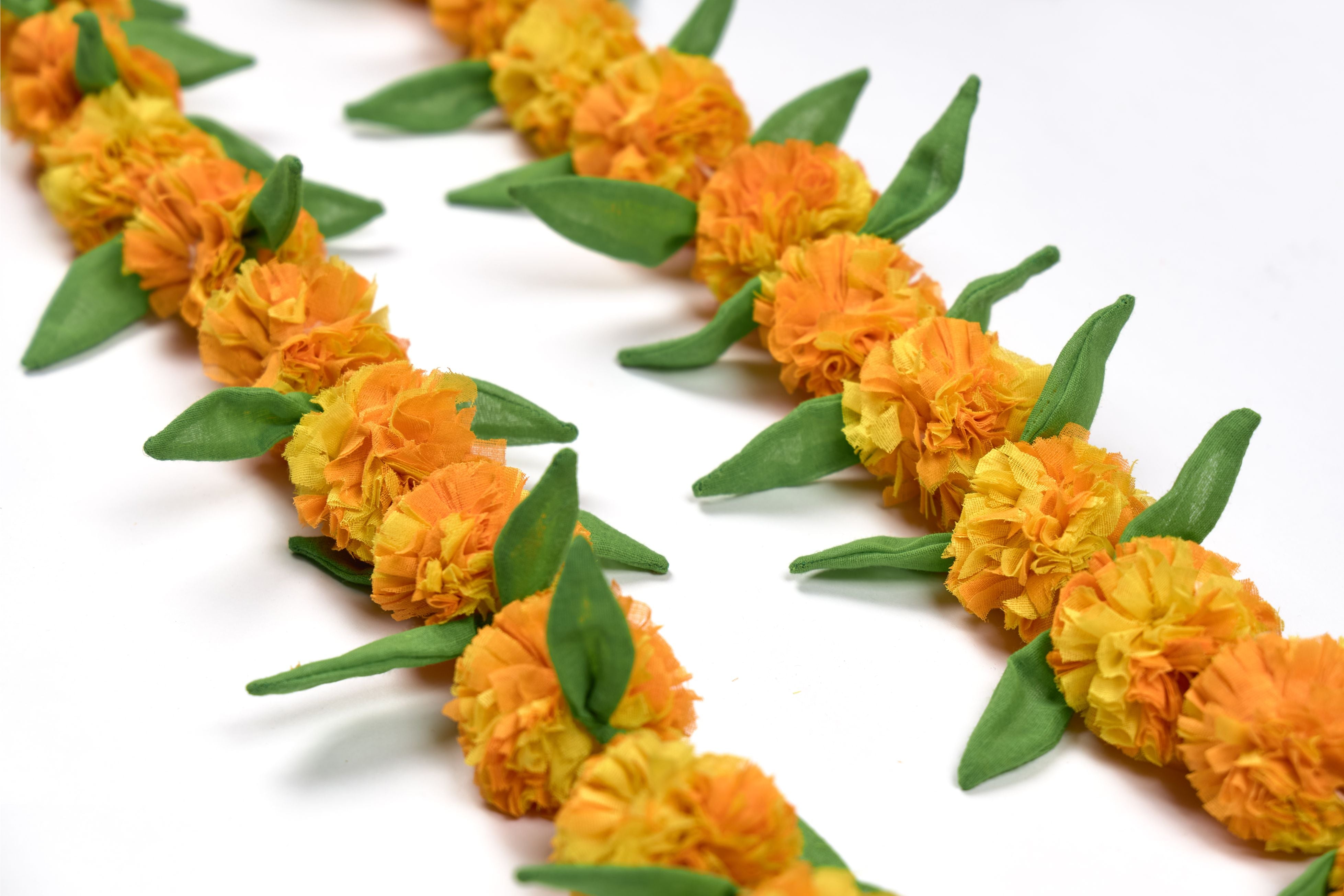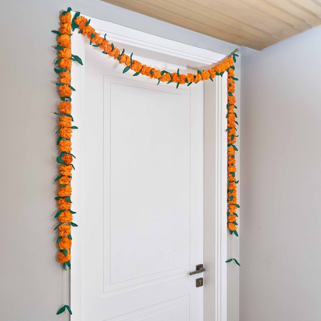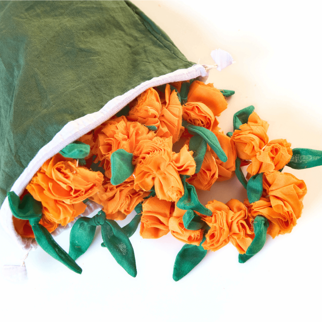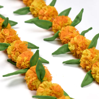 Our Upcycled Handmade Genda/Marigold Cloth Flower Garland String gives a colourful and festive makeover to your living space while championing the cause of sustainability. With each flower and leaf intricately crafted and assembled into place, this string radiates a seamless blend of artistry and eco-friendliness in every petal.
