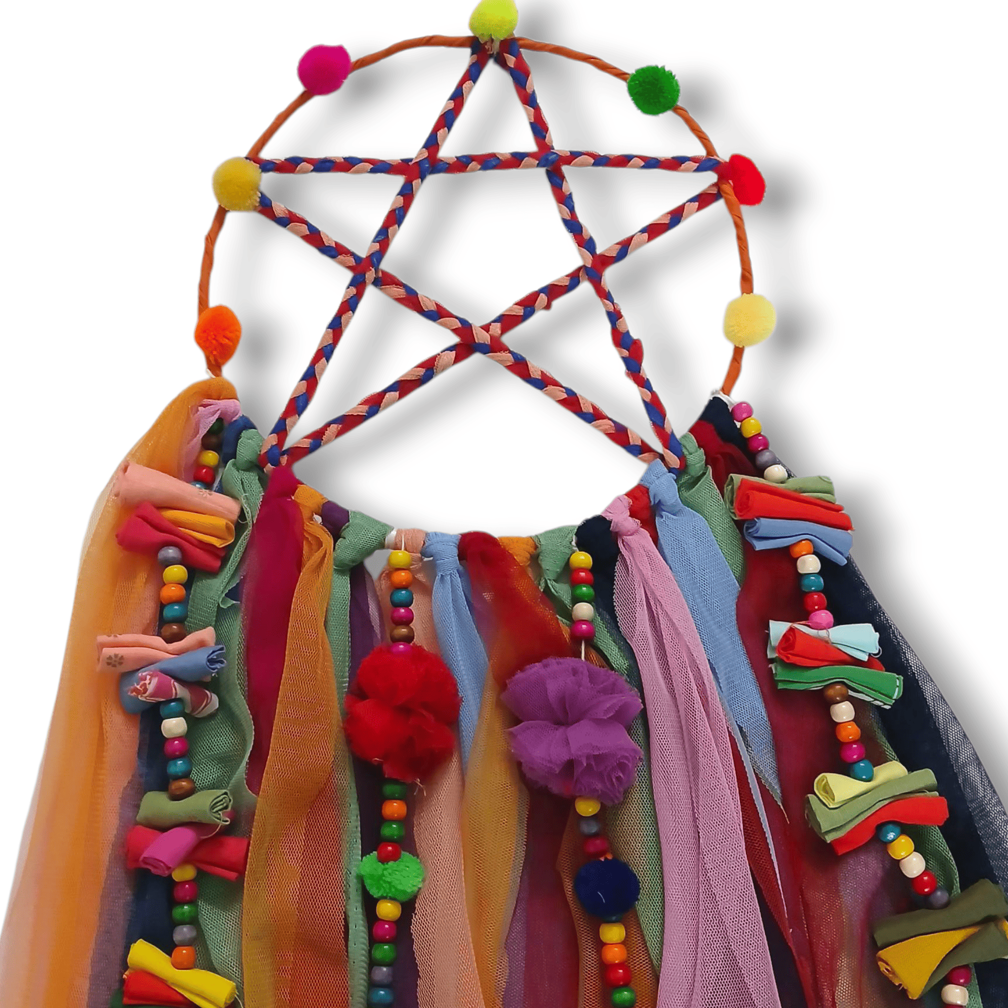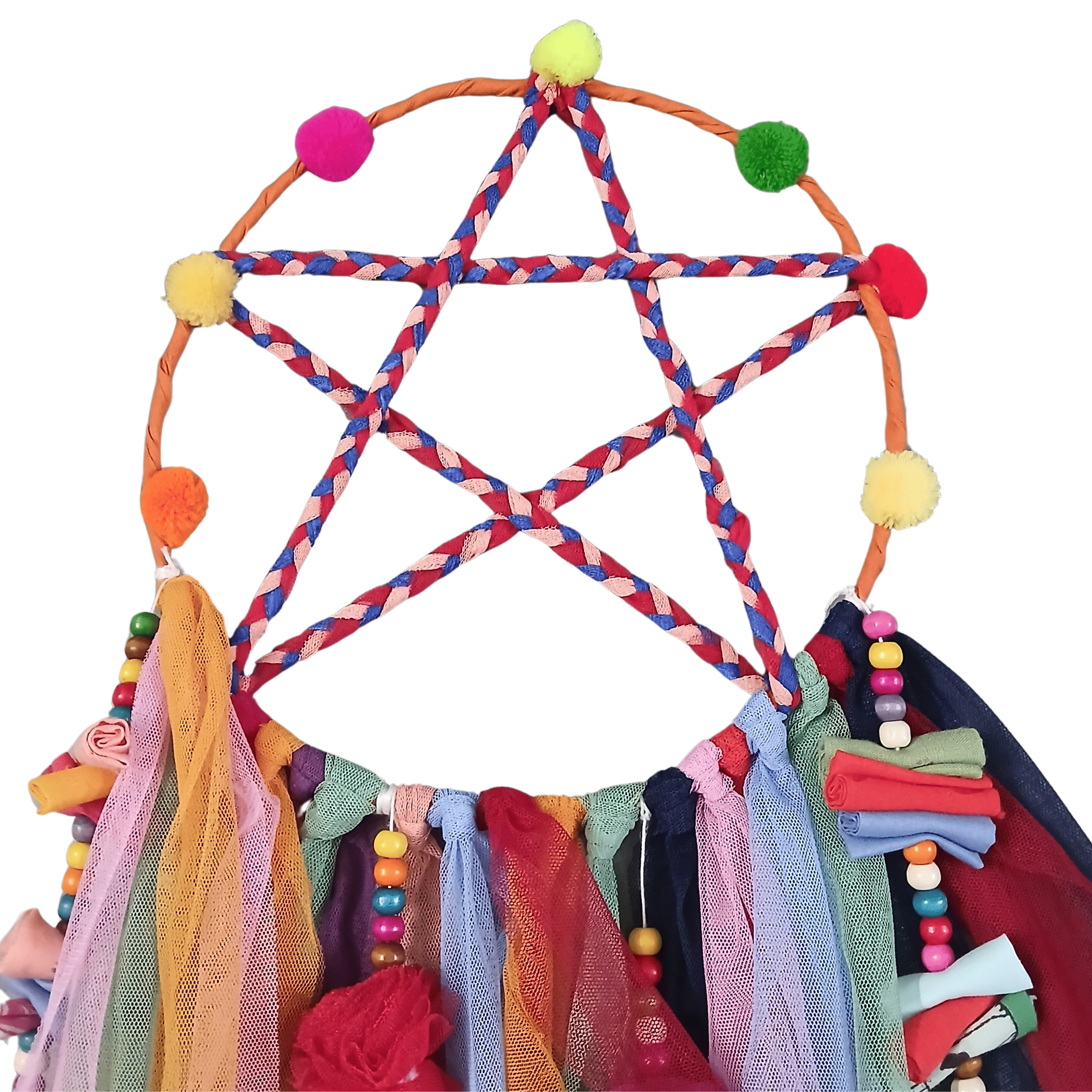 Imagine walking into your room, welcomed by the magical allure of the 'Star' Dreamcatcher adorning the room. Its intricate and detailed design, meticulously crafted from fabric scraps and pom-pom, transforms you into a world where imagination and peace thrive.