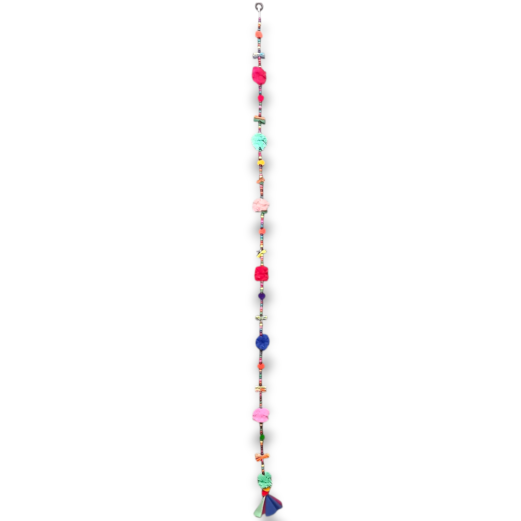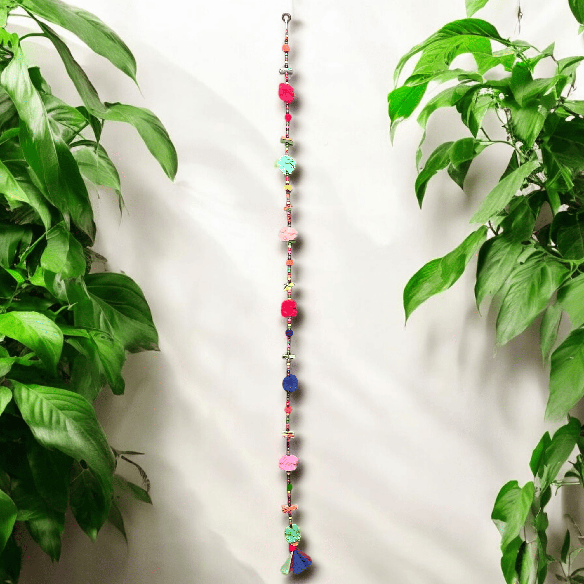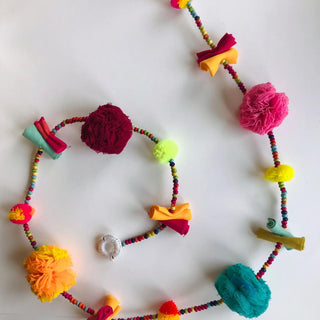 Upcycled Tinker Pom-Pom Festive Decoration String, the perfect choice for eco-conscious celebrations. Handcrafted with handmade pom pom and wooden beads, these sustainable and reusable decorations add a whimsical touch to your festivities. This Strings not only add a festive touch to your Festive decorations but also offers a sustainable and reusable alternative to balloons, all while being completely plastic-free.
