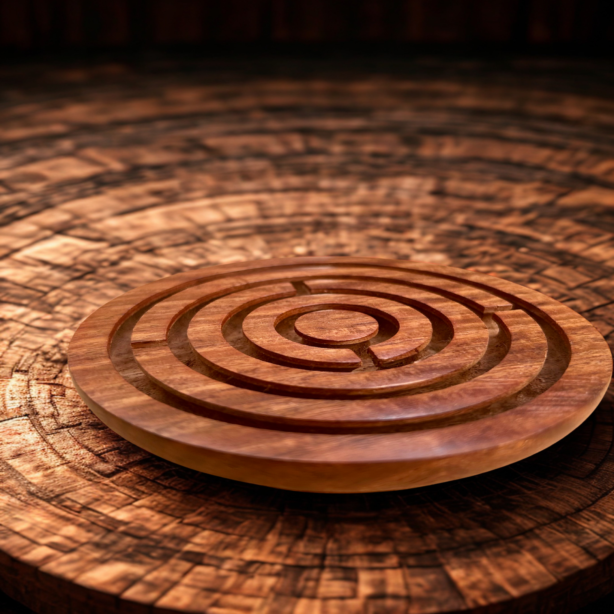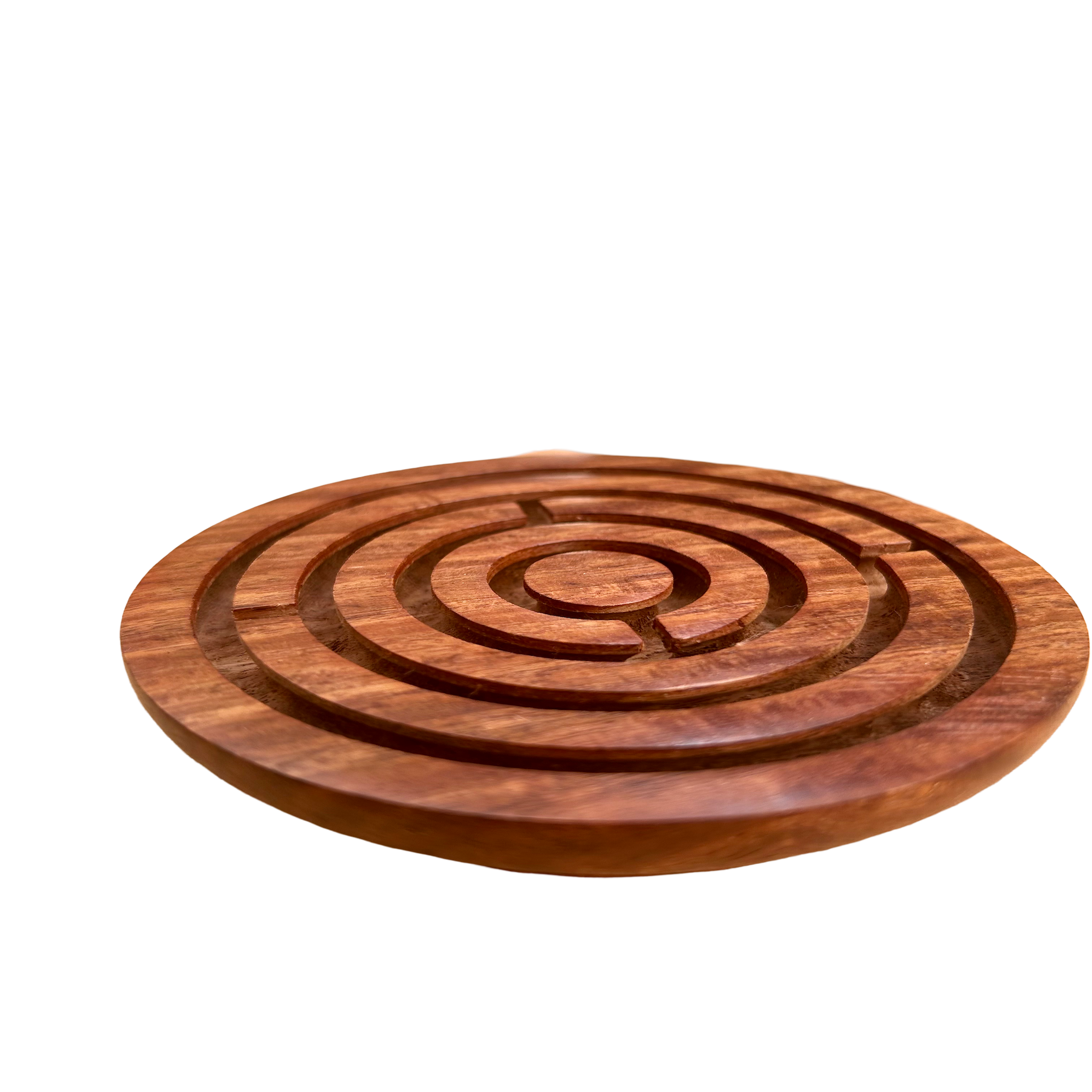 Our puzzle takes from the above principle. Crafted from rosewood, it represents a circular labyrinth that tests spatial reasoning and problem-solving skills.