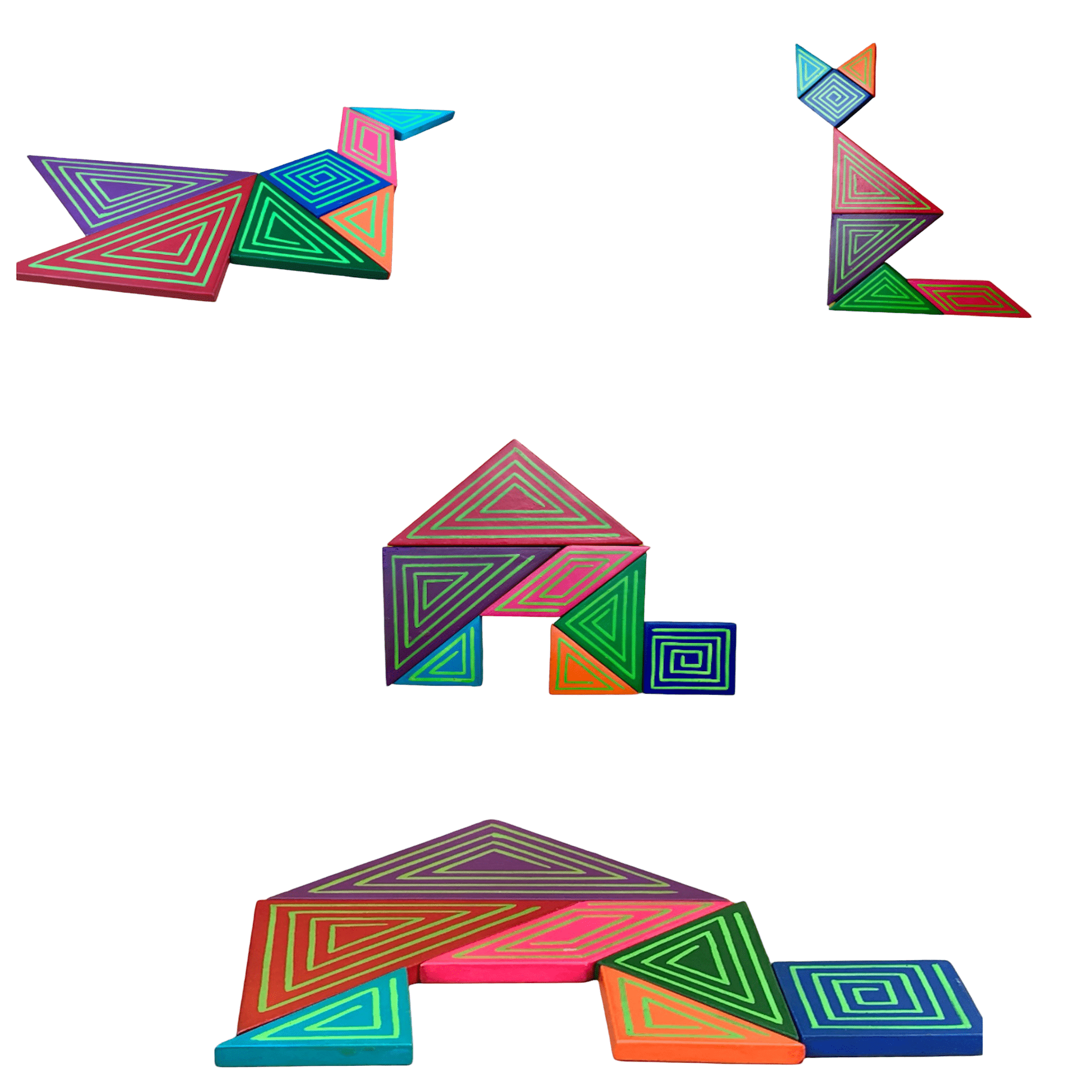 The puzzle is made up of seven pieces called tans which fit together to form a square. The individual pieces are-