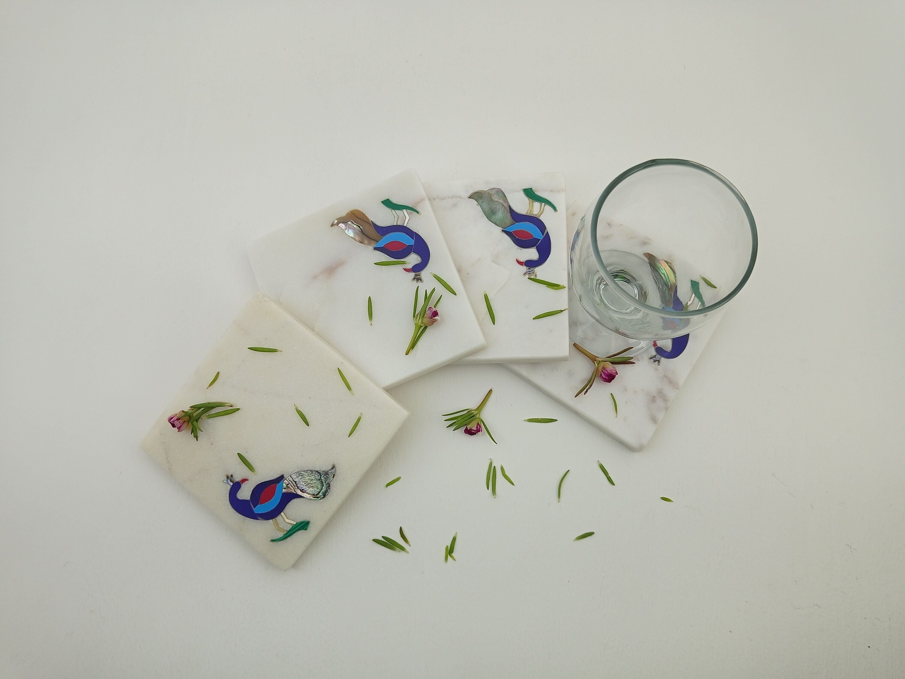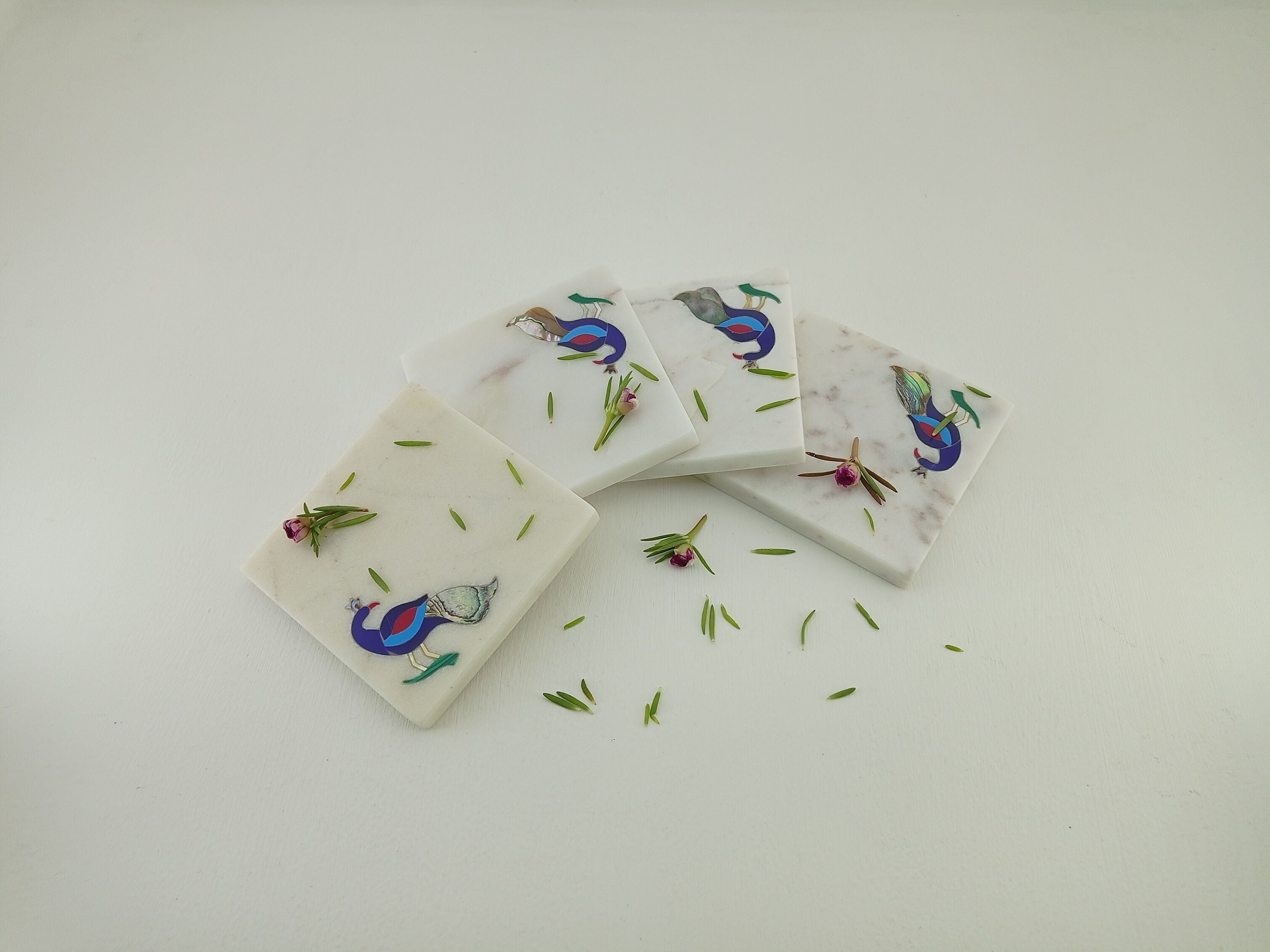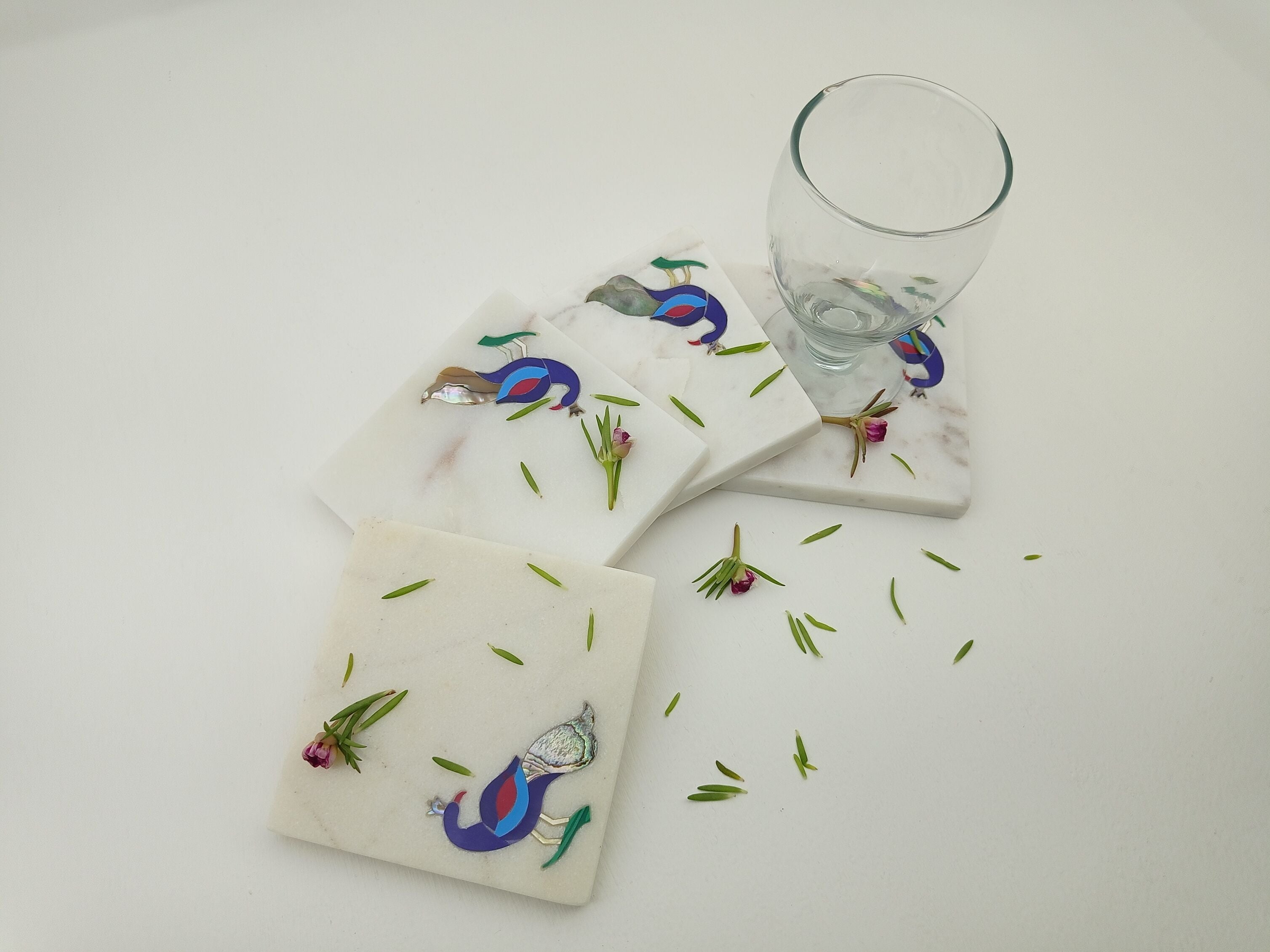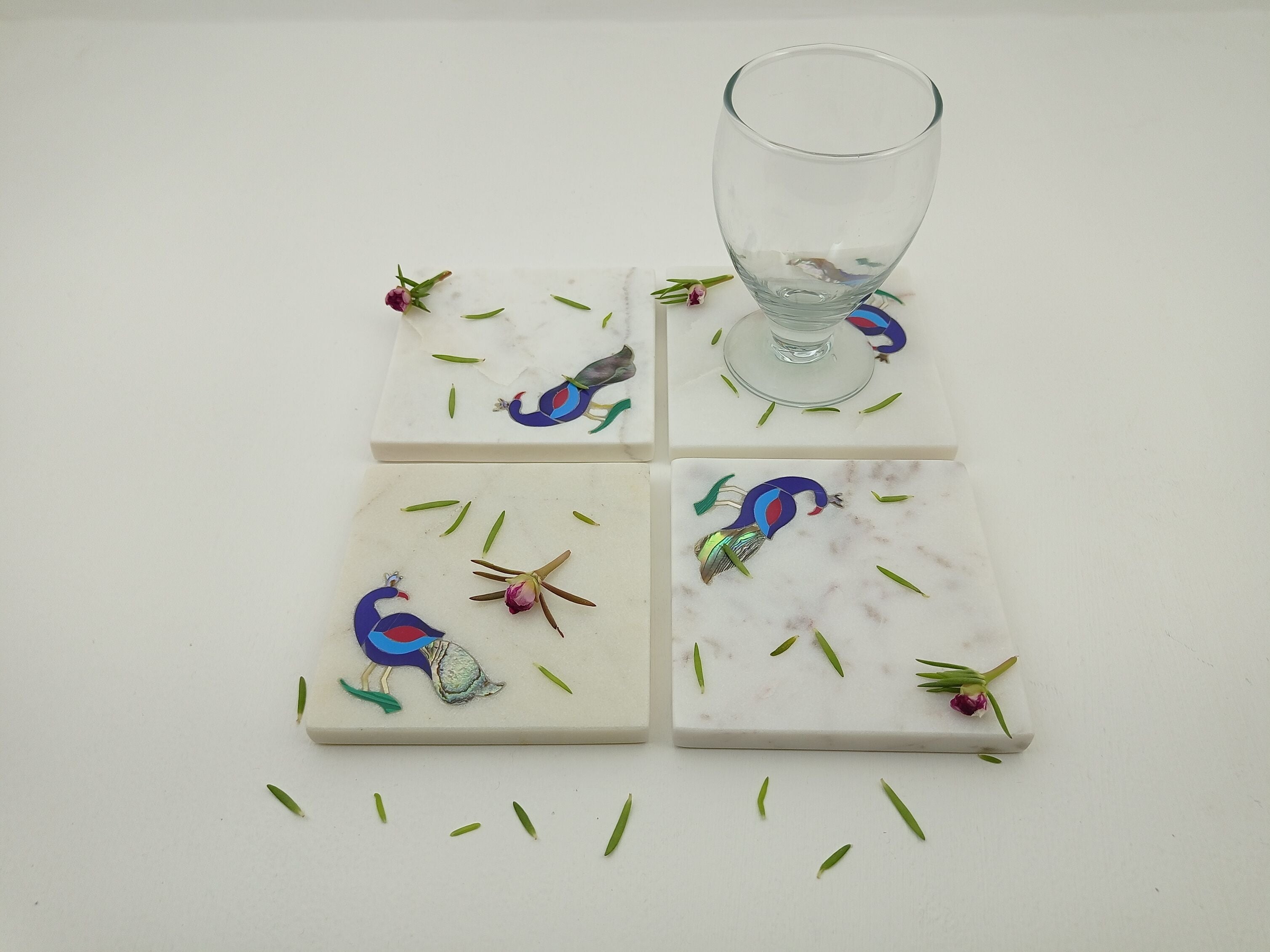 The natural patterns of the marble coasters gives an elegant look for your home decor. Convenience merges with peacock design to bring you this set of Marble coasters that let you place your hot mugs without the fear of surface damage. This coaster protects the table from scratches and wet marks. Use outdoors & indoors perfect for the daily use and cocktail parties! Won't be damaged by water or sun exposure. Made from the highest quality marble which is water resistant and easy to maintain. So many delightful semi-precious stones meet to create a unique peacock on these White Marble Inlay Coasters - Set of 4 - peacock inlay An art object in itself, each piece will add an artistic flair to the setting while you make fond memories around the table and bring a charming touch to tables, counters & bar tops. You can buy online or do shopping with us. Make your gifts memorable with set of 4 pcs of marble coasters. More than just a protective layer to support your morning cup of joy or preferred beverage, this beautiful coaster offers a personalized accent piece to your living room look and beyond! You will be happy to not only own one for yourself, you would also be happy to gift it to your friends and family, on any occasion, any time of the year. Easy to clean and maintain.