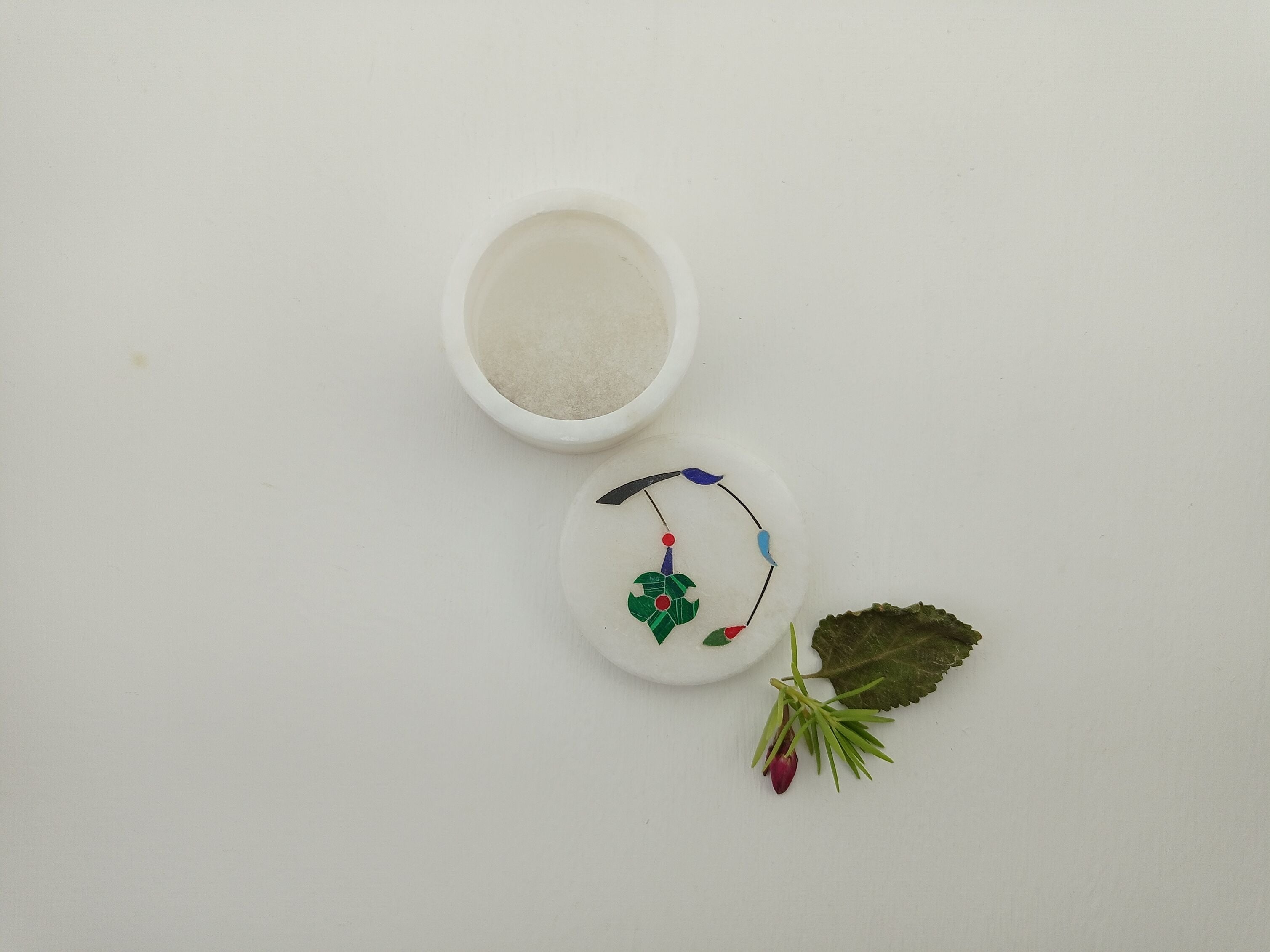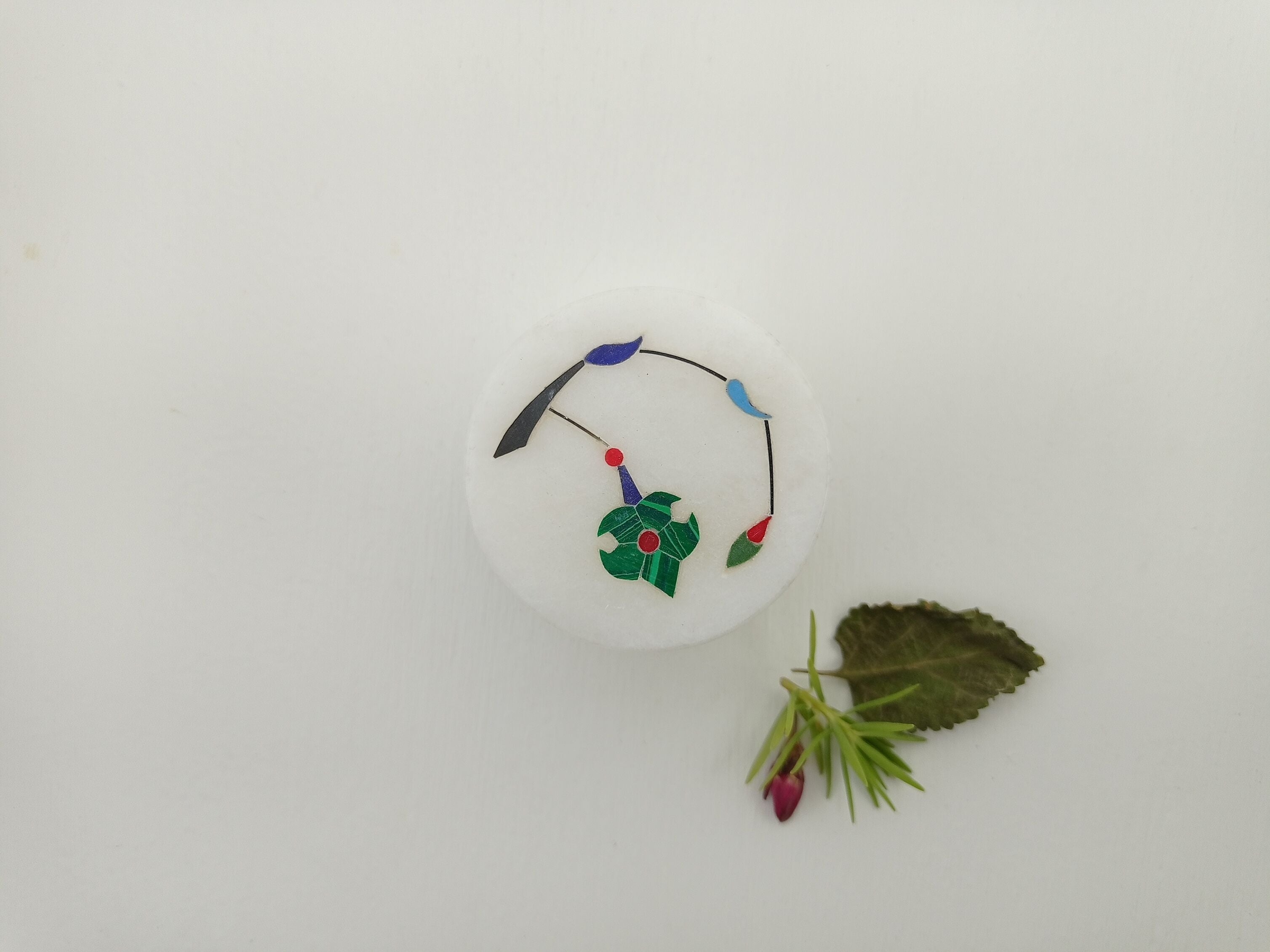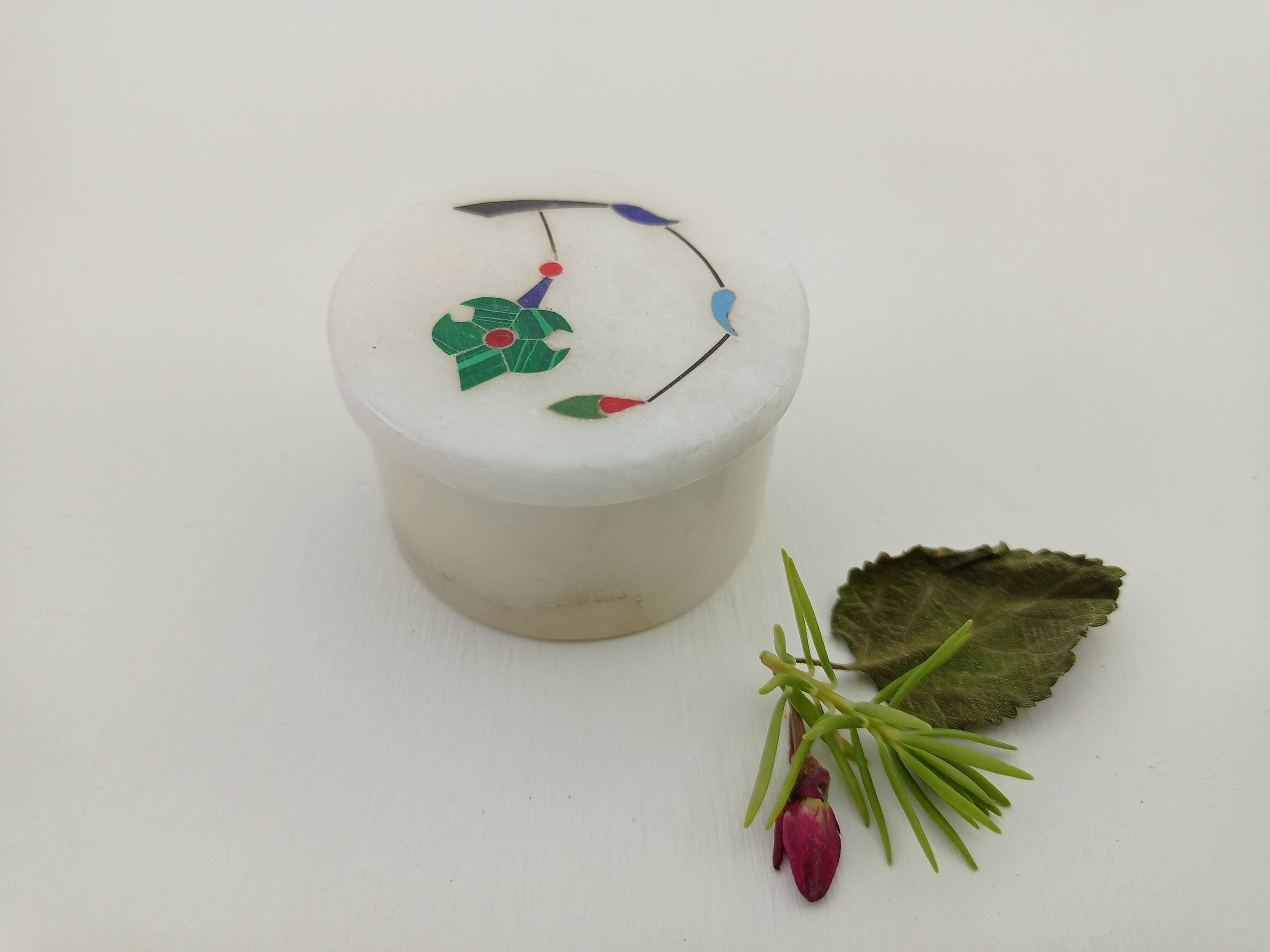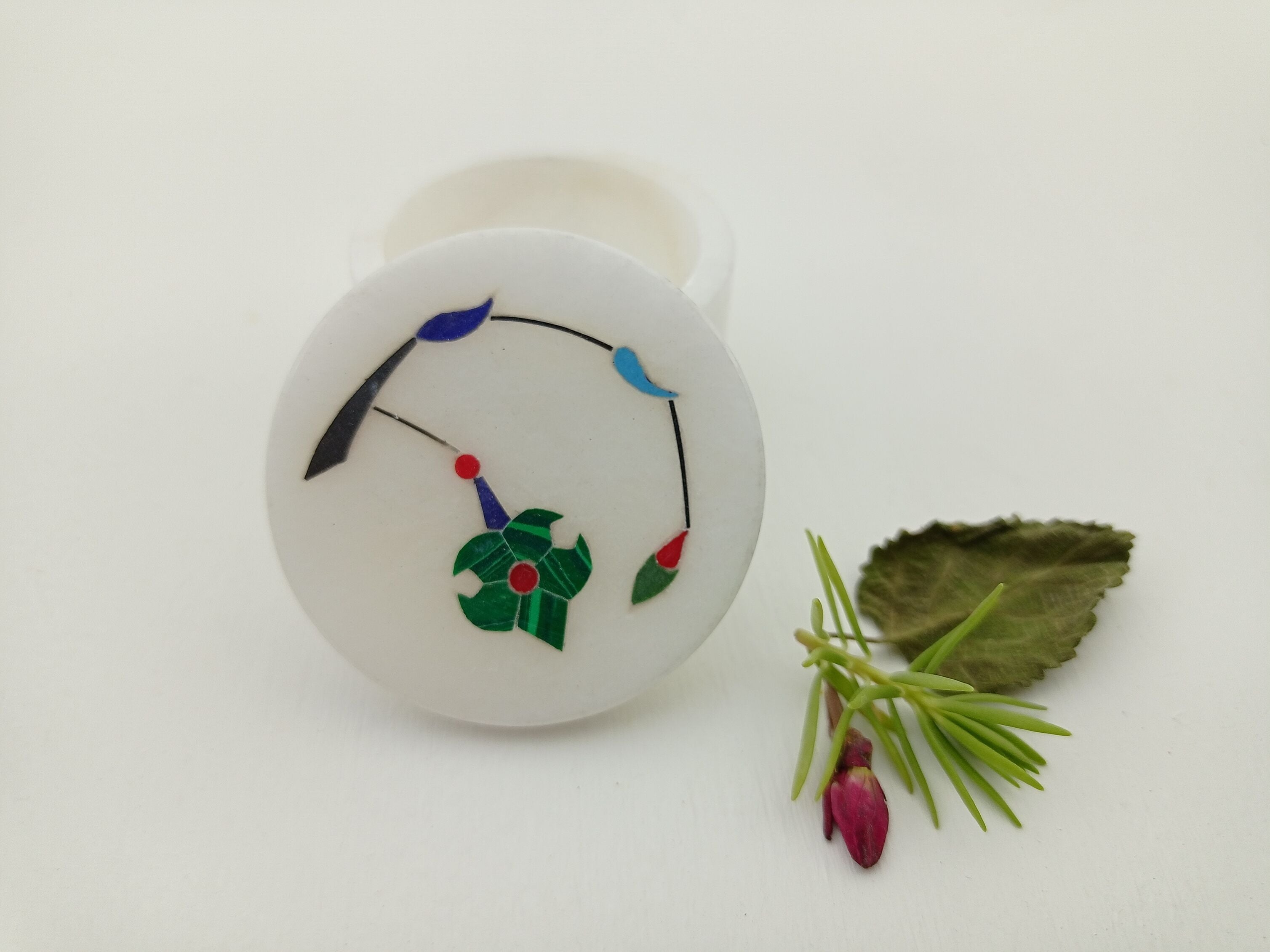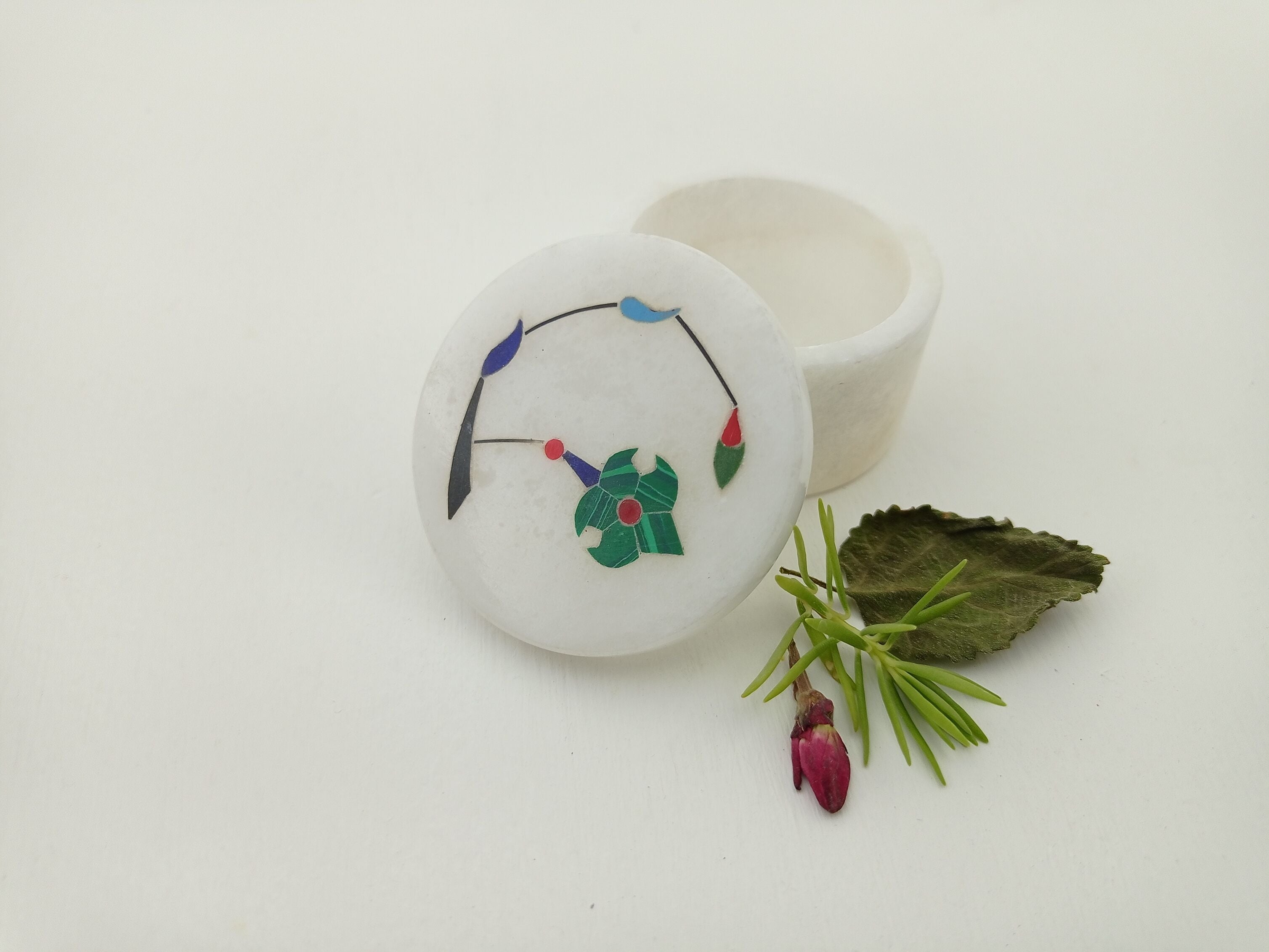 Featuring a beautiful Alabaster stone jewellery box in multiple colours crafted by the hardworking artisans of Agra. The inlay work on the product, with hues of multicolor gives it an elegant feel. Not only can this piece be used for storing jewellery but can also be used to insert little knick-knacks or as a decorative item; a perfect gifting item for weddings or special occasions!