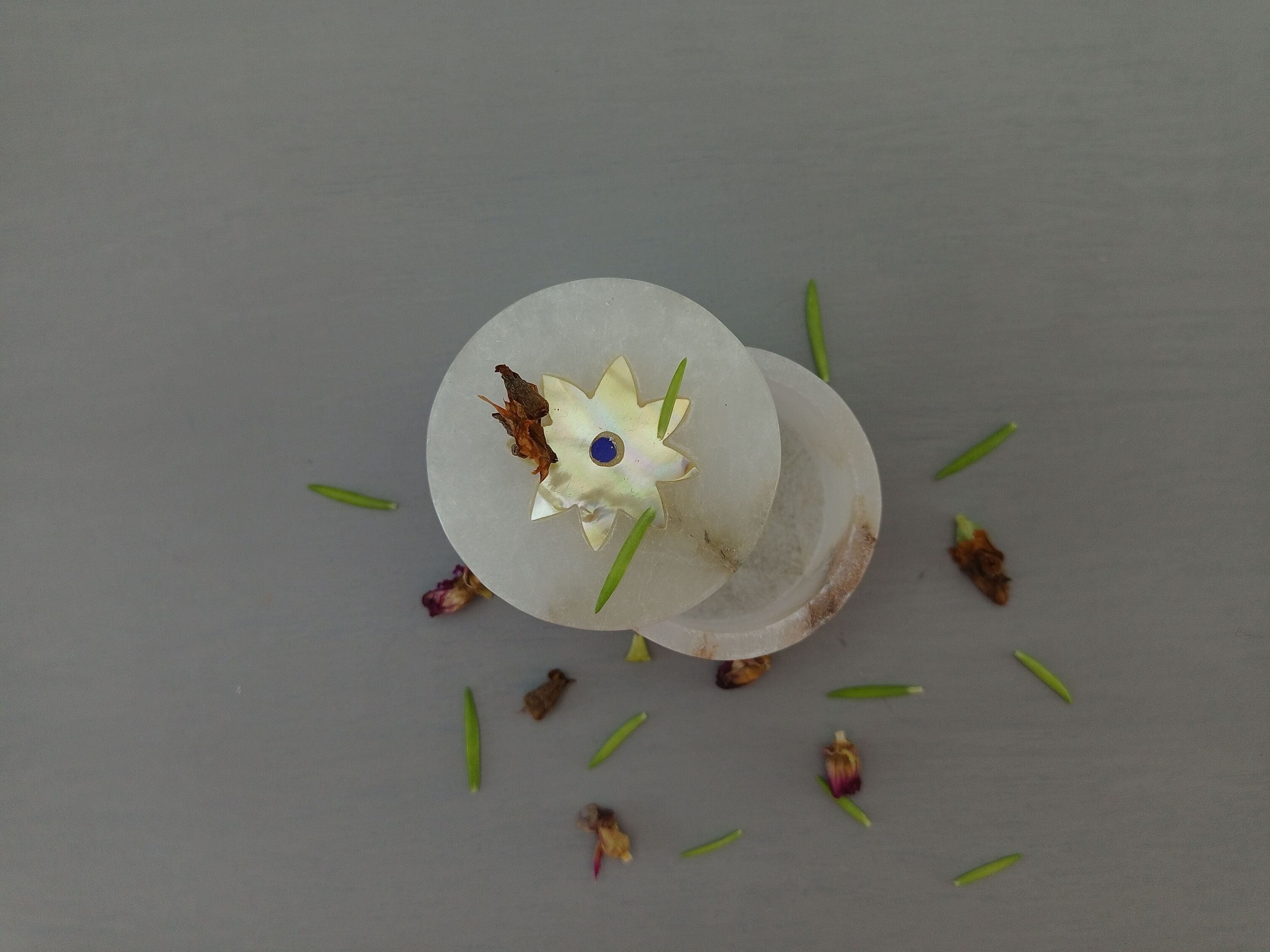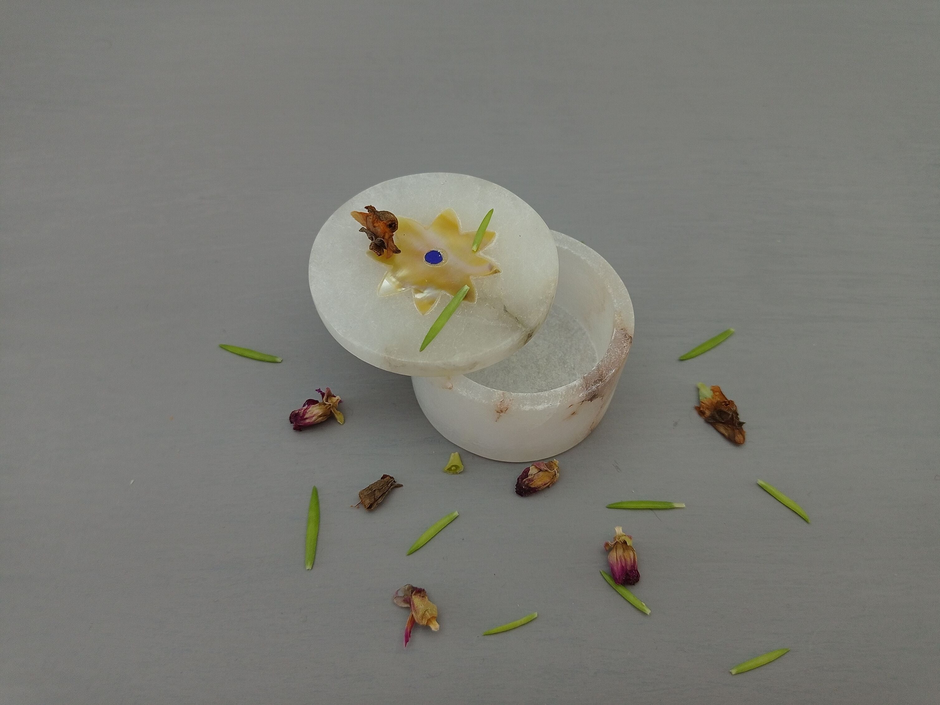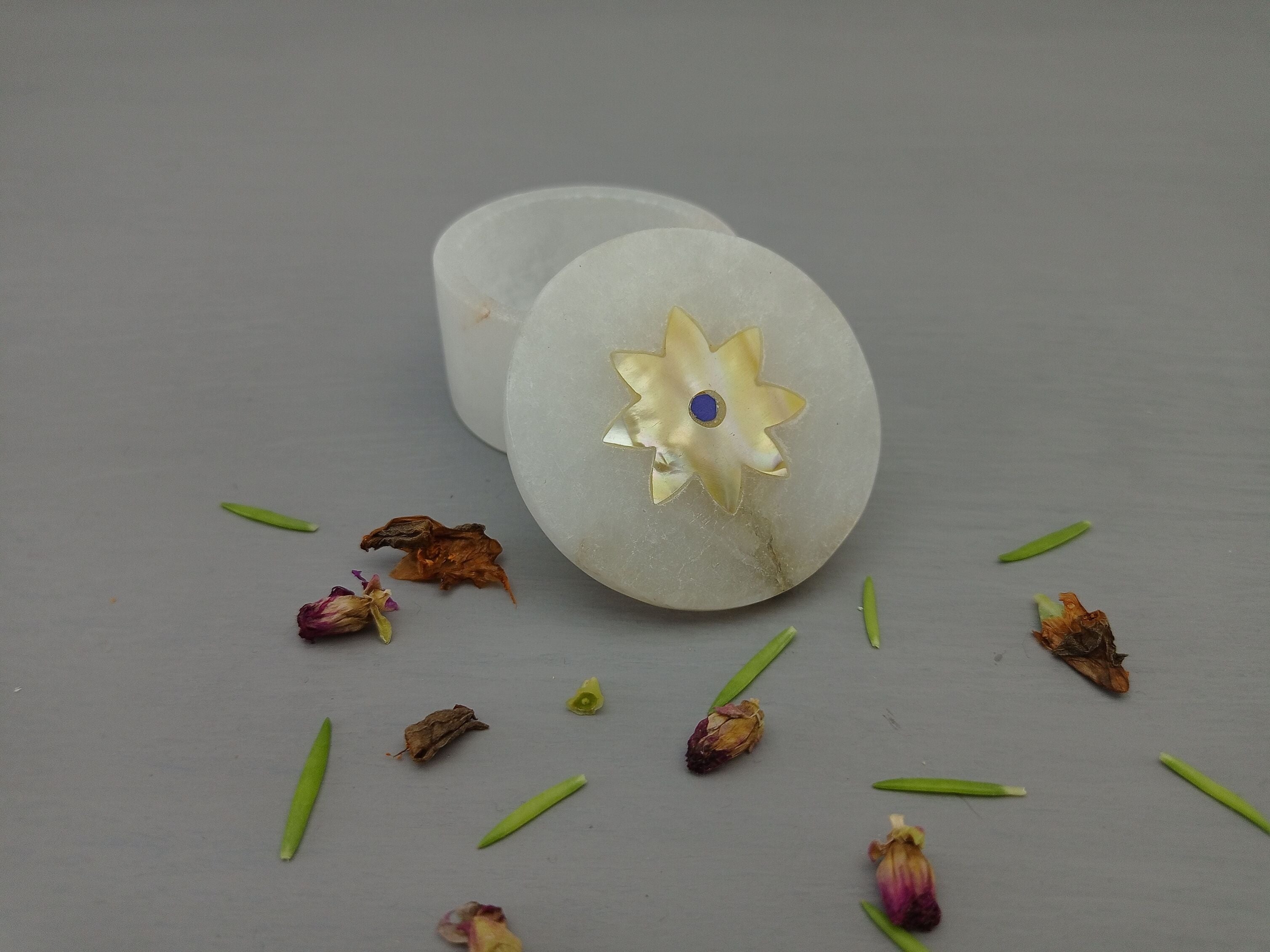Featuring a beautiful Alabaster stone jewellery box in Mop and lapis crafted by the hardworking artisans of Agra. The inlay work on the product, with hues of Mop and lapis gives it an elegant feel. Not only can this piece be used for storing jewellery but can also be used to insert little knick-knacks or as a decorative item; a perfect gifting item for weddings or special occasions!