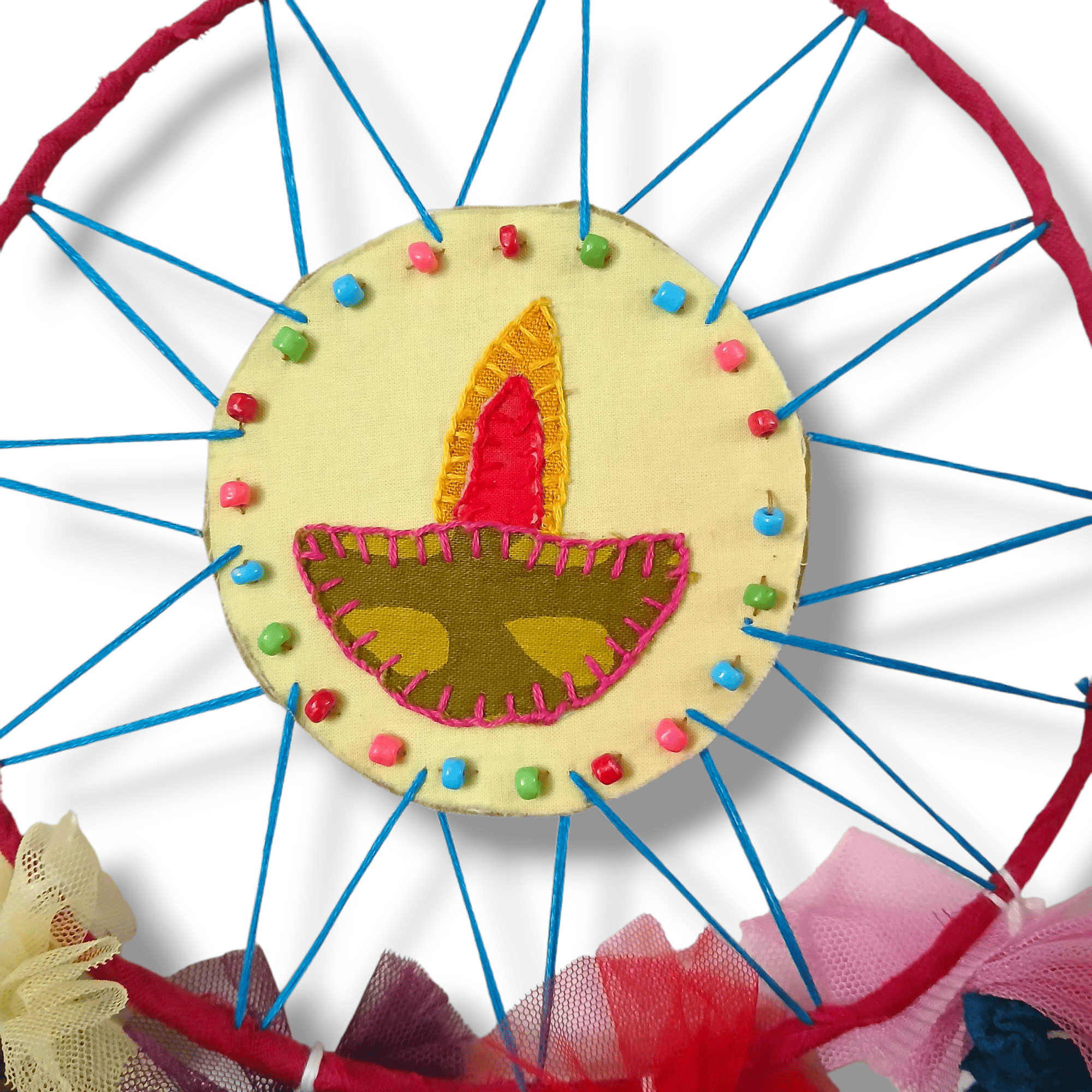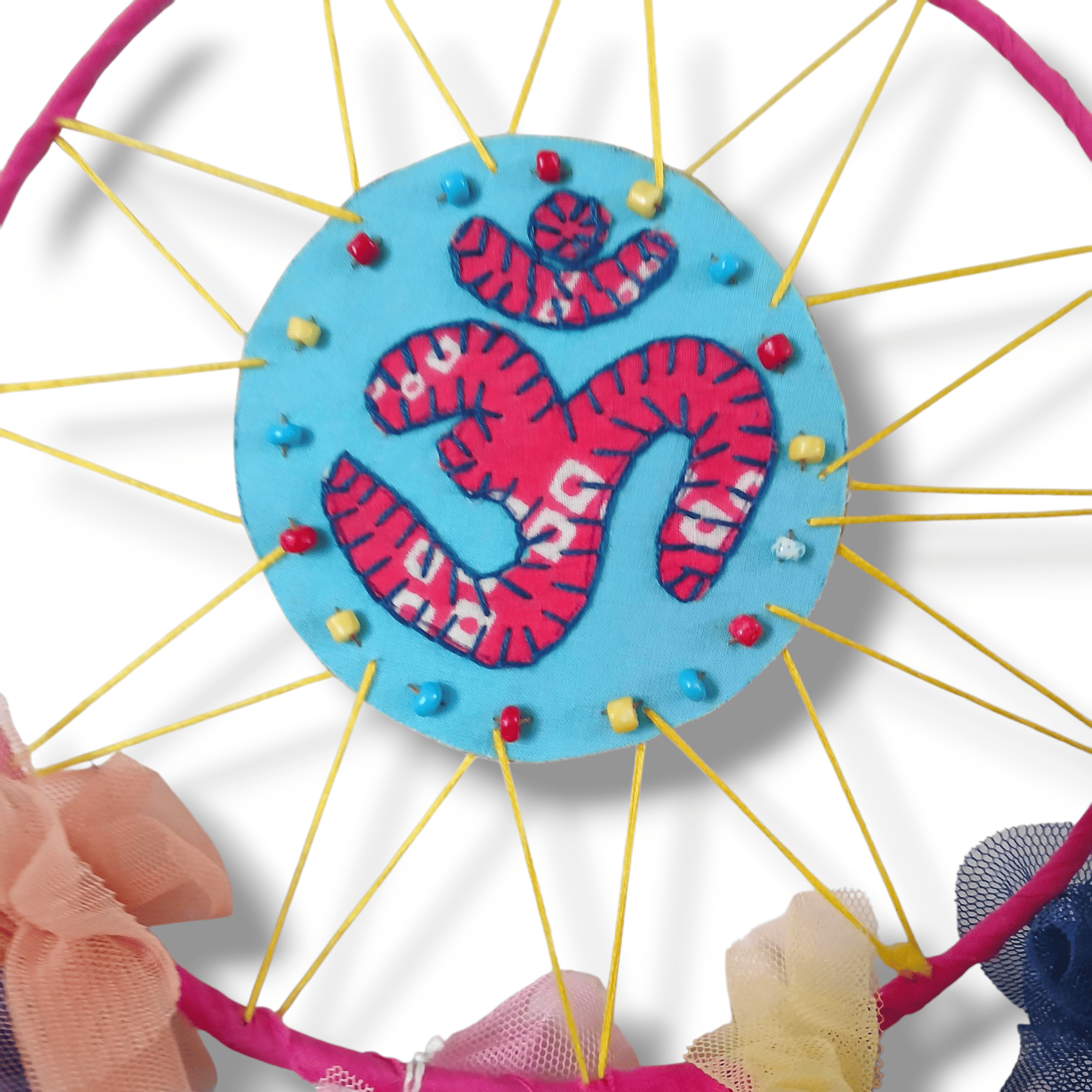 Introducing our Upcycled Om Diya Dreamcatchers, the perfect choice for eco-conscious celebrations. Handcrafted with captivating motifs appliqué with blanket stitch embroidery, these sustainable and reusable decorations add a whimsical touch to your festivities. This Dreamcatcher not only add a festive touch to your Festive decorations but also offers a sustainable and reusable alternative to balloons, all while being completely plastic-free.