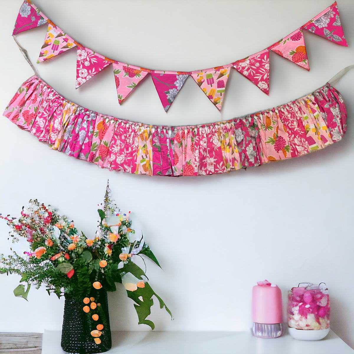 Pink Banner Bunting: Elegantly Festive The Pink Banner Bunting in this combo is designed to add a layer of sophistication and fun to your party décor. Each flag radiates a soft, welcoming glow of pink, creating an atmosphere that’s both uplifting and serene. String it across any area to instantly brighten the mood and add a festive flair.