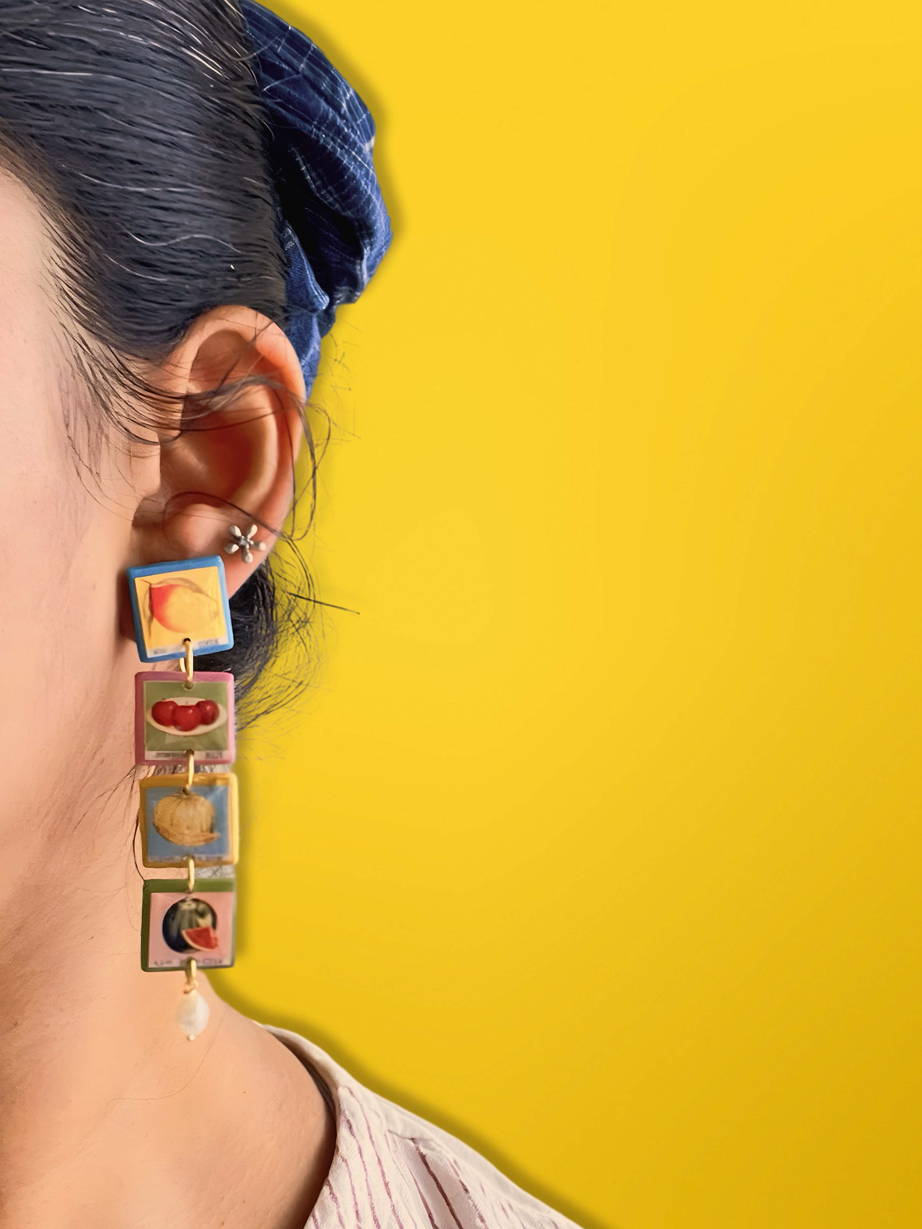 Fast forward to now: These mismatched studs capture all that delightful primary school chaos - but make it chic! Handcrafted with polymer clay, sealed in glossy resin, and finished with 18K gold-plated brass and genuine freshwater pearls.