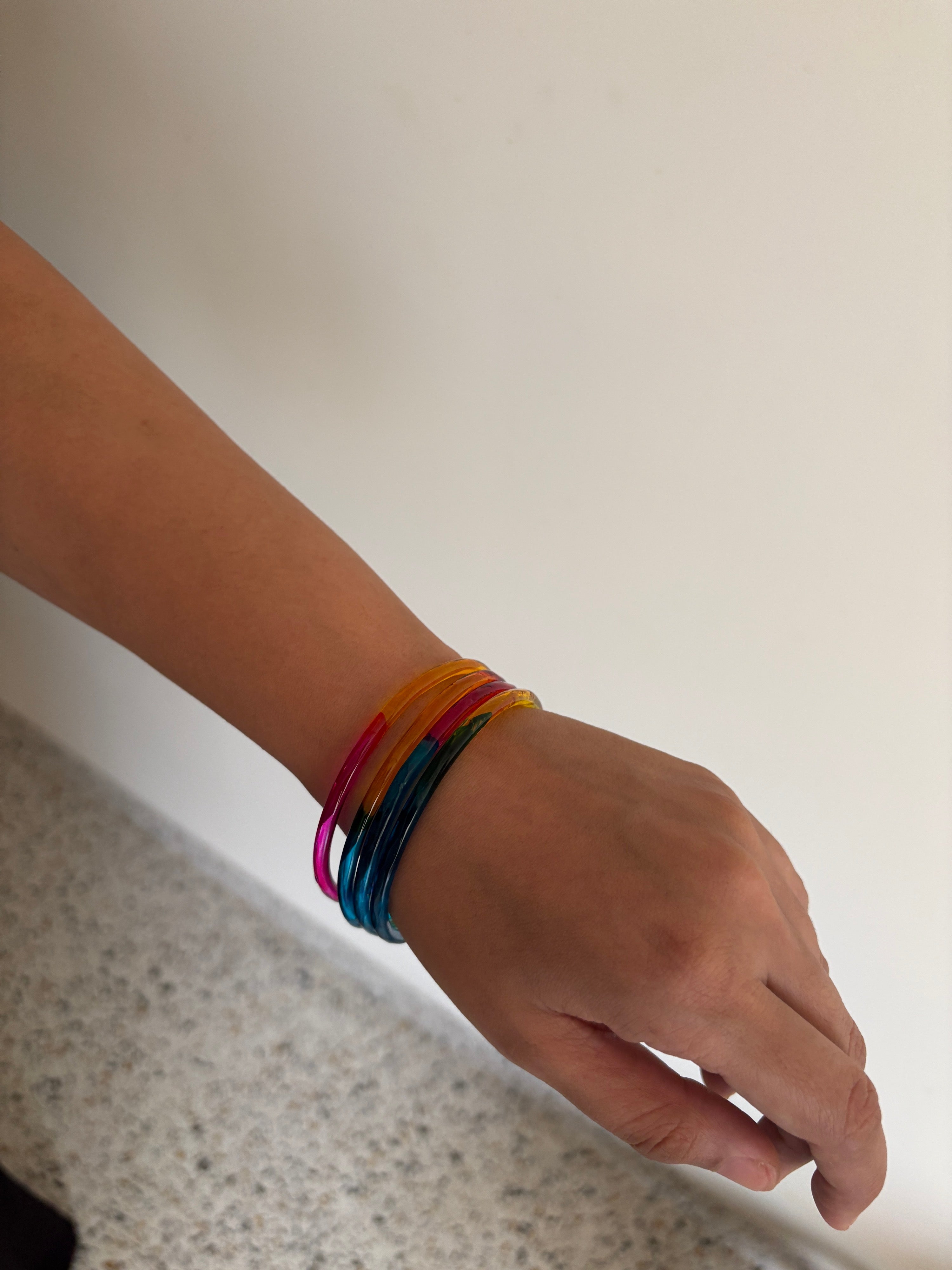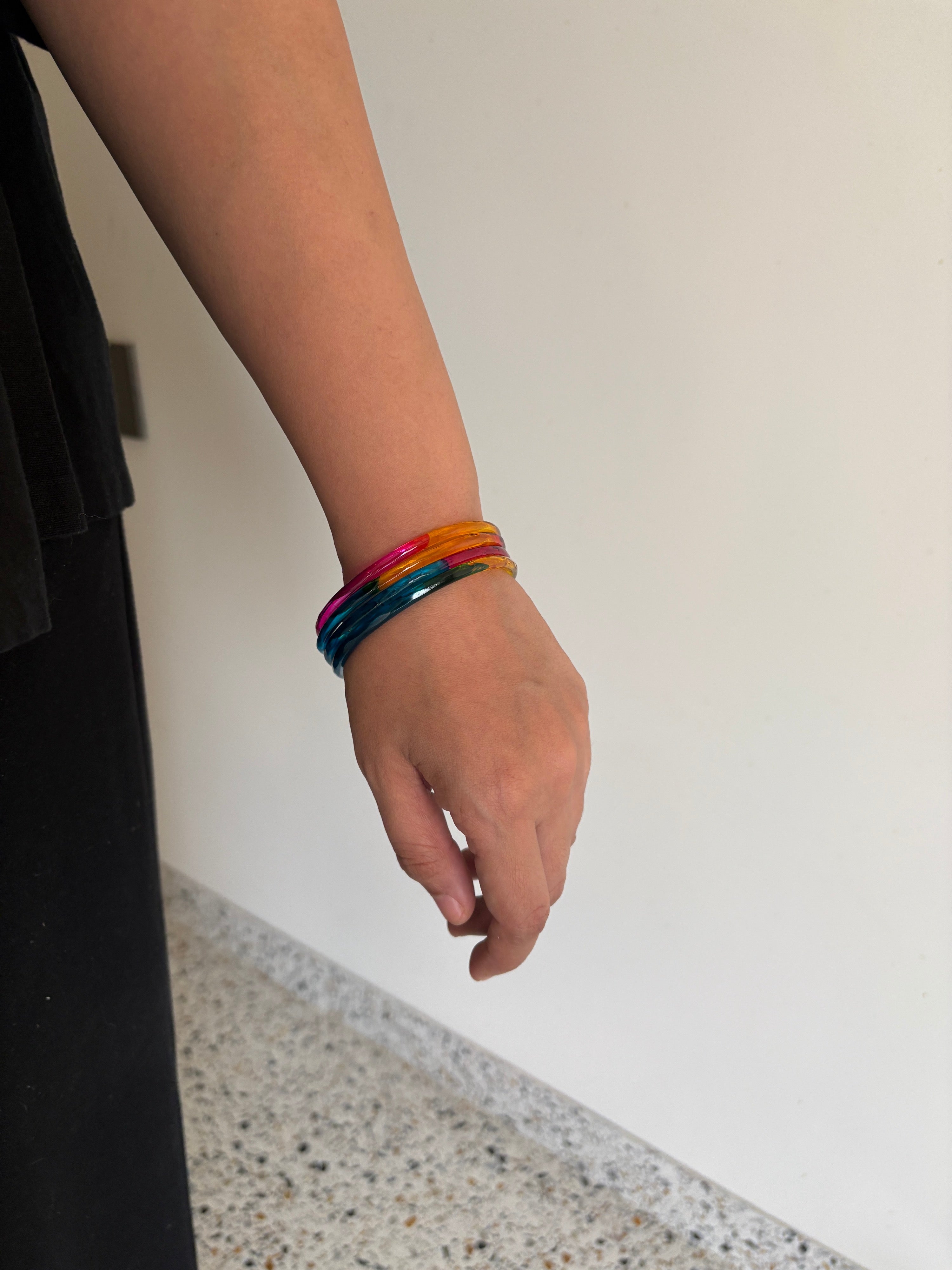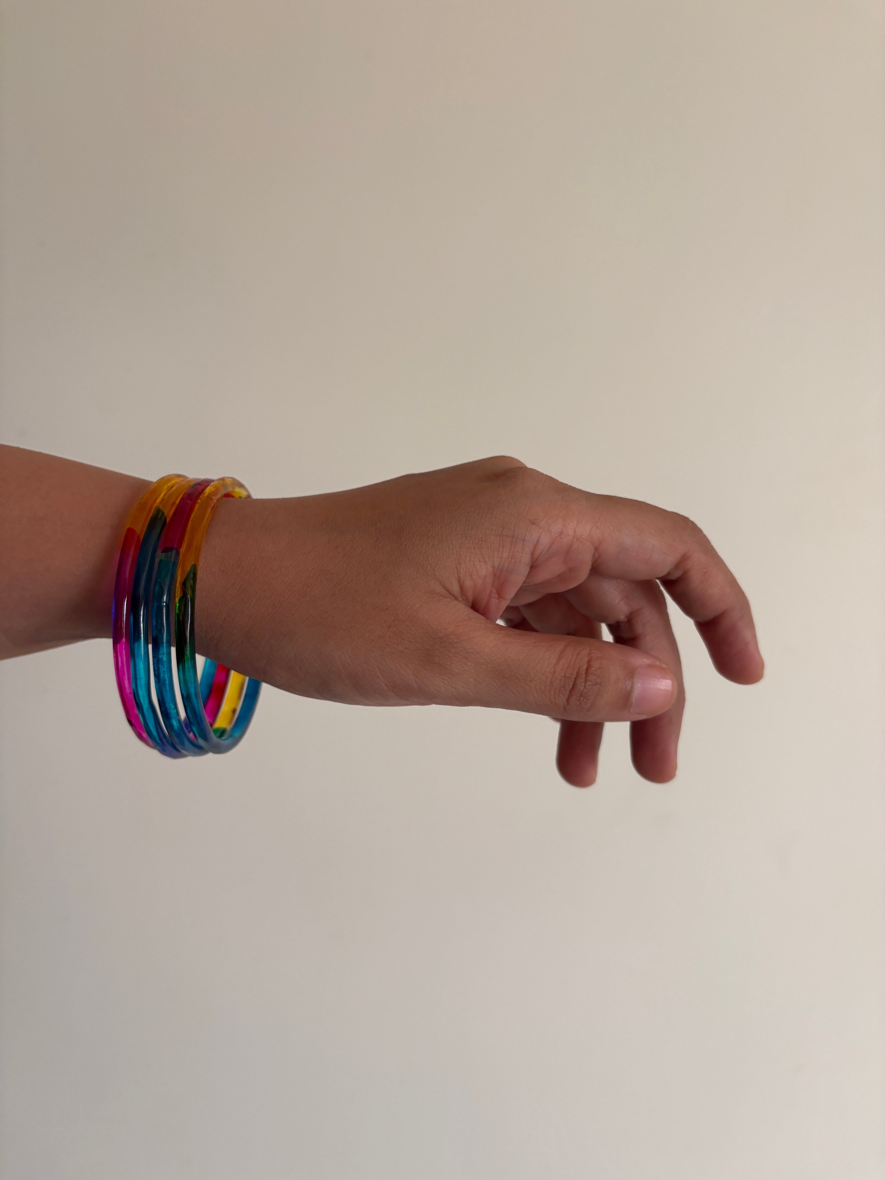 The Rangoli Bangles are handcrafted to bring a burst of multicolour charm. Their smooth, reflective finish catches the light beautifully, giving them a glassy, statement-worthy appeal. Effortless and versatile to be paired in a stack or worn by themselves.