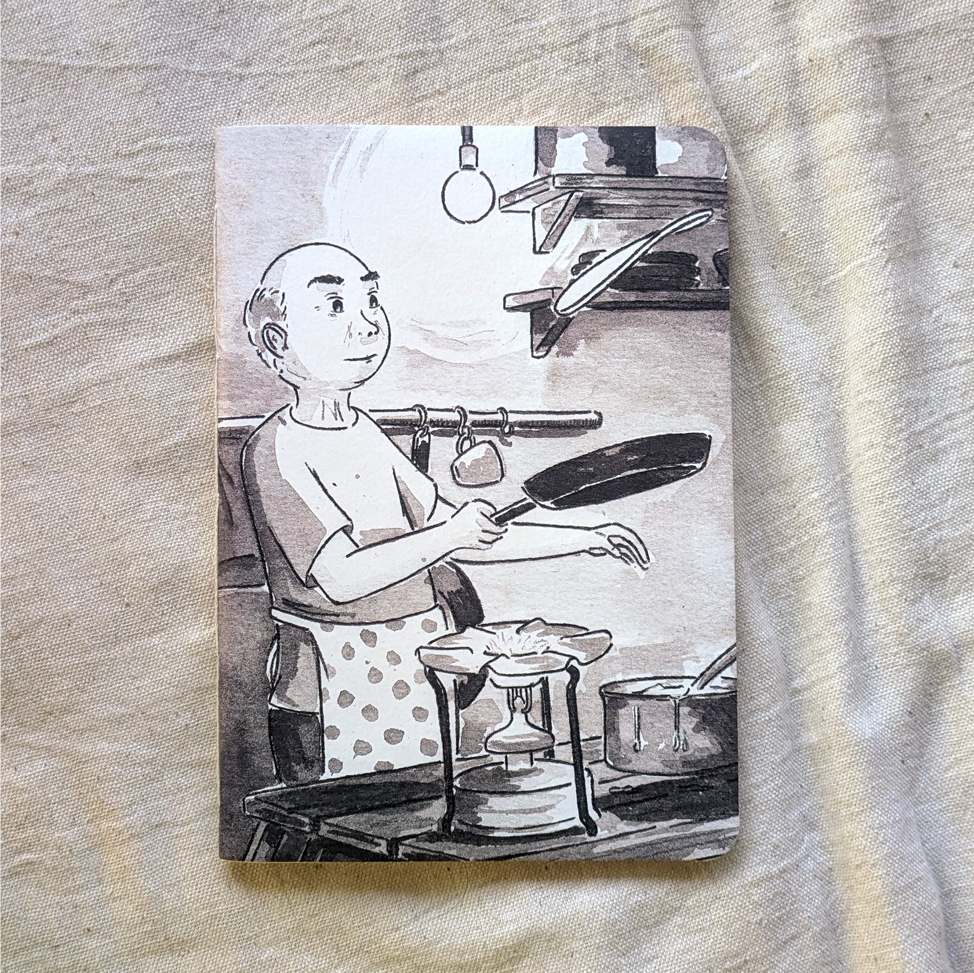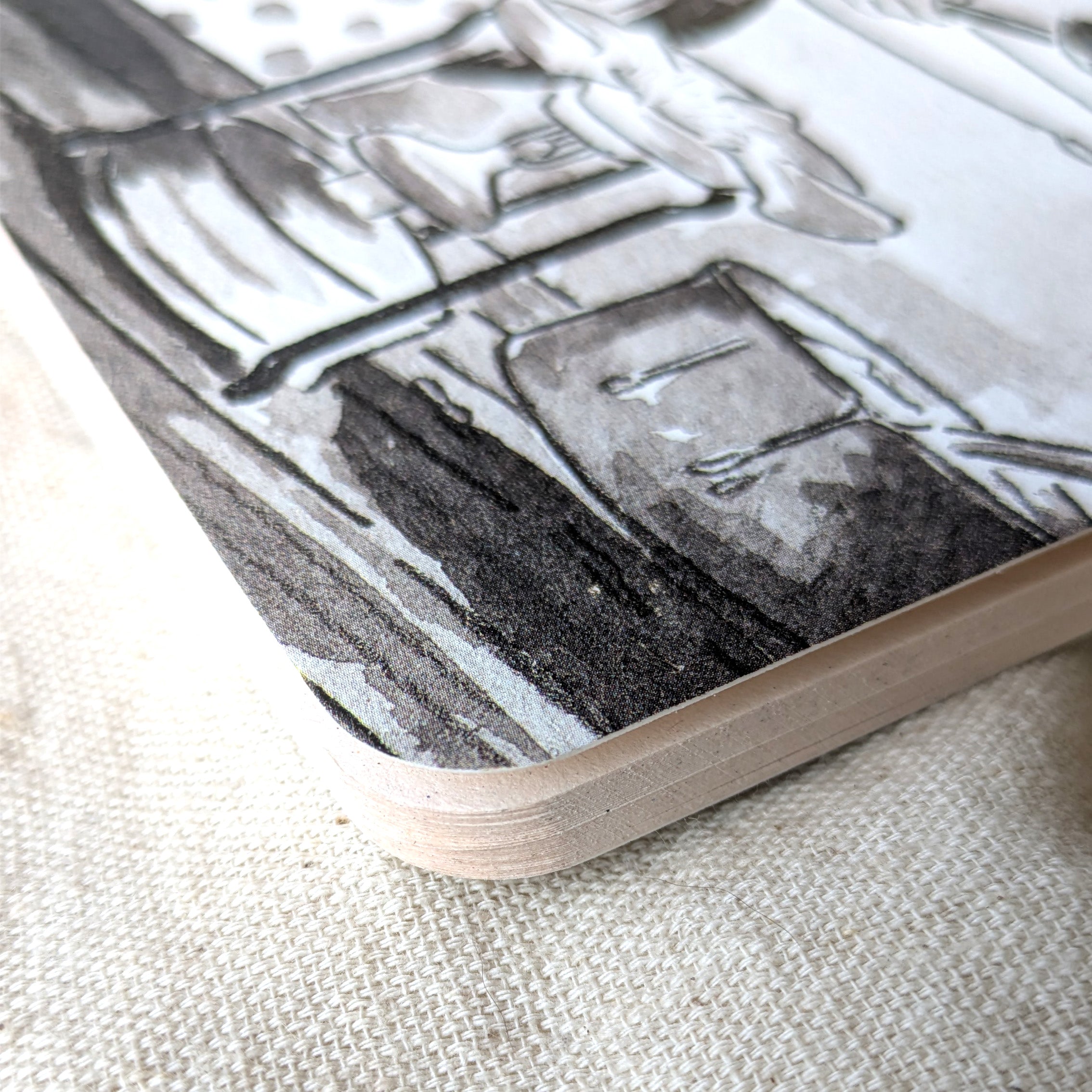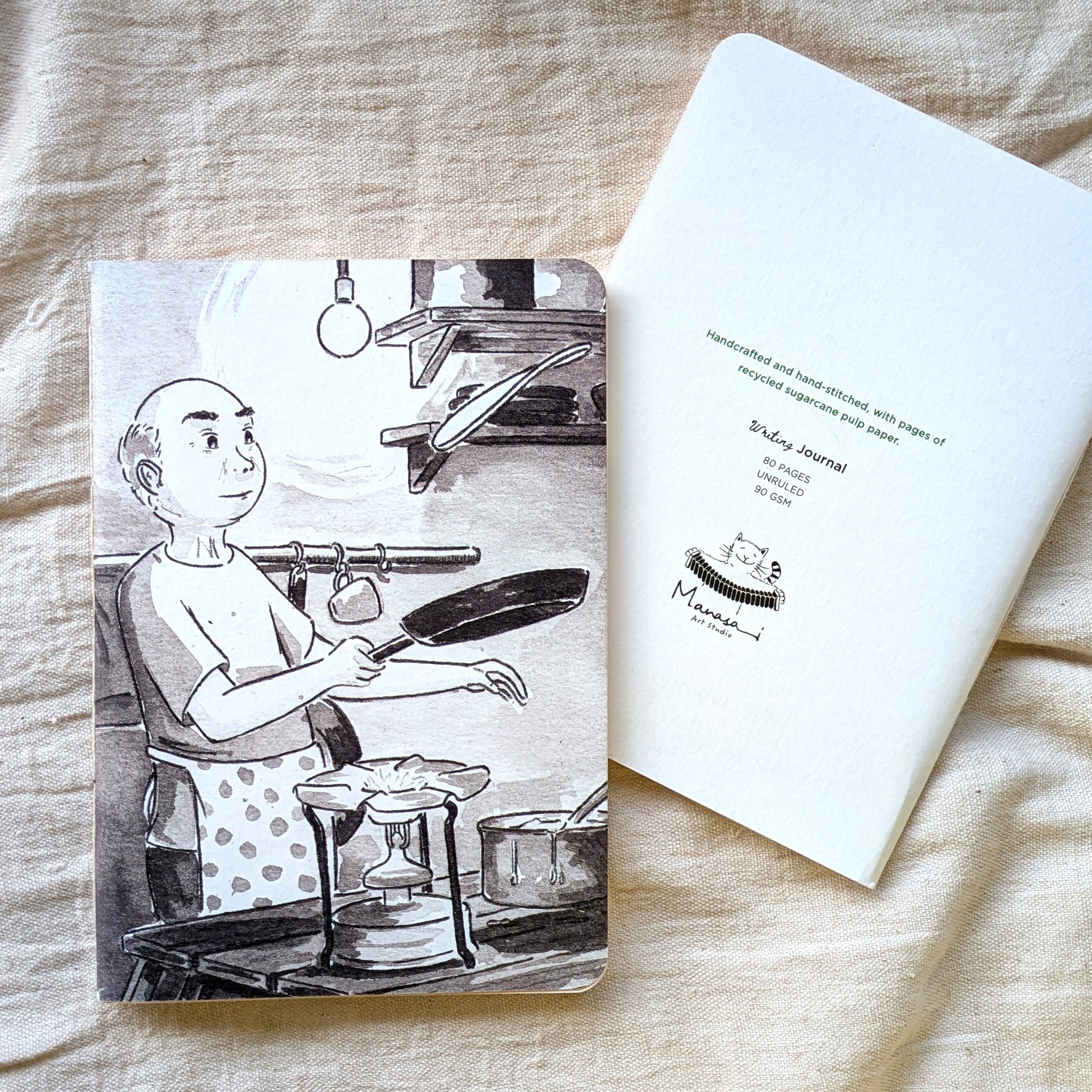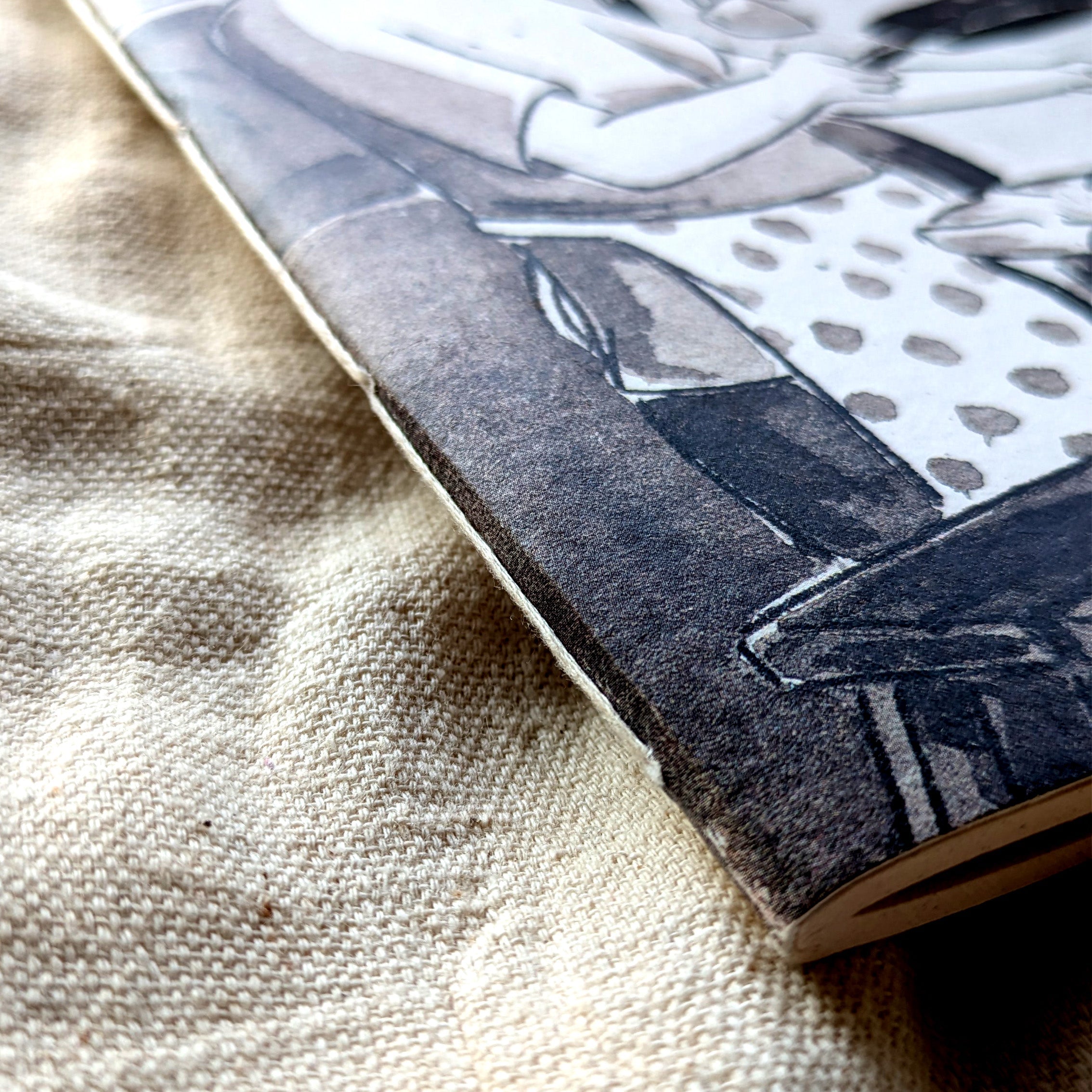 A5 hand-stitched notebook with an ink illustration printed on the cover.