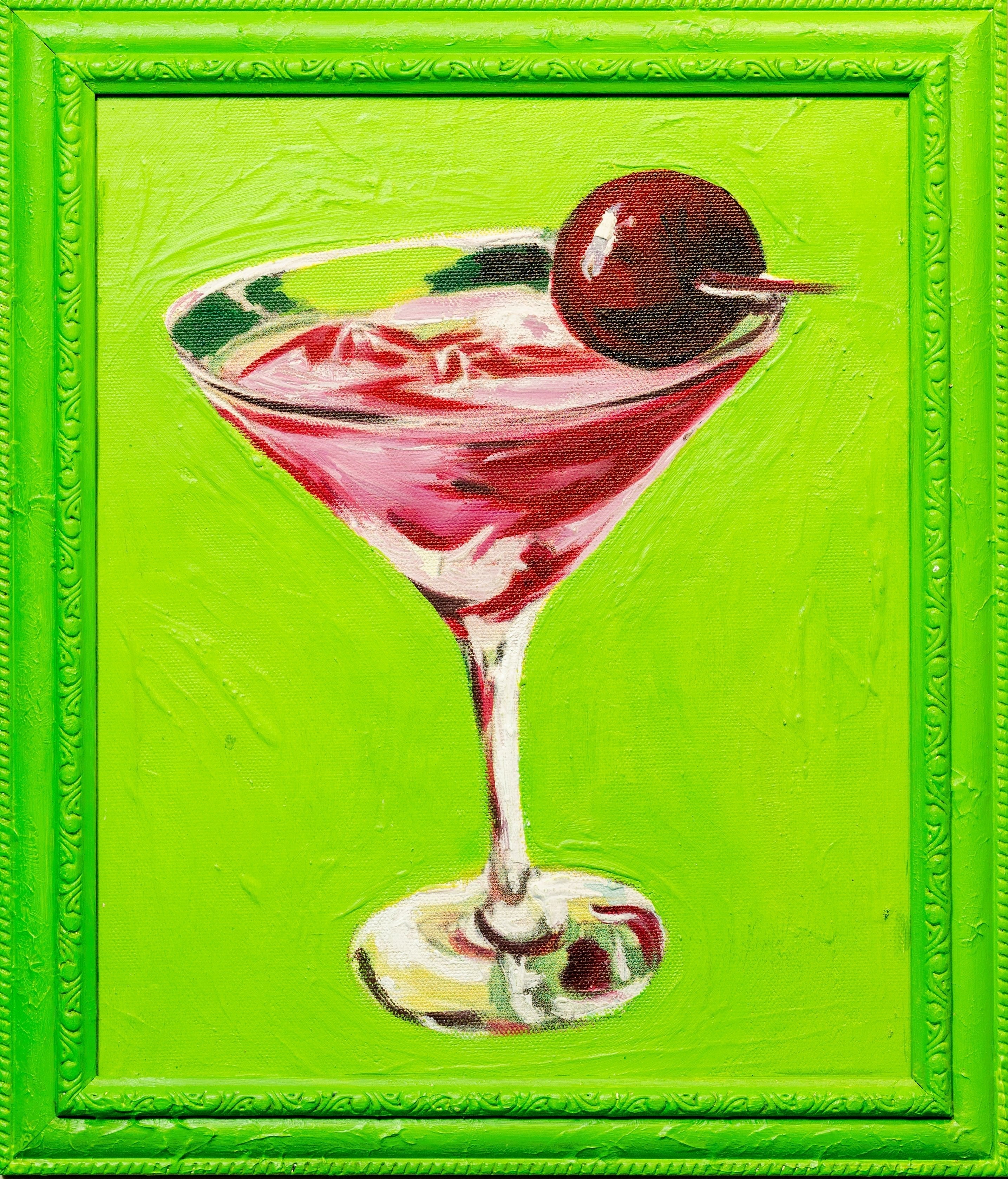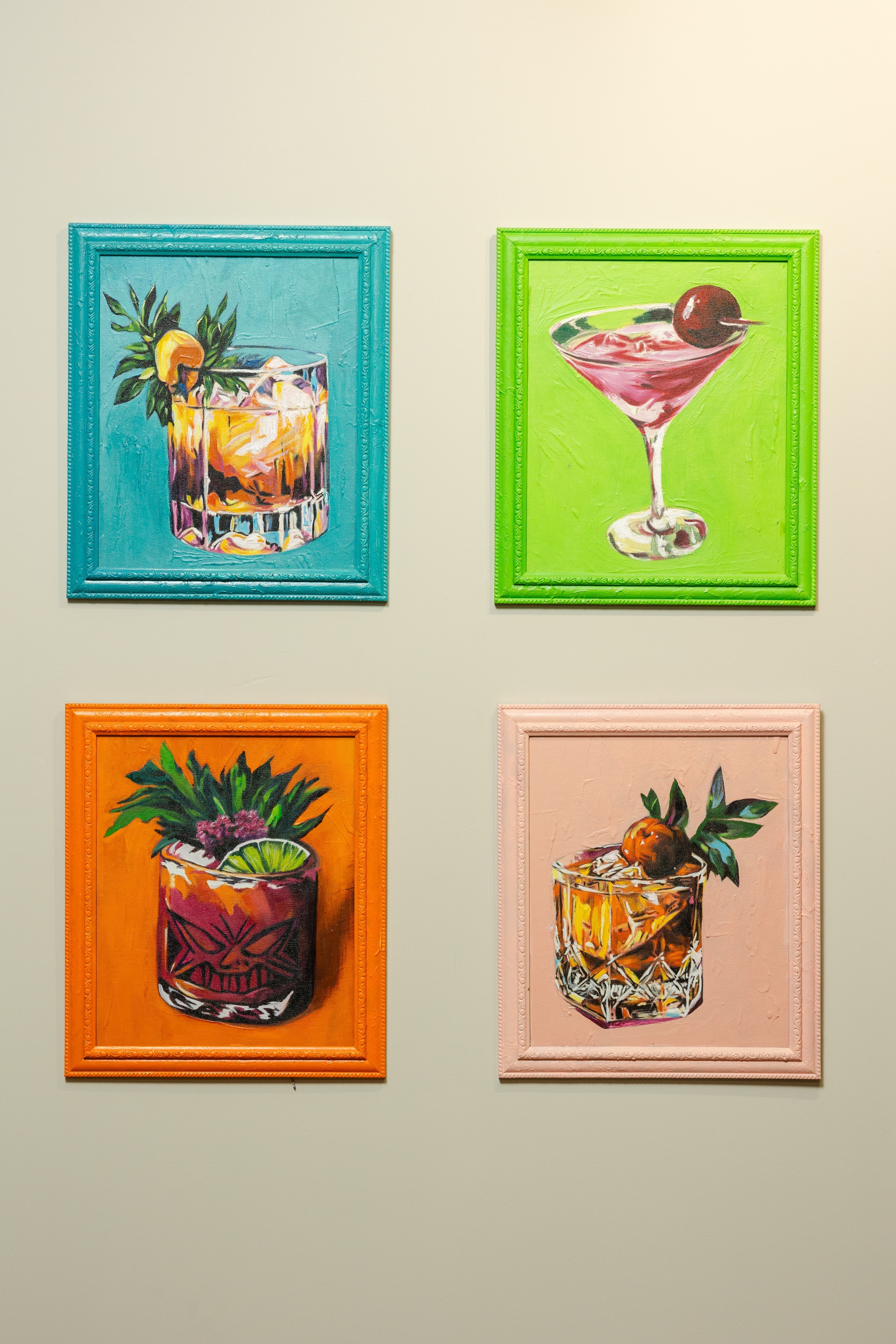 The paintings have a bold and expressive style, featuring thick, textured brushstrokes that give a rich, almost impasto effect. The use of vibrant, contrasting colors and abstract backgrounds enhances the depth and energy of each composition. The structured yet slightly loose rendering of glass, ice, and garnishes adds a dynamic and contemporary touch to the classic still-life genre.
