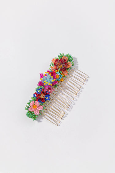 This hairpin features delicate beaded flowers nestled among tiny green grass accents, each element selected to mirror the beauty of a blossoming garden and add a touch of nature's charm to your hairstyle. Embrace the essence of the bloom as you enhance your look with this exquisite accessory. Let "Paradise" accompany you, imbuing your hair with a sense of natural beauty and timeless elegance. Each piece is made to order, handwoven with care and intention. Please allow 4 to 5 days for your piece to be crafted and shipped.