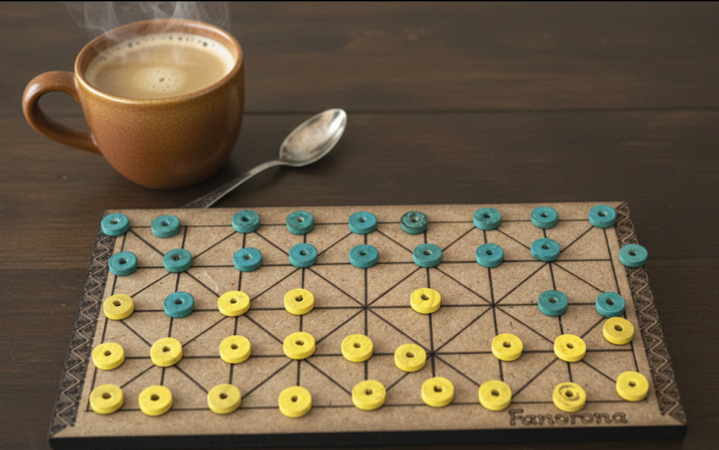 Fanorona is an ancient Malagasy strategy board game with roots tracing back centuries, played on a 5×9 board with 22 pieces per player. The game combines elements of checkers and chess, requiring players to capture opponent pieces through linear movement and strategic positioning. Pieces are removed either by approach (moving adjacent to an opponent's piece) or withdrawal (moving away after capture), creating dynamic tactical opportunities. This etched wooden version preserves the authentic gameplay while honoring the game's historical importance in Malagasy culture.