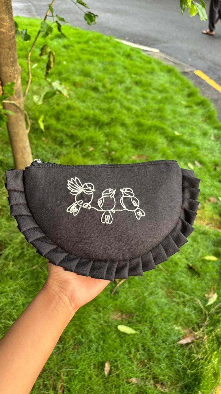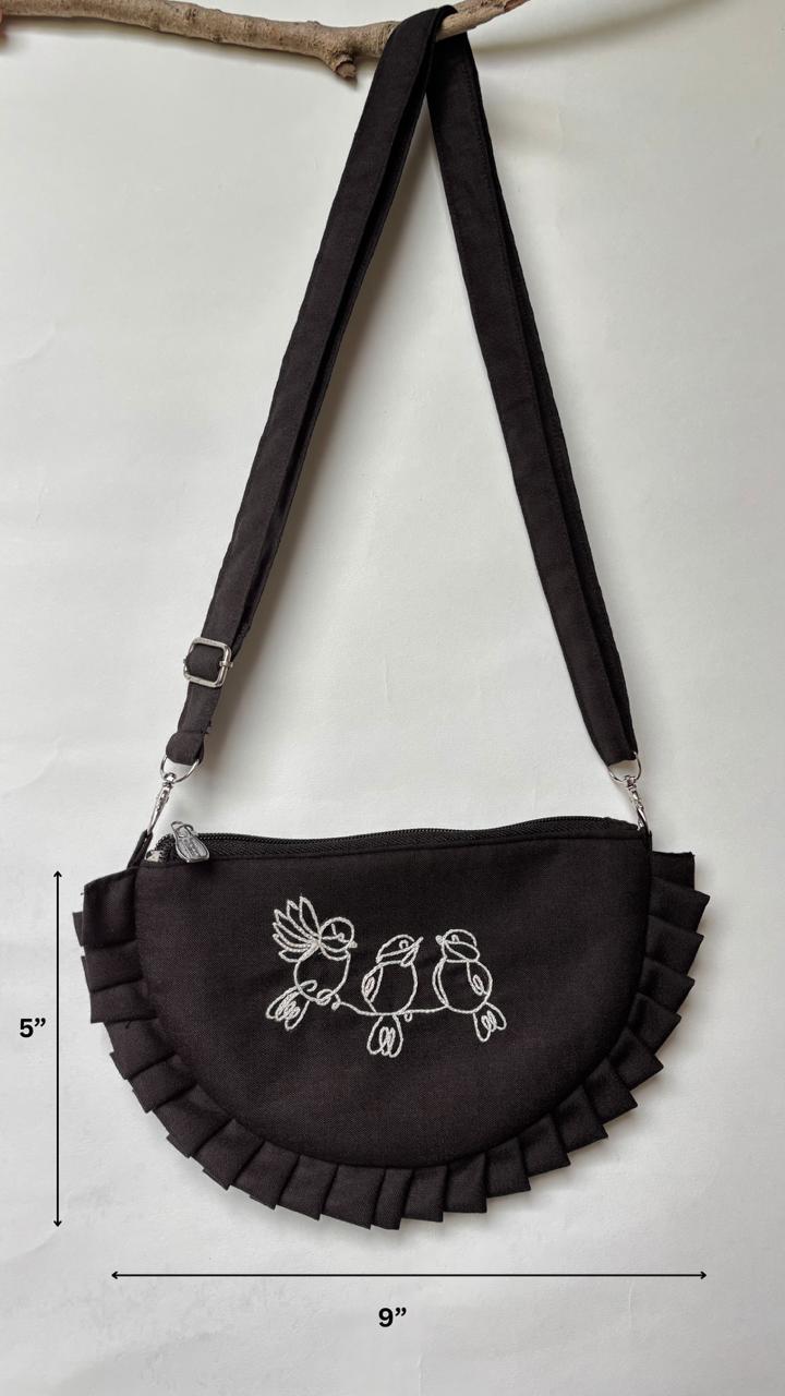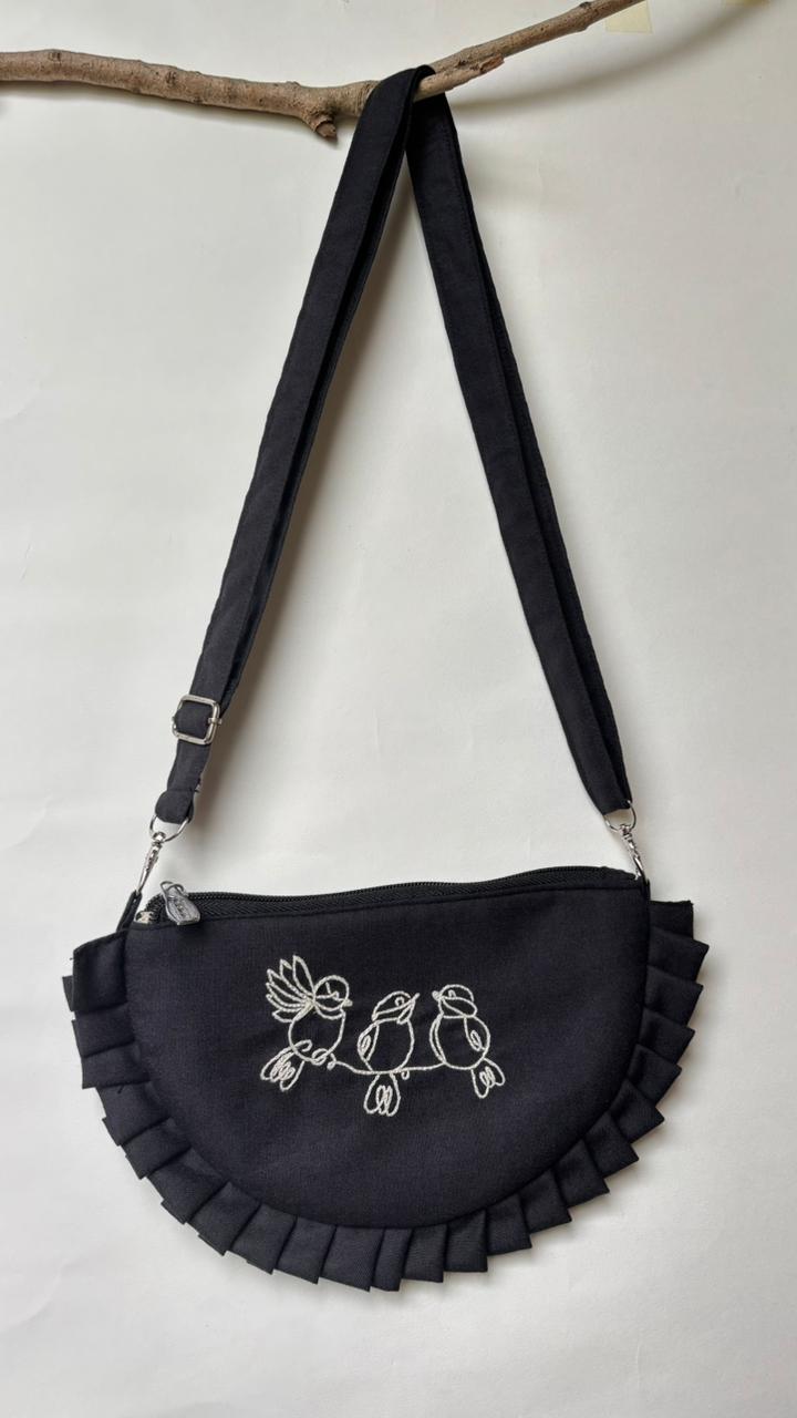Elevate your style with this exquisitely crafted hand-embroidered detachable sling bag cum pouch, a true blend of sophistication and artistry. Made from pure linen-cotton fabric, this piece showcases intricate embroidery featuring a delicate bird motif, celebrating timeless elegance in every stitch.