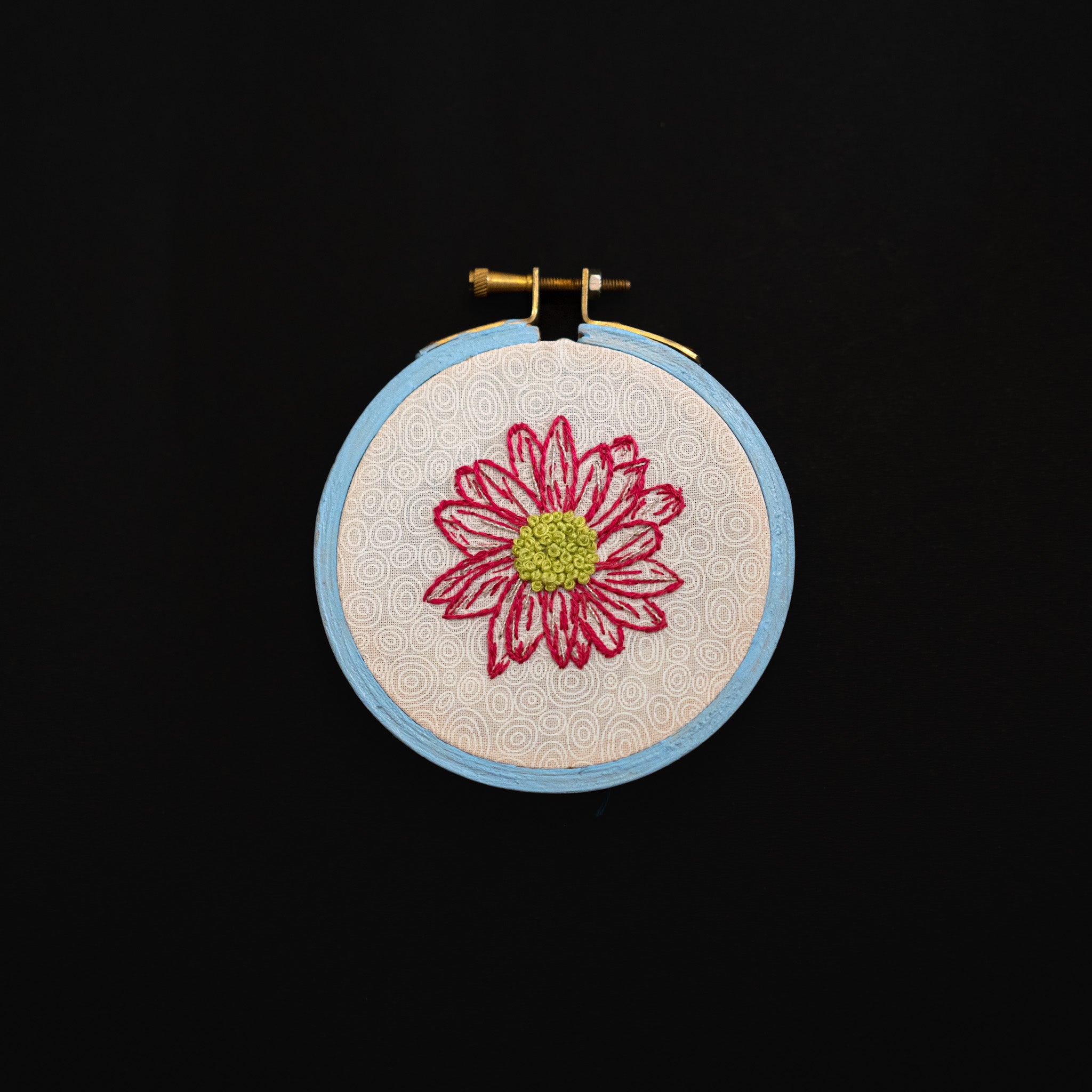 Brightly colored things in nature are mostly toxic but pretty nonetheless. A hand embroidered pink and lime green colored flower with a hint of silver, on a white textured background.